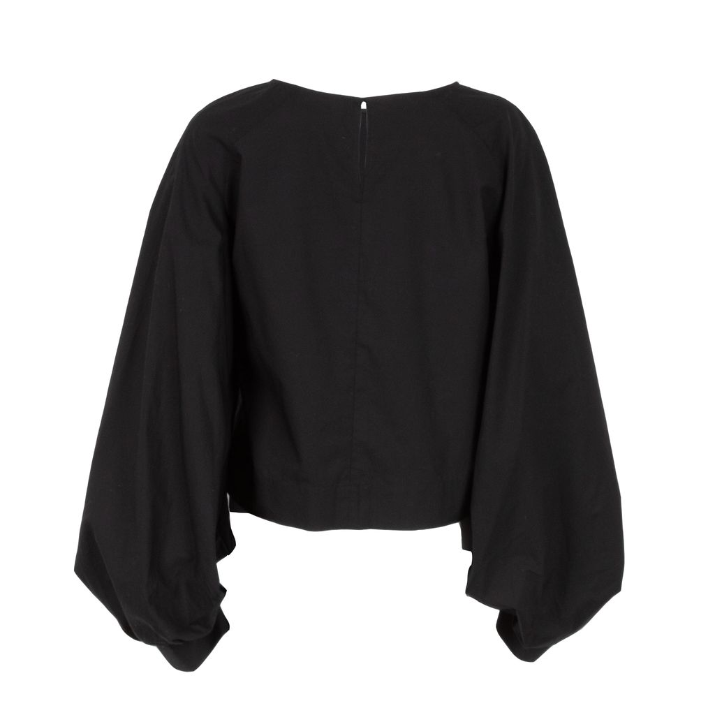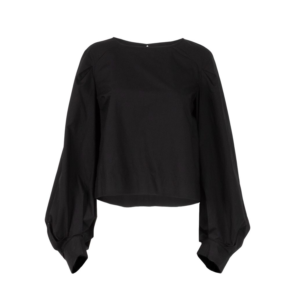 This top from Babaton is whimsical meets minimal design at its best. Features oversized boxy fit, boat shaped neck, balloon style sleeves with pleating at cuffs, and keyhole back detail with button closure.