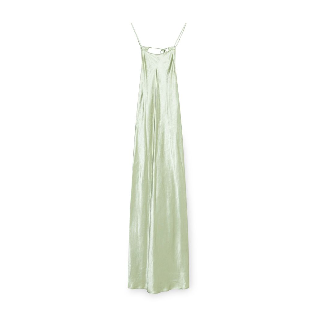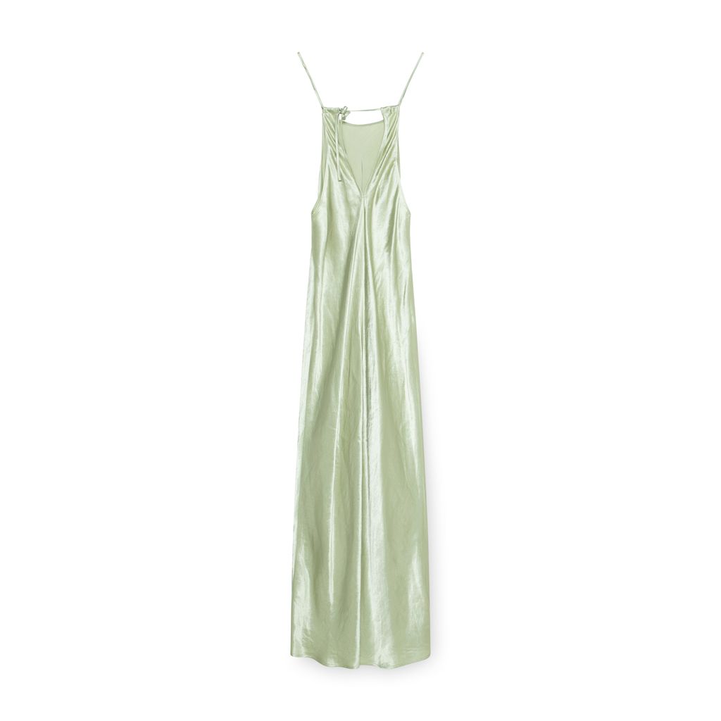 Babaton Lato Dress in Green features self tie halter neckline, bias cut, glassy Japanese silk-like fabric, and midi slip tank dress.