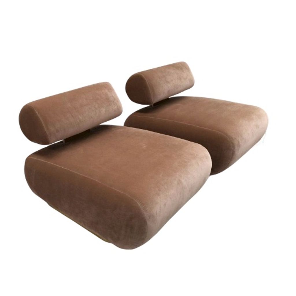 Baby Beluga sofa in velvet and polished brass. CONCEIVED WITH THE IDEA OF CREATING PIECES OF FURNITURE THAT APPEAR TO BE FLOATING WITH THE CLOUD-LIKE CHAIRS EXPLORING THE IDEA OF FURNITURE THAT ACQUIRE AN ANTHROPOMORPHIC QUALITY THAT ALLOWS THE OBSERVER TO DRAW ON REFERENCES FROM NATURE OR EVEN SCIENCE FICTION.