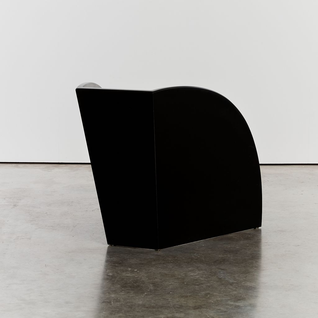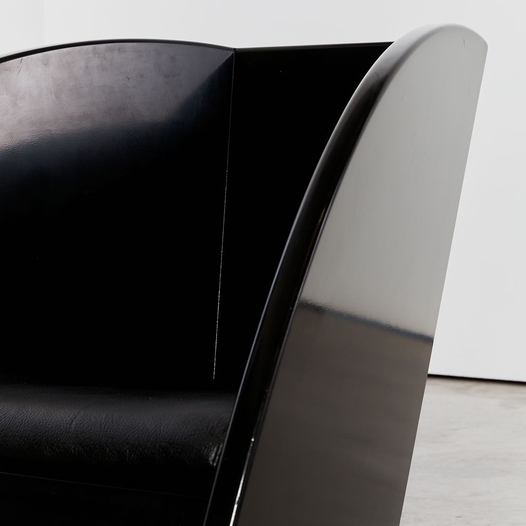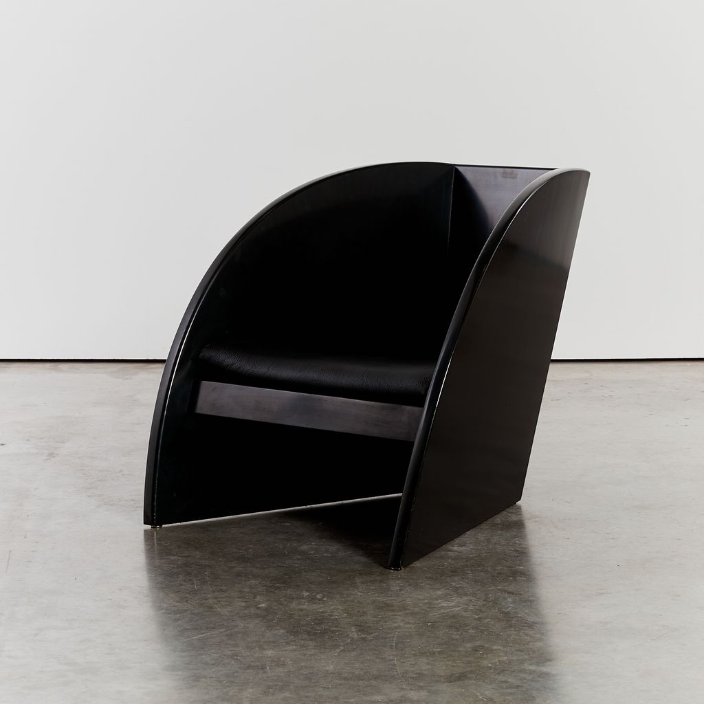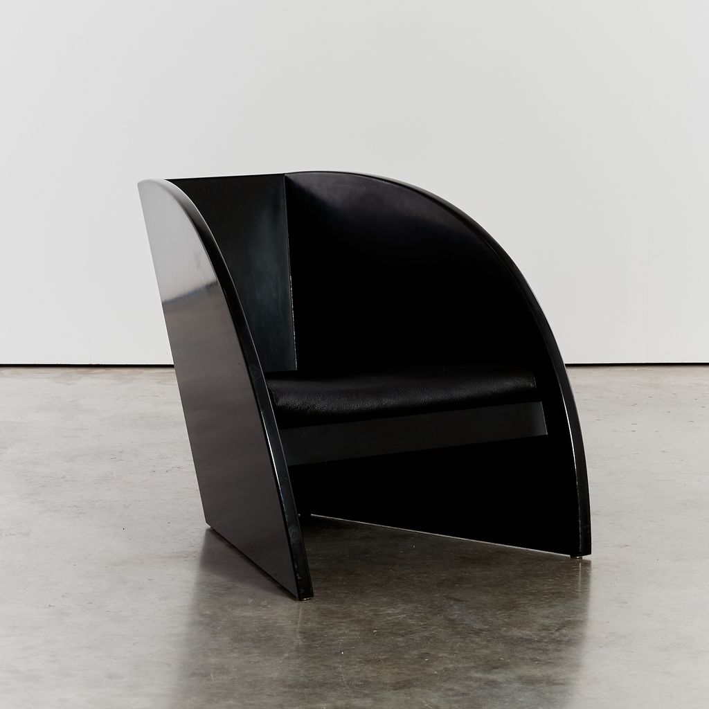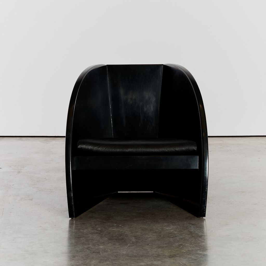 The angular Babylone armchair in black lacquer with leather seat cushion by Fabienne Arietti and Thierry Husson.