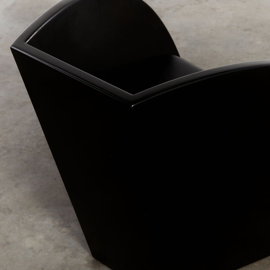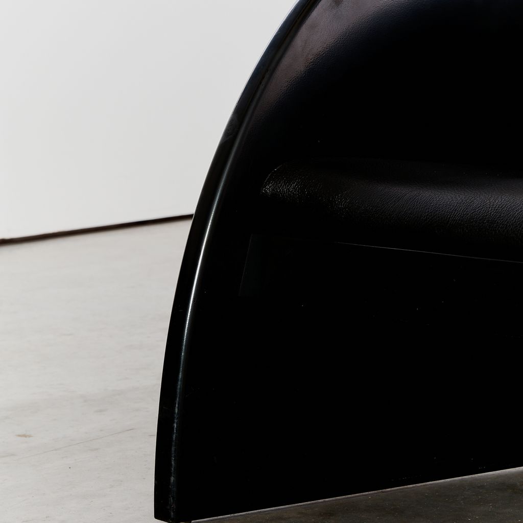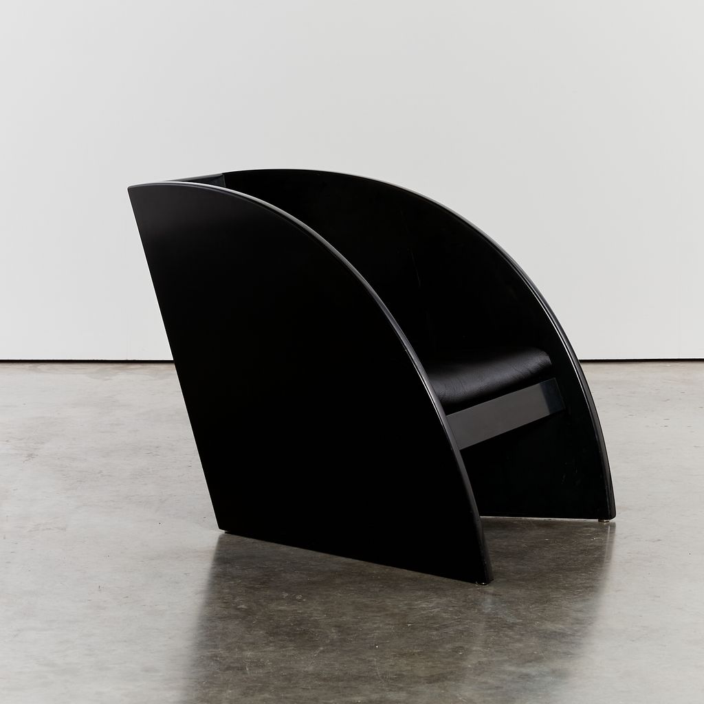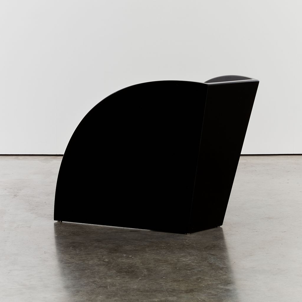 The angular Babylone armchair in black lacquer with leather seat cushion by Fabienne Arietti and Thierry Husson.