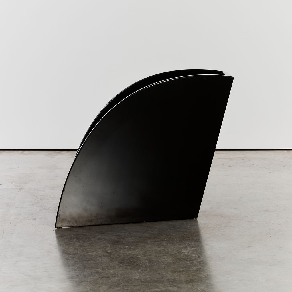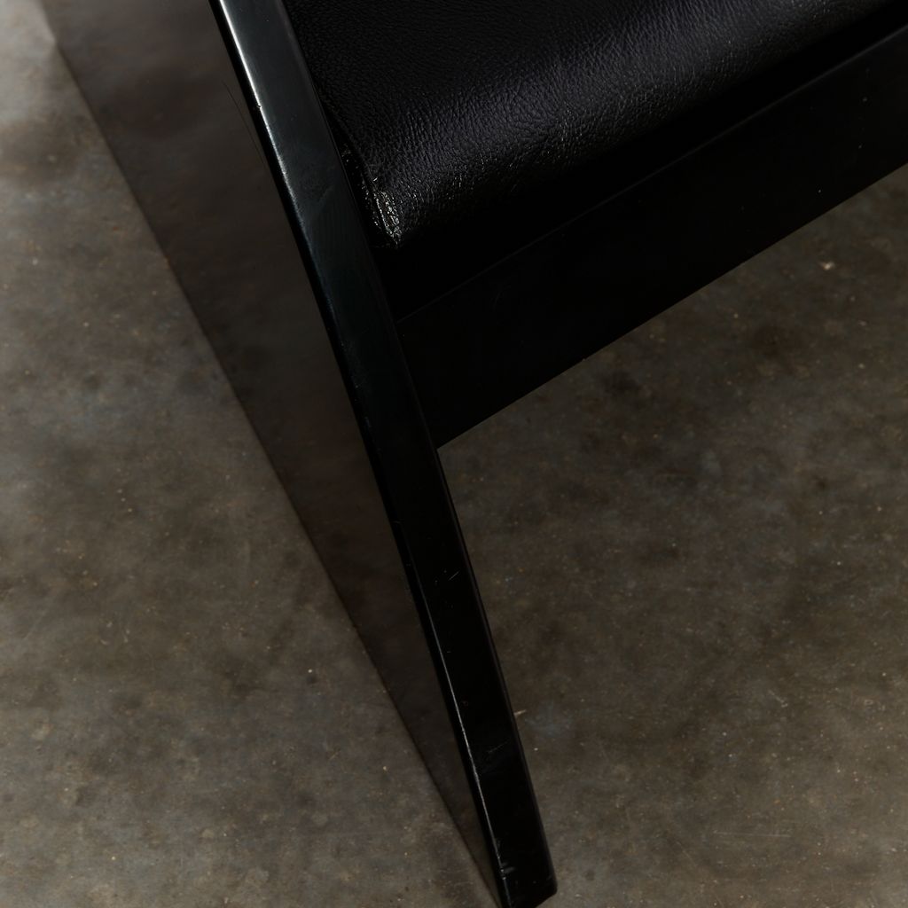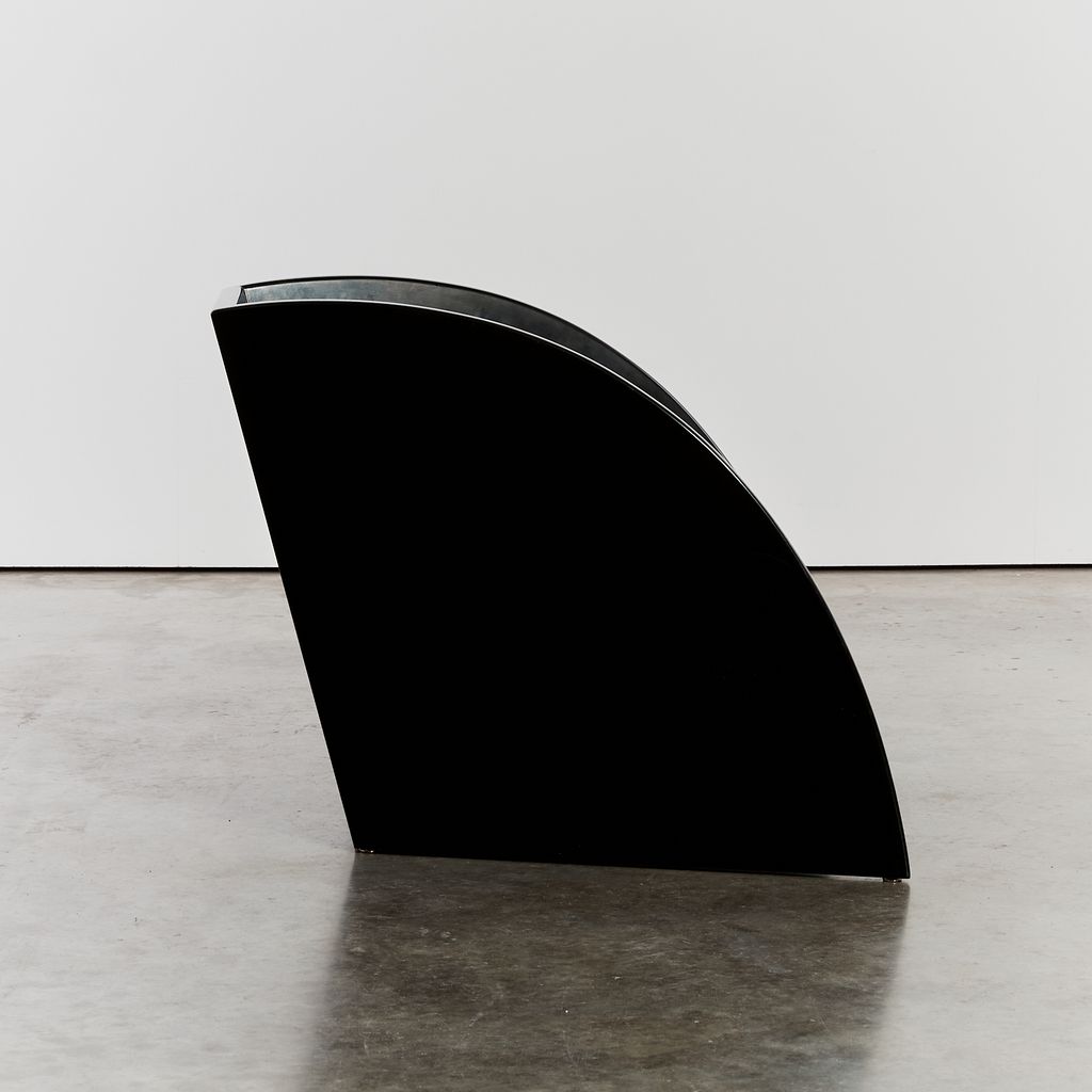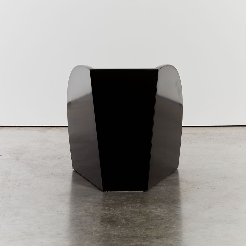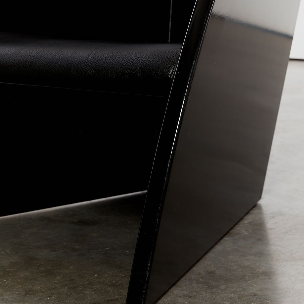 The angular Babylone armchair in black lacquer with leather seat cushion by Fabienne Arietti and Thierry Husson.