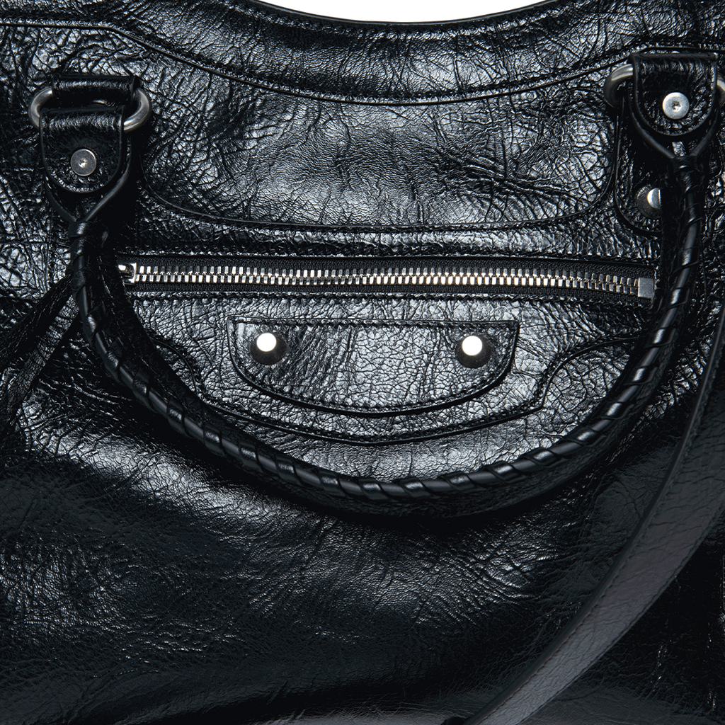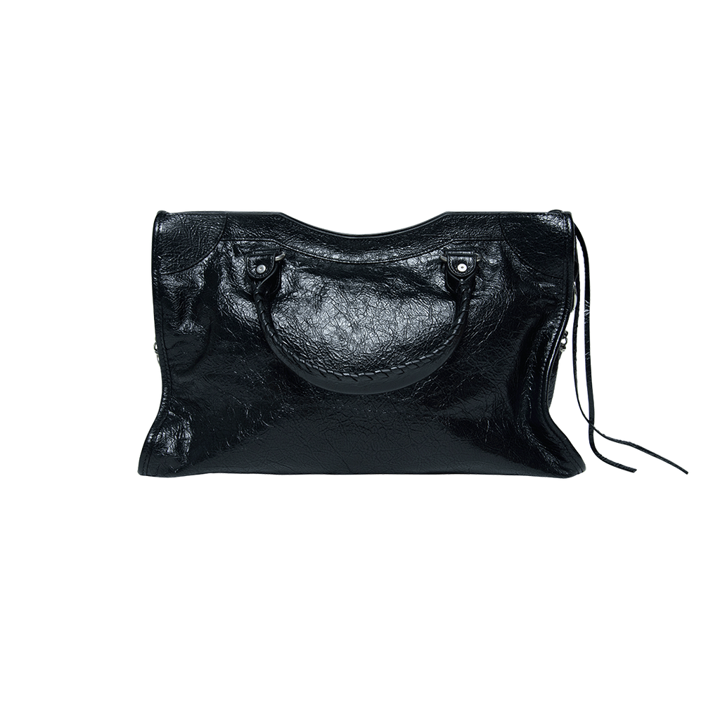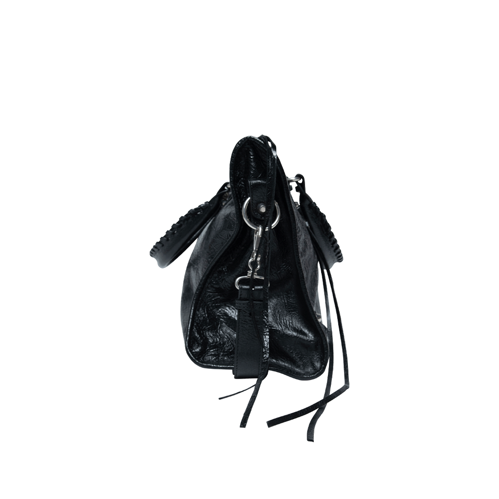 Balenciaga Black Leather Motocross Classic City Bag features top handles, adjustable crossbody strap, silver tone hardware, and zip closure at top.