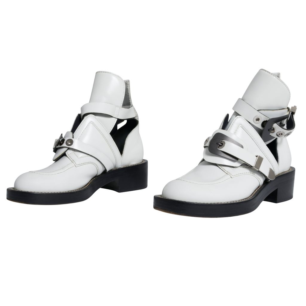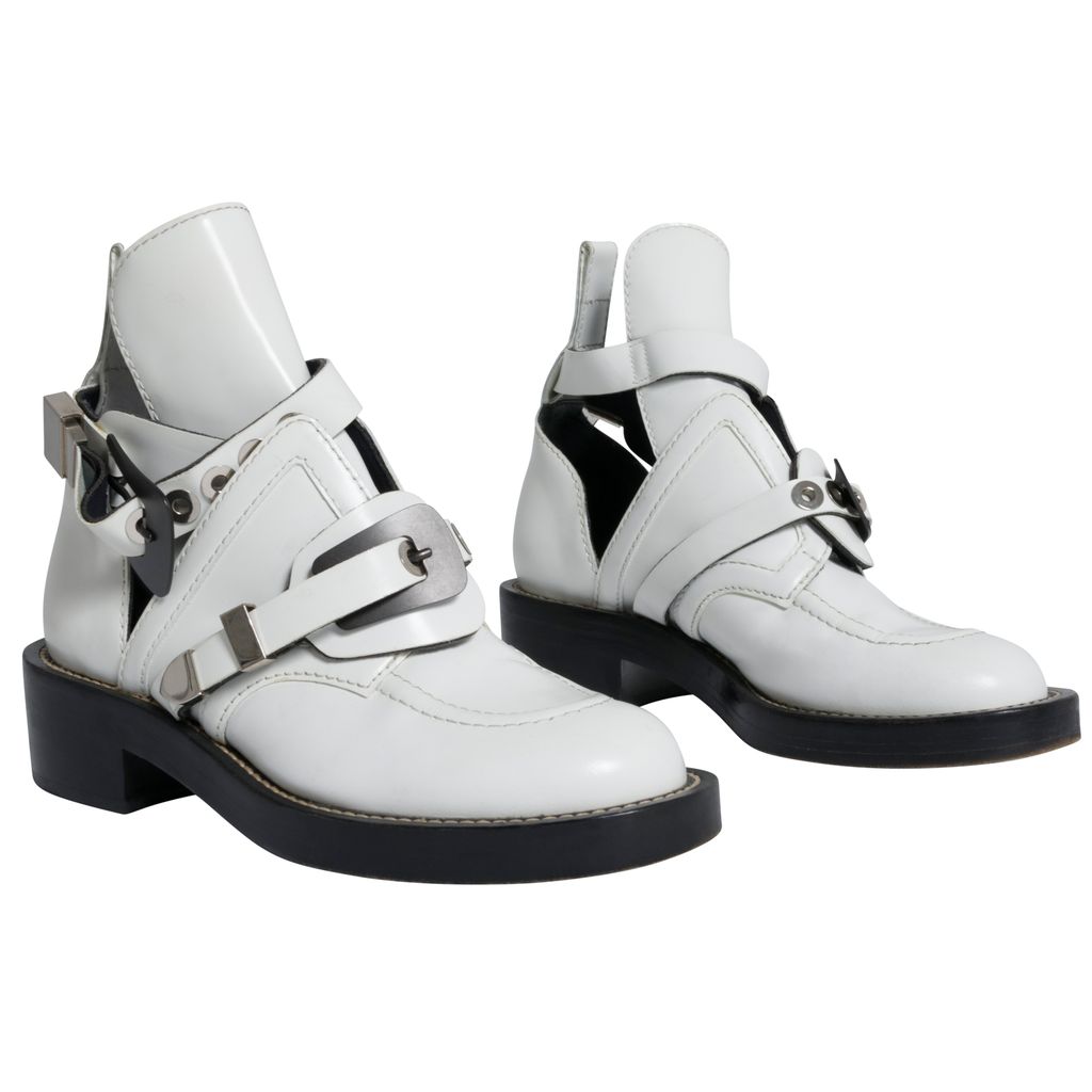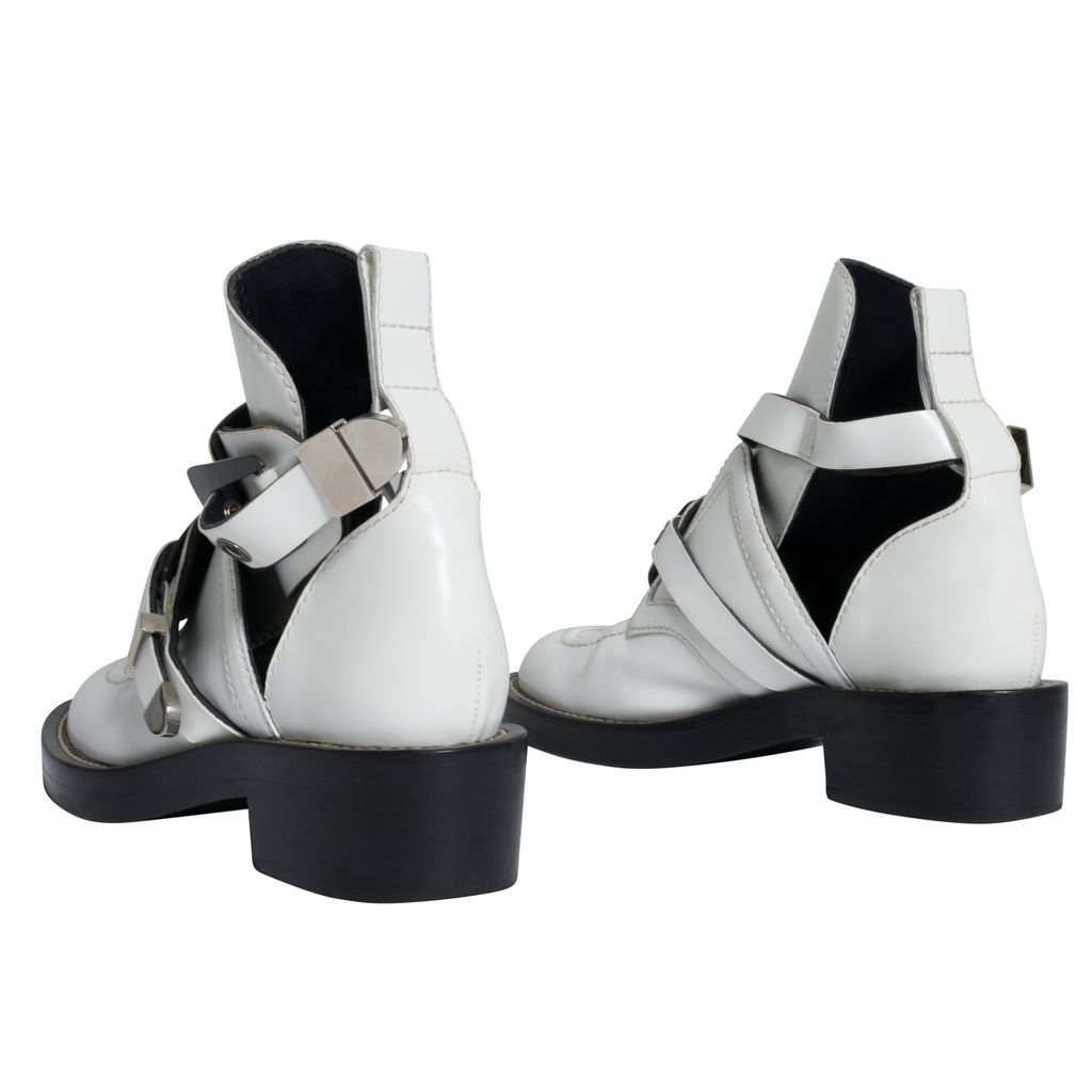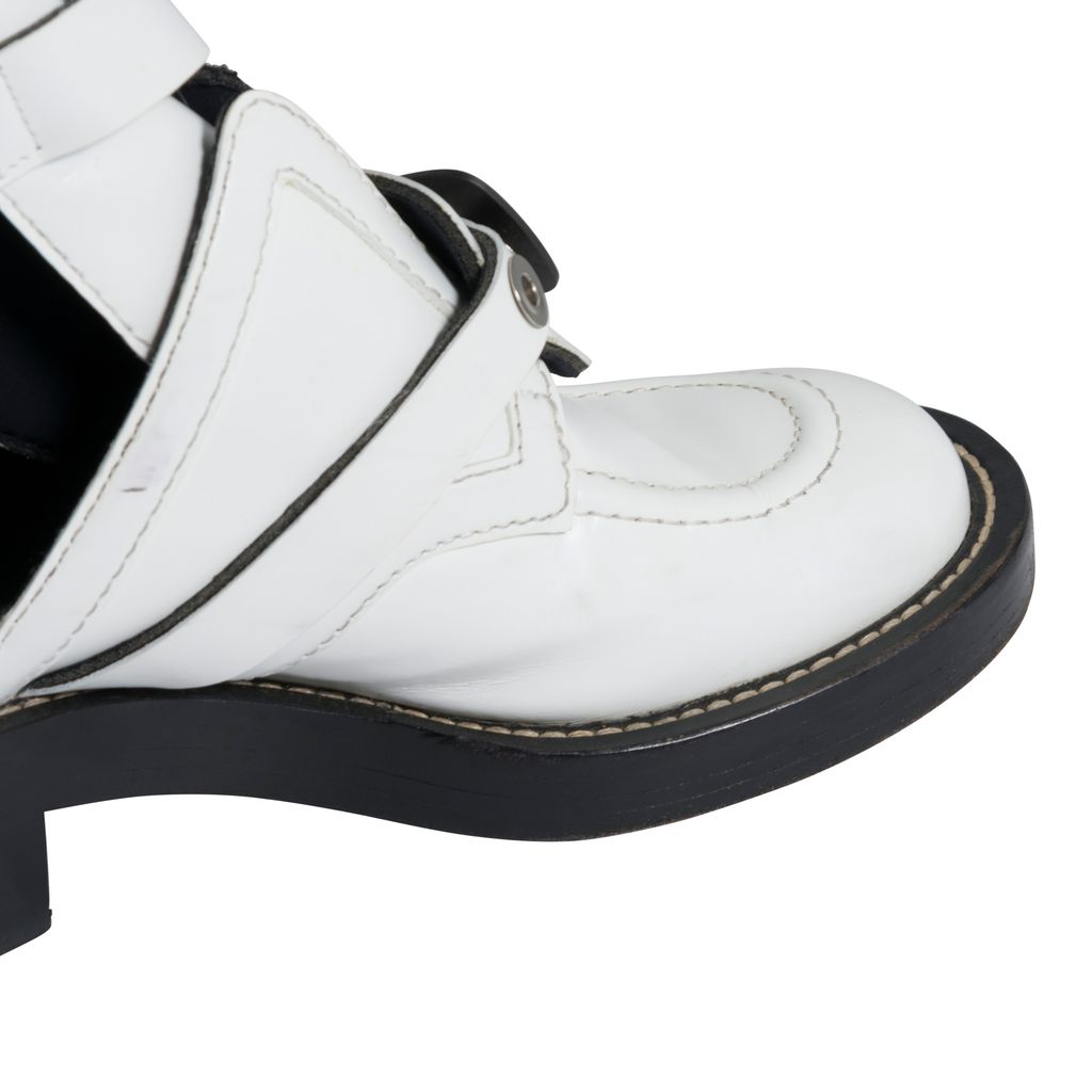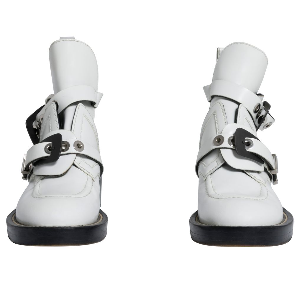 Inspired by the Spring-Summer '11 runway collection, these white leather boots from Balenciaga capture the punk spirit- featuring a round toe, stacked heel, open cut-out detail at the ankle, silver toned hardware, double buckles on the front and top of the ankle, back pull tabs, and black sole. Includes dust bag. In good condition. Minor scuffs on straps, toe, and sole. Minor creasing at exteriors.
