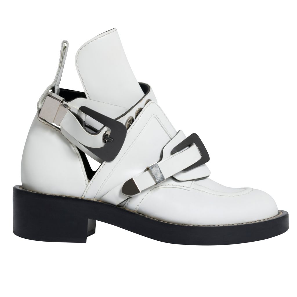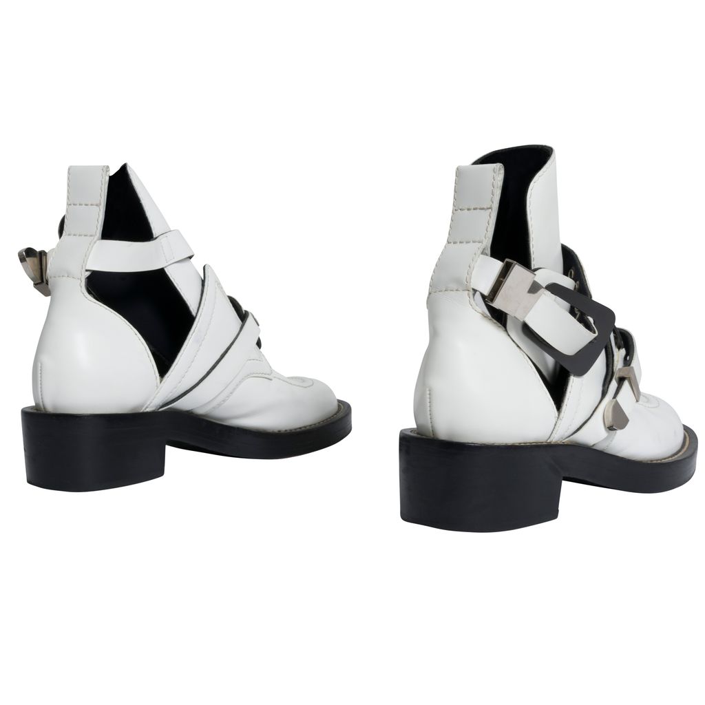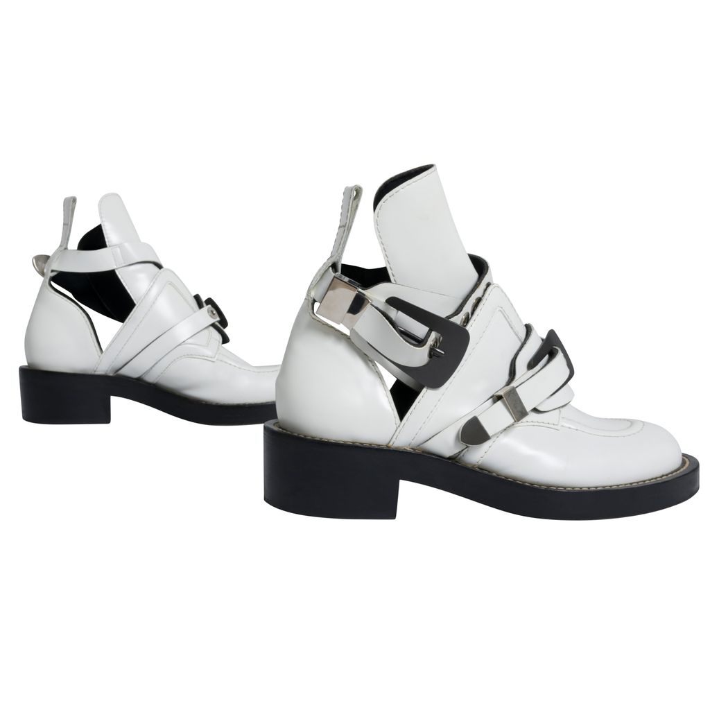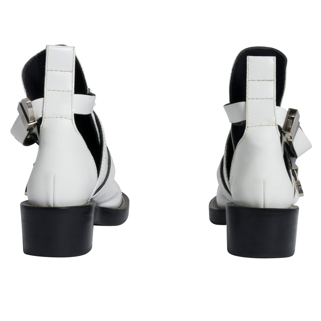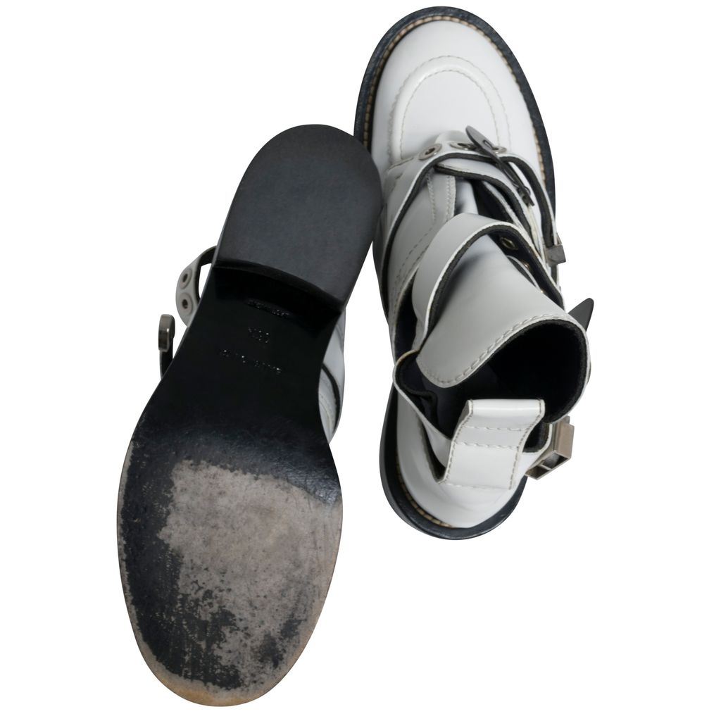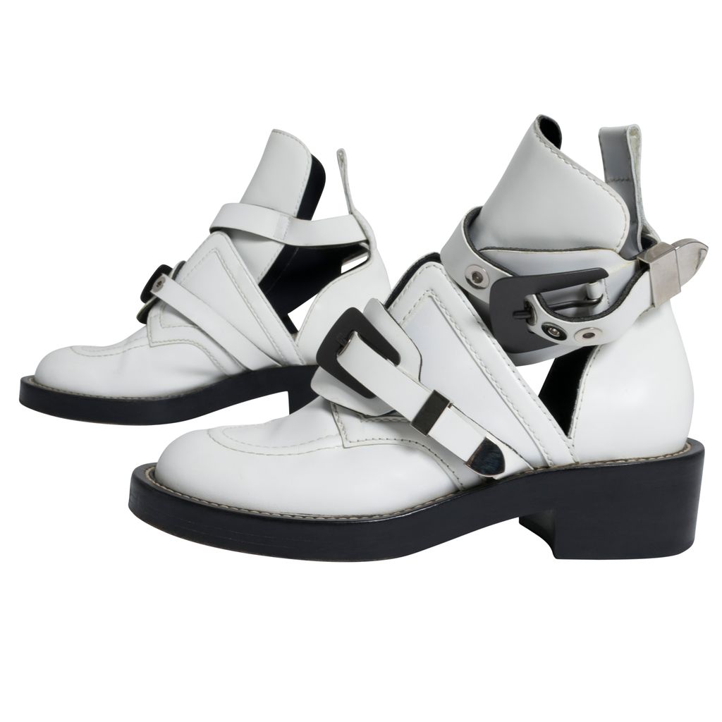 Inspired by the Spring-Summer '11 runway collection, these white leather boots from Balenciaga capture the punk spirit- featuring a round toe, stacked heel, open cut-out detail at the ankle, silver toned hardware, double buckles on the front and top of the ankle, back pull tabs, and black sole. Includes dust bag. In good condition. Minor scuffs on straps, toe, and sole. Minor creasing at exteriors.