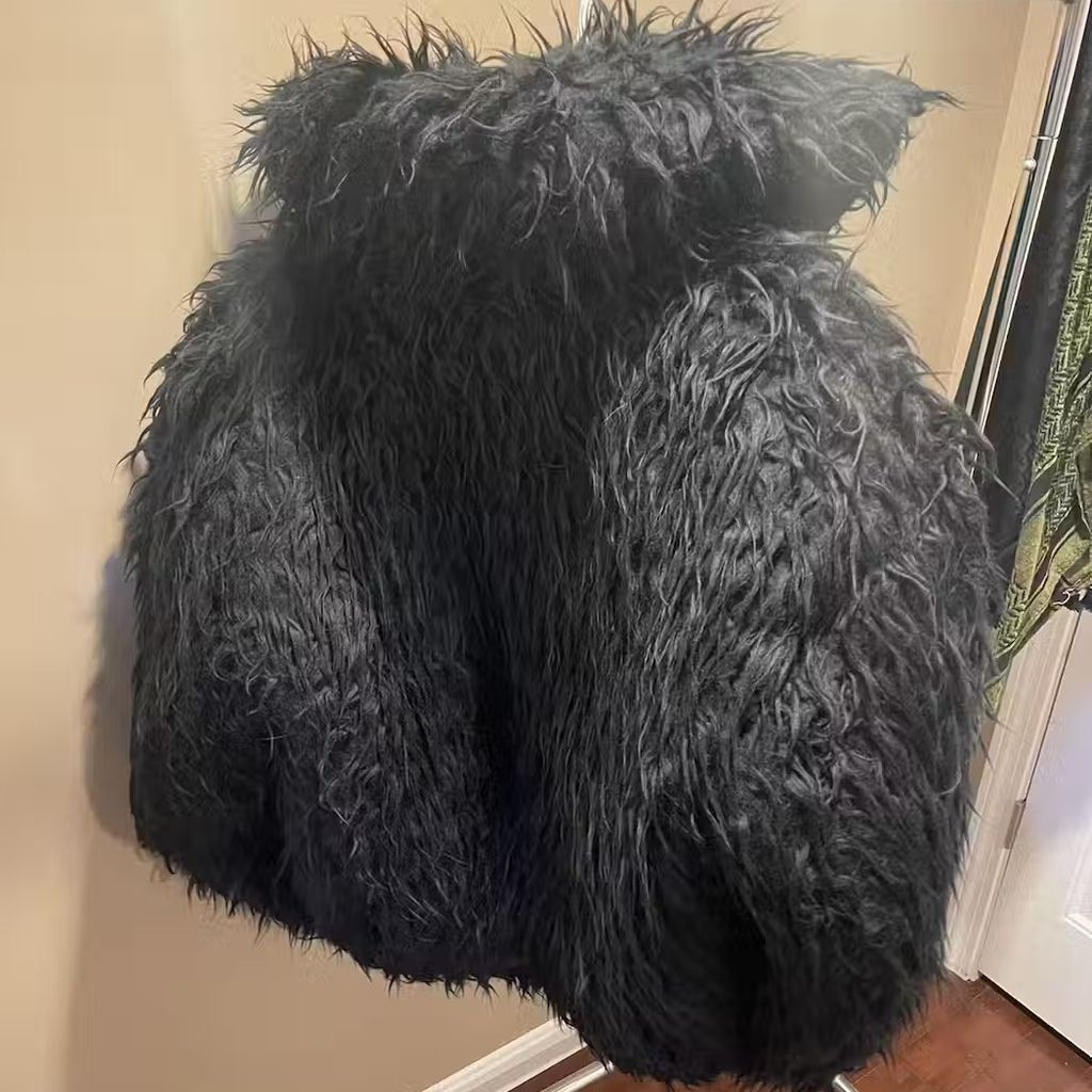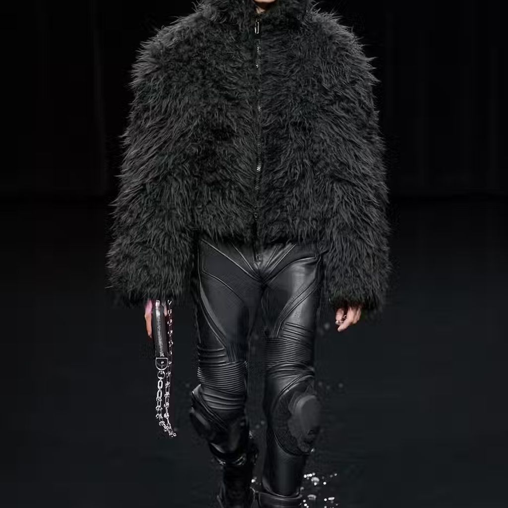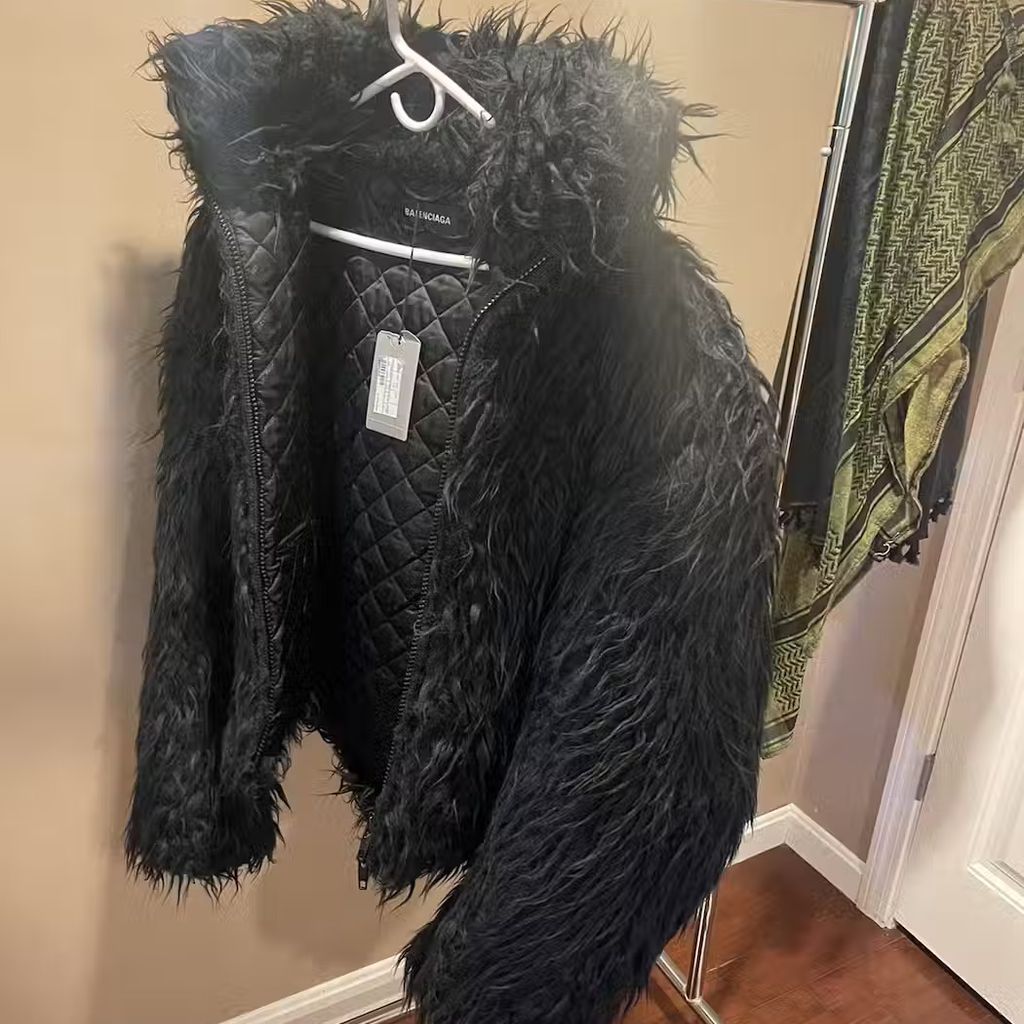 Balenciaga Cropped Faux Fur Jacket AW20 features front zip closure, quilted lining, and high collar.