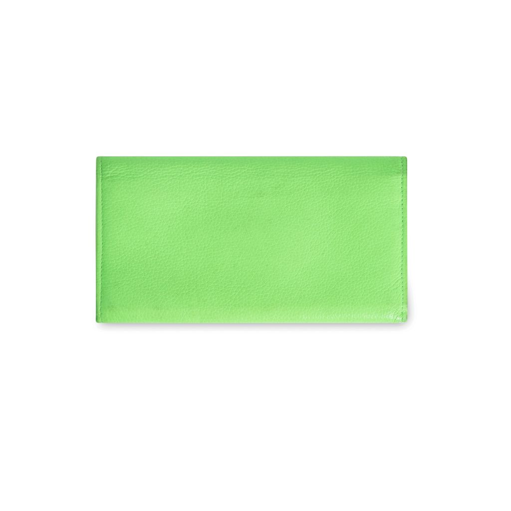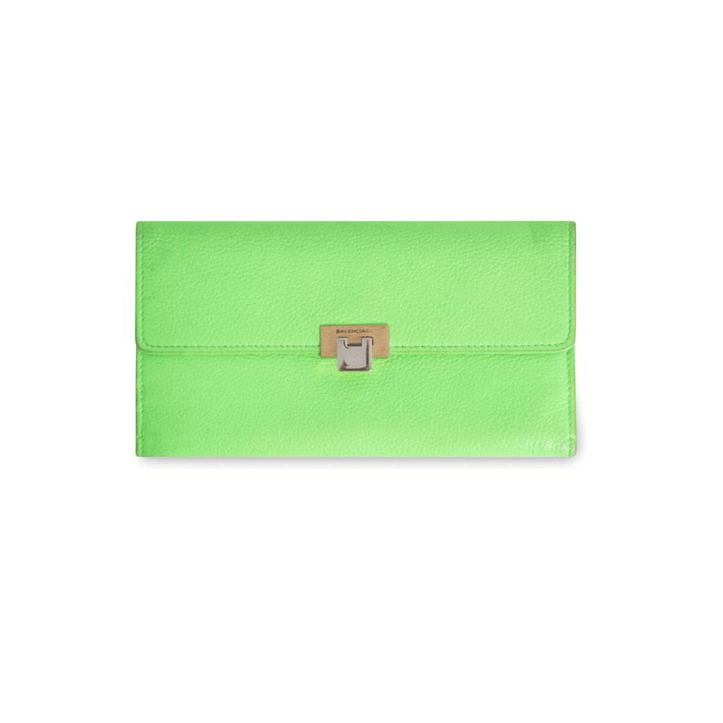 Balenciaga Neon Green Travel Wallet features a gold and silver clutch opening, an internal coin purse, and a location for IDs and credit cards.