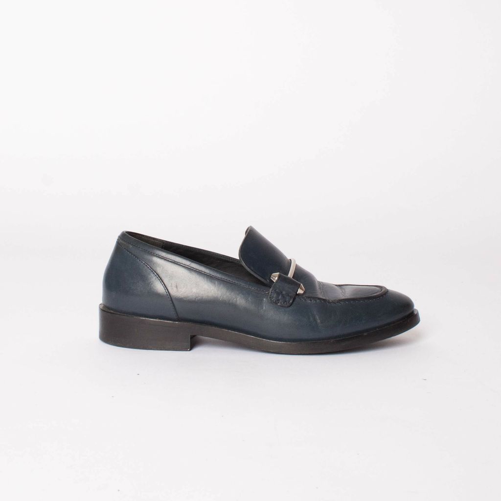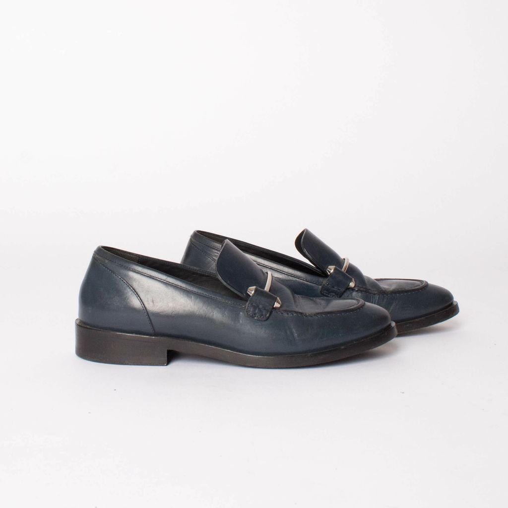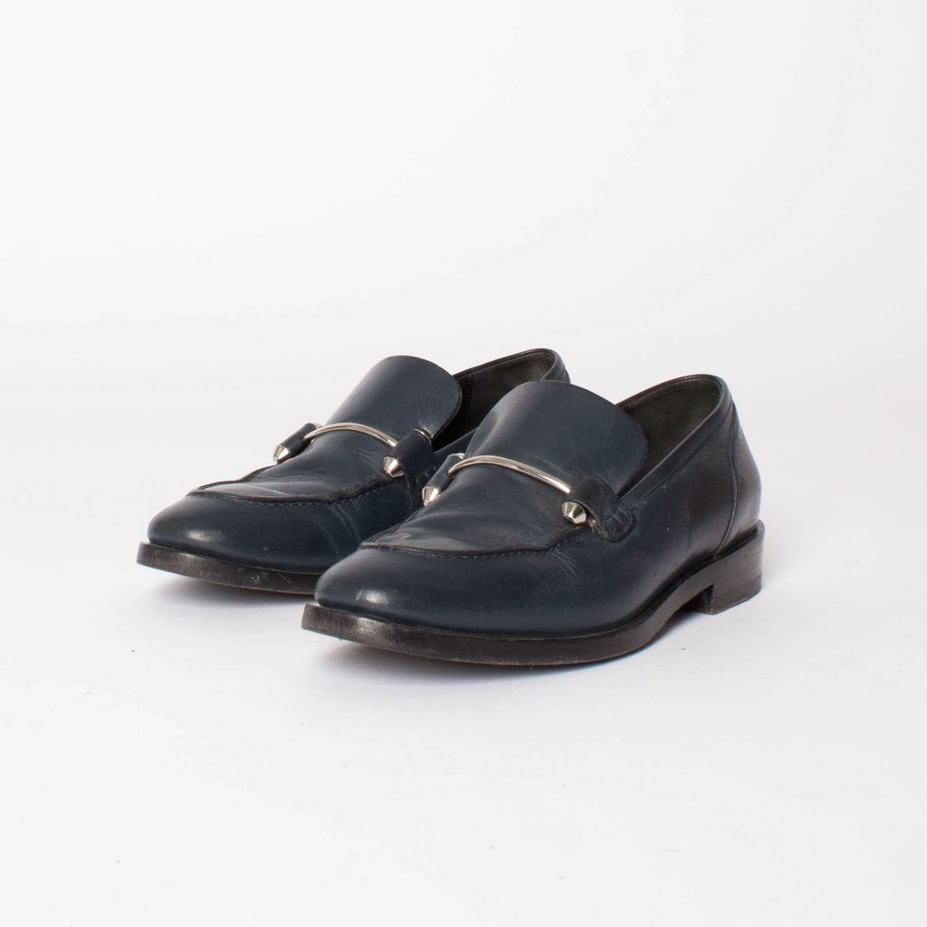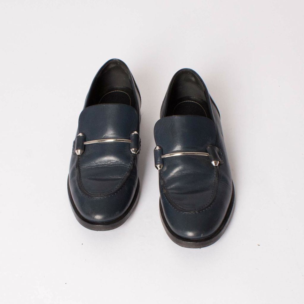Womens dark blue leather Balenciage loafers with silver hardware. Size 37.