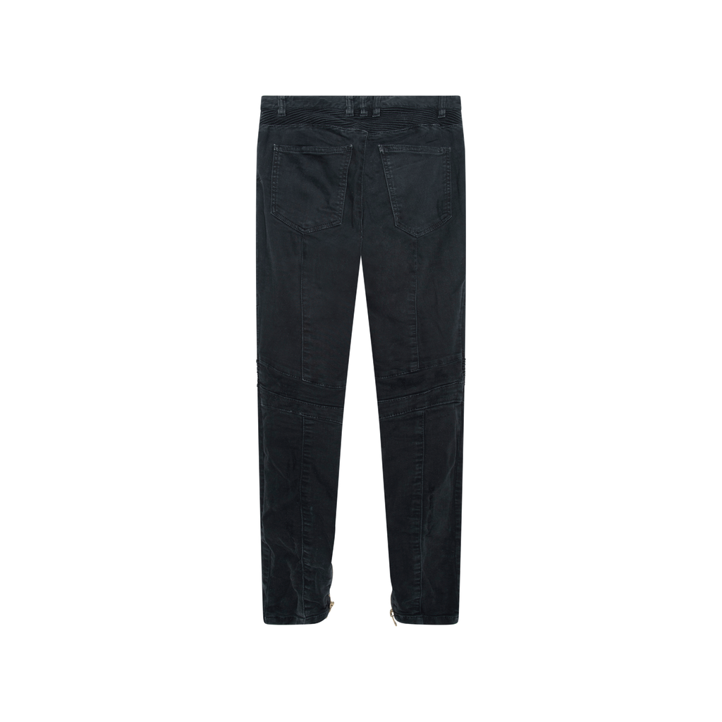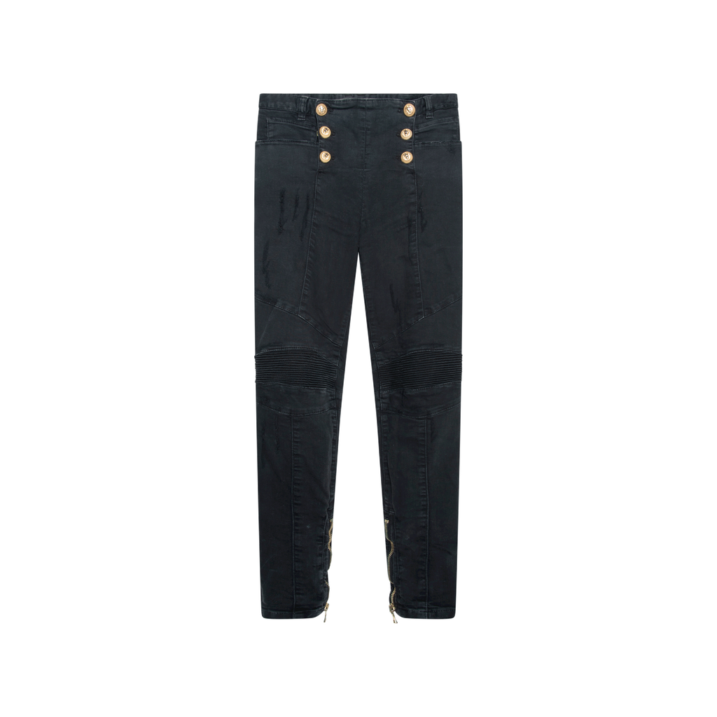 Balmain Black Biker Jeans features gold button front closure, 6 pocket stying, inner zippers at ankles, and high waist.