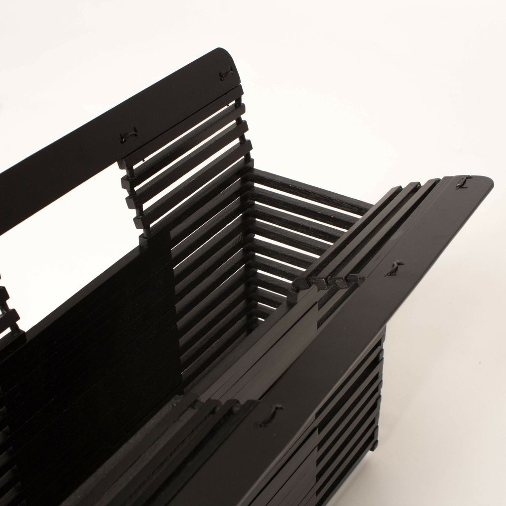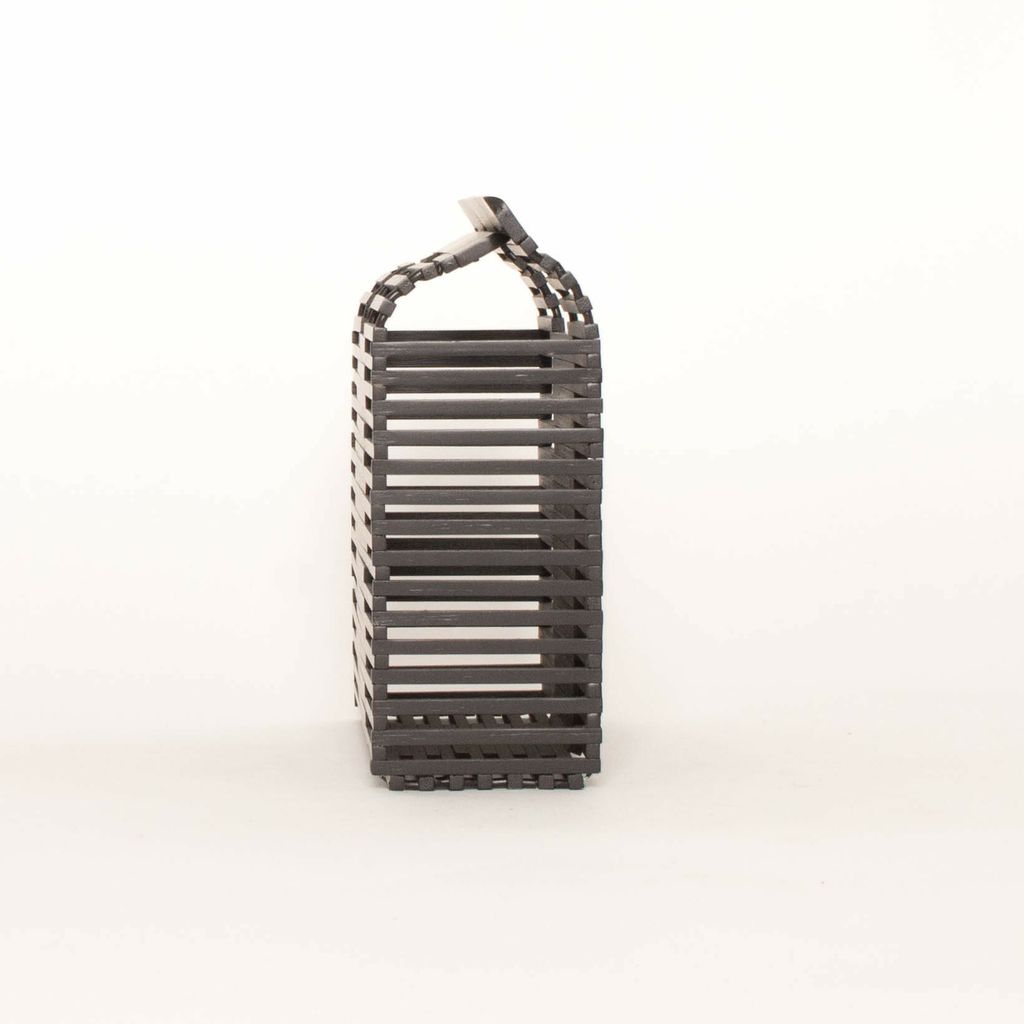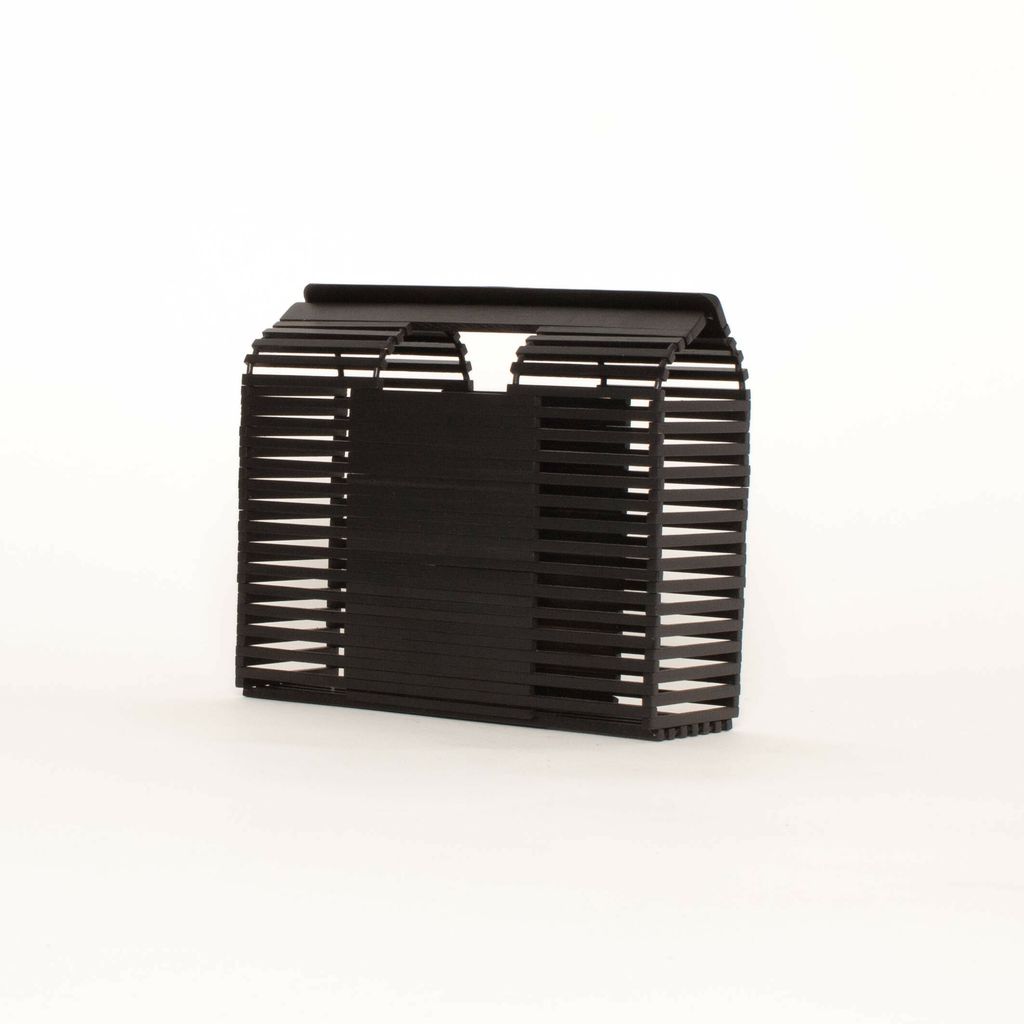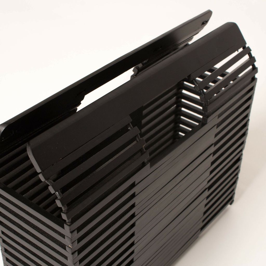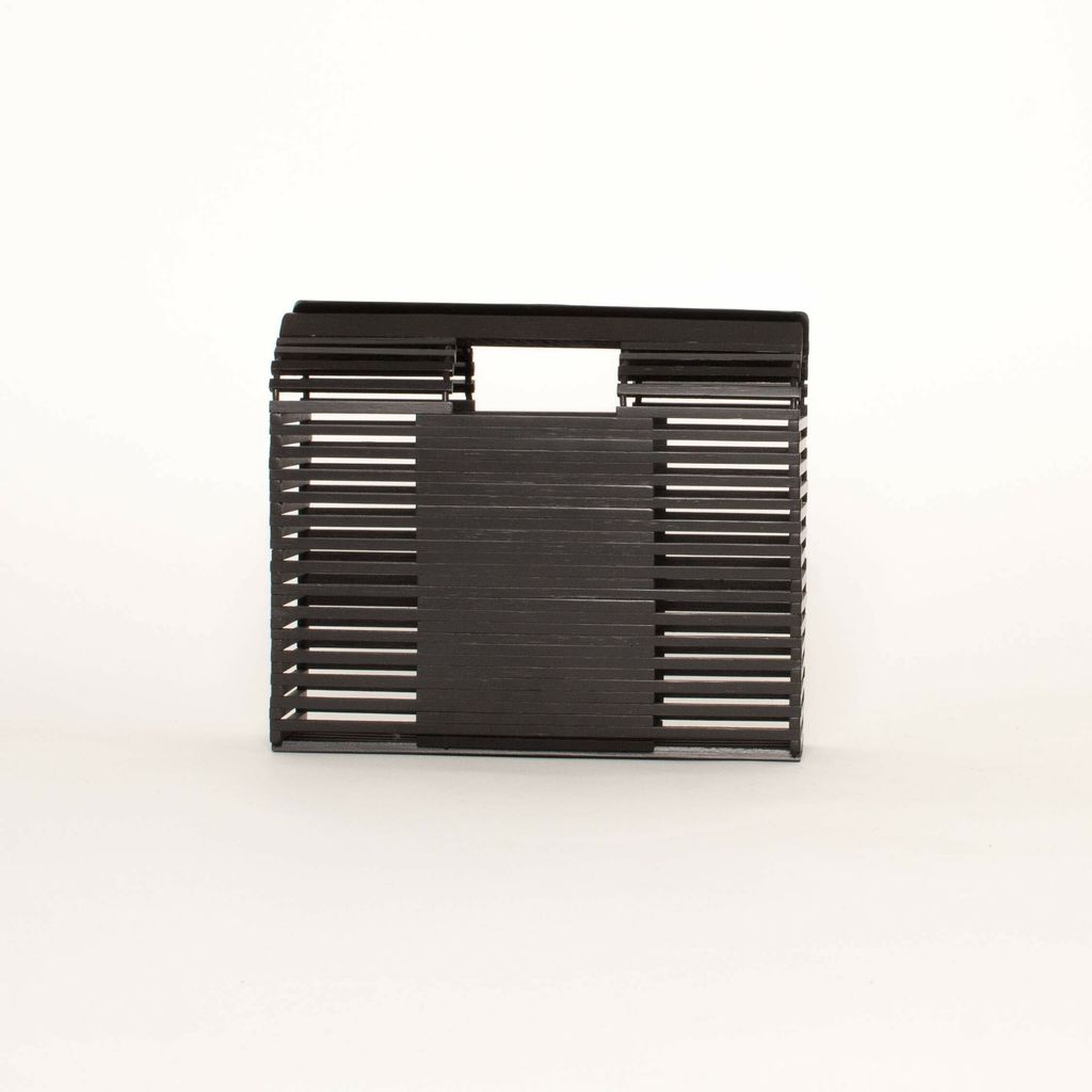 Understated and elegant, this bag is a fashion forward bag that will elevate any look. Features slatted bamboo box design and top handles.