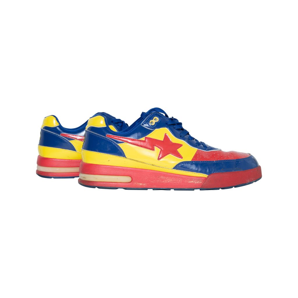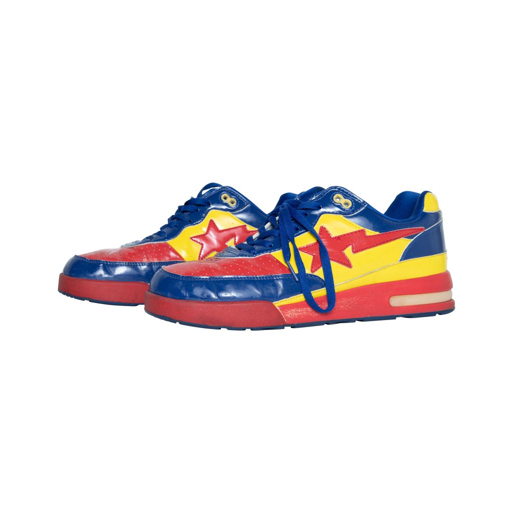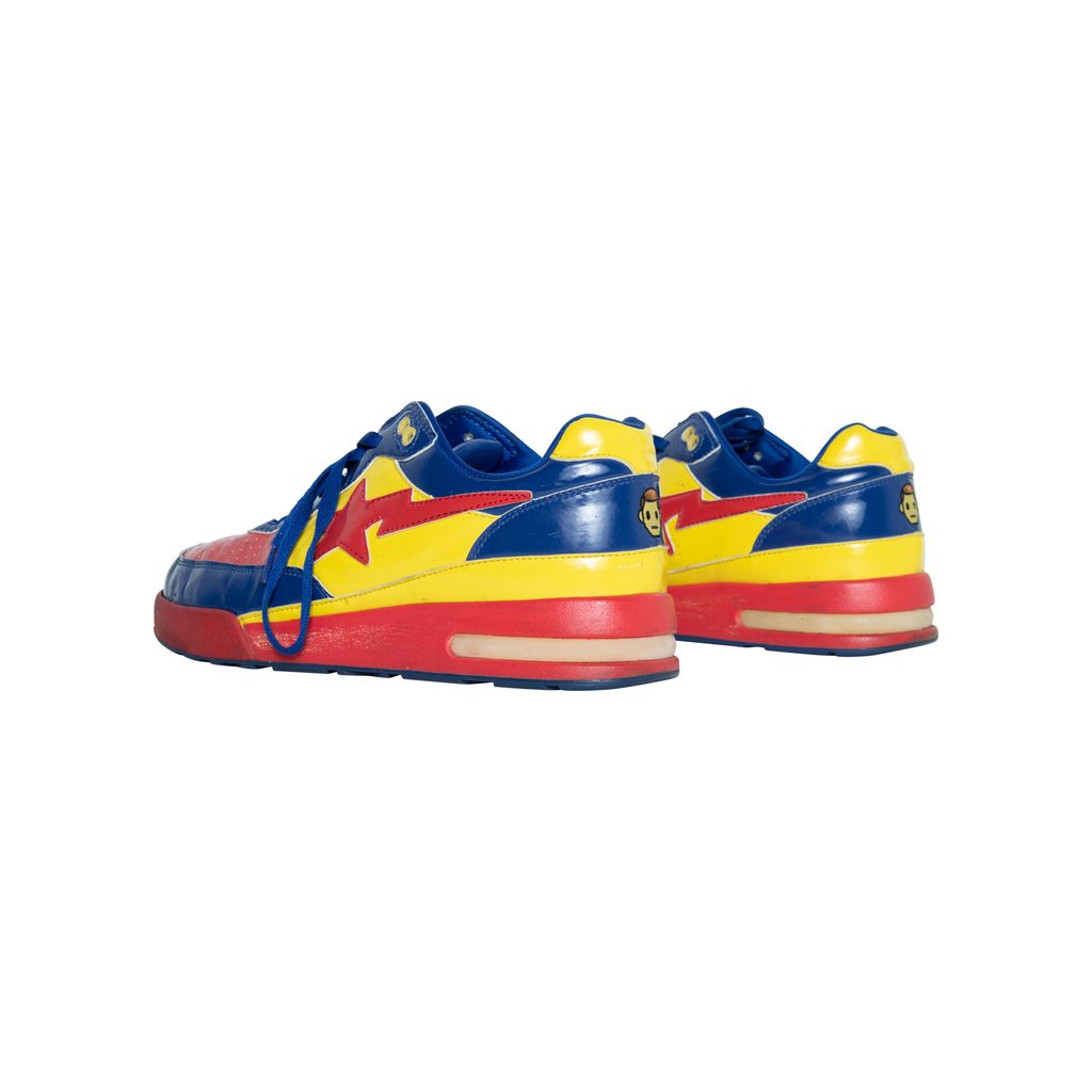 Bapesta FS-001 Low 'Superman' features logo embroidered tongue and red, blue, and yellow color block design.