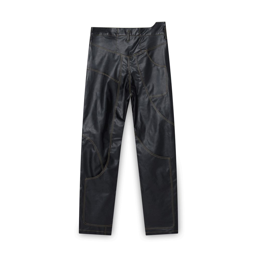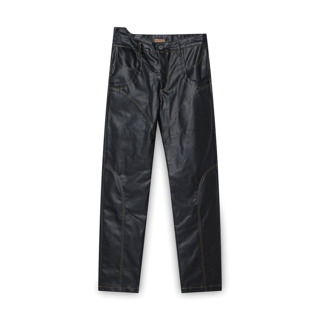 Barragán Black Leather Pants features yellow stitching and straight leg fit.