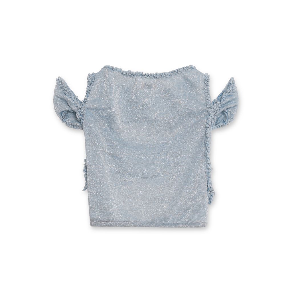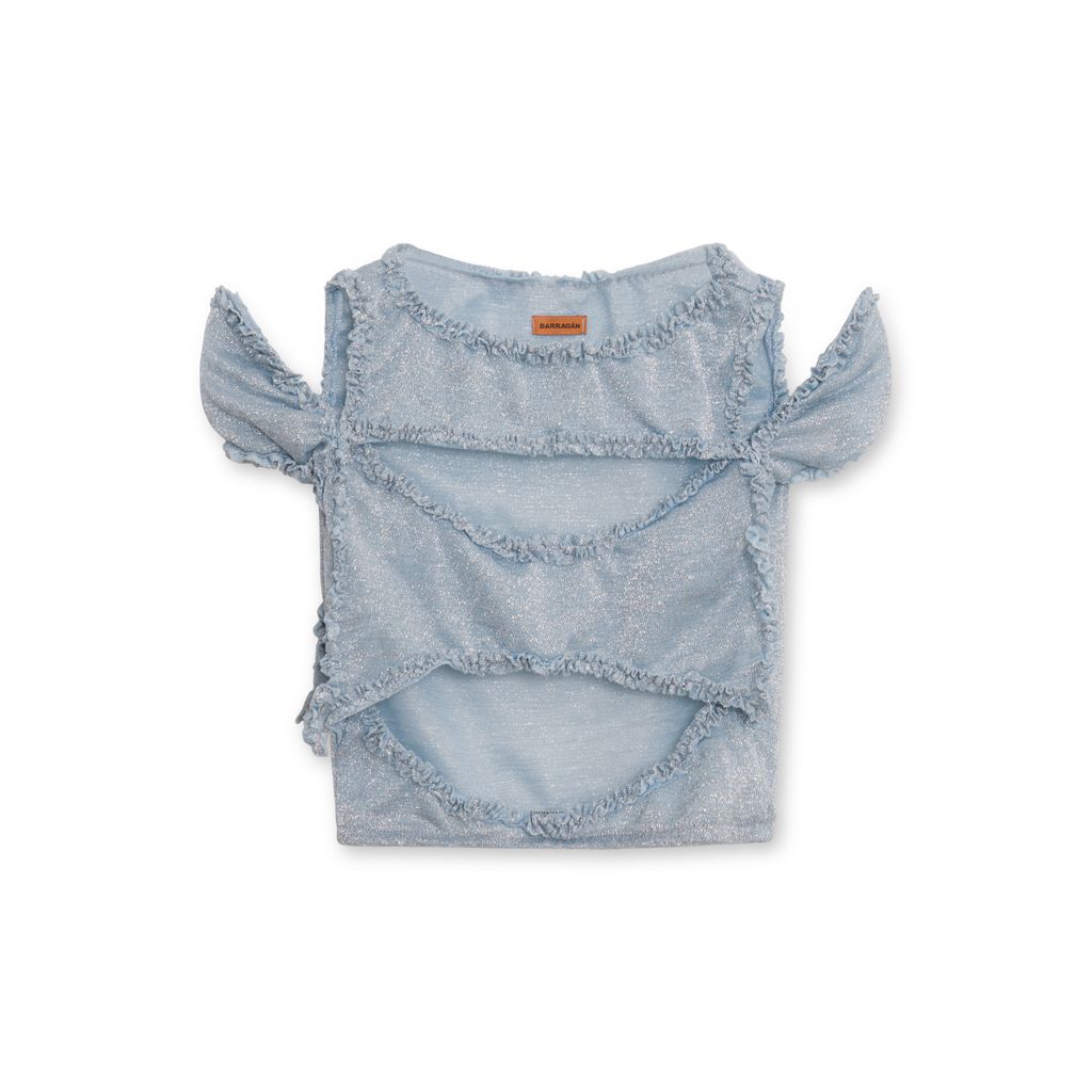 Barragán Ruffle Cut-Out Top features sparkly detail throughout, crop top with cutout details, ruffle accents throughout, cropped at waist, sheer, stretchy fabric.