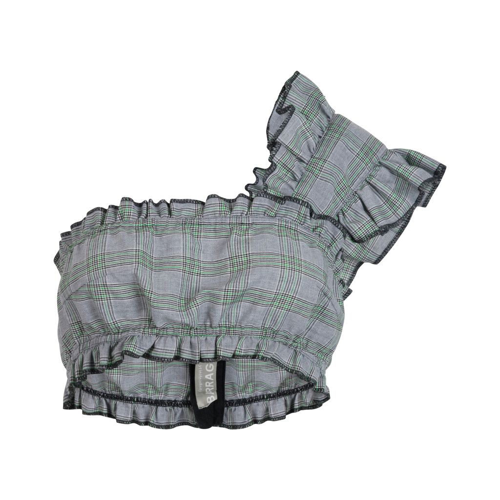 This tartan top from Barragán has a one-shoulder silhouette, a ruffle trim detail, and a back clasp bra closure for easy wear. This piece is from Barragán's Autumn/Winter 17 Collection. In excellent condition.