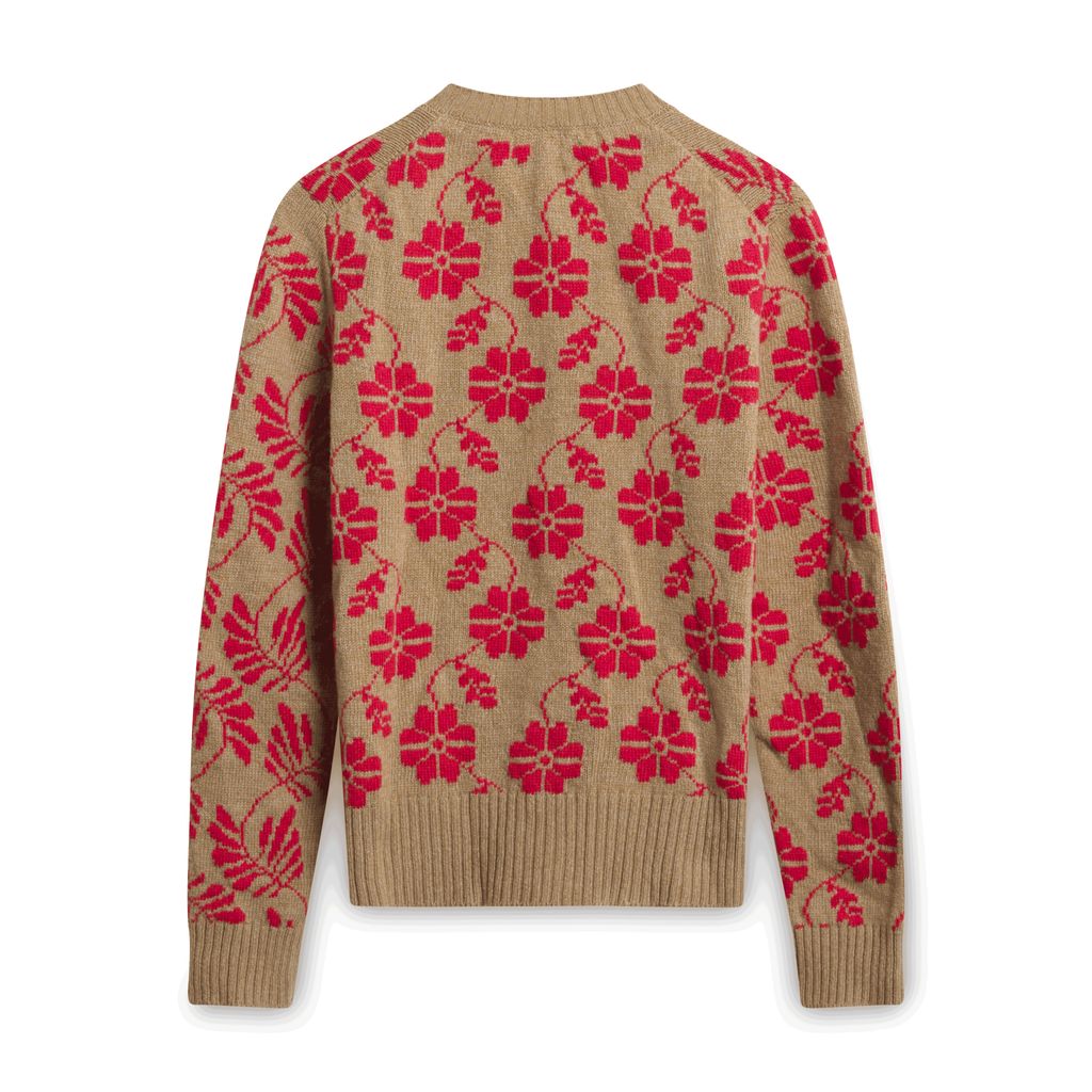Barrie Floral Round Neck Cardigan - Brown features floral pattern, brown buttons, and ribbing on the collar and sleeves.