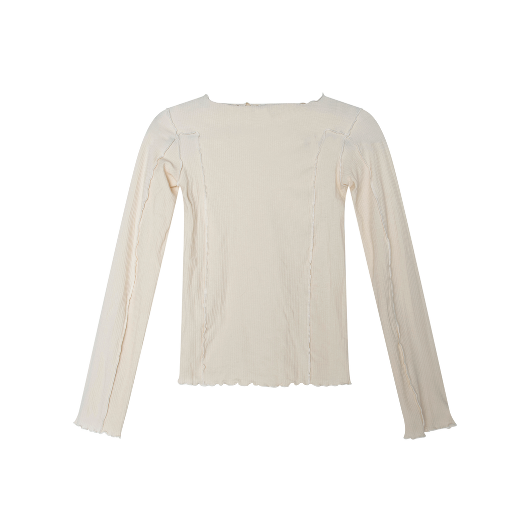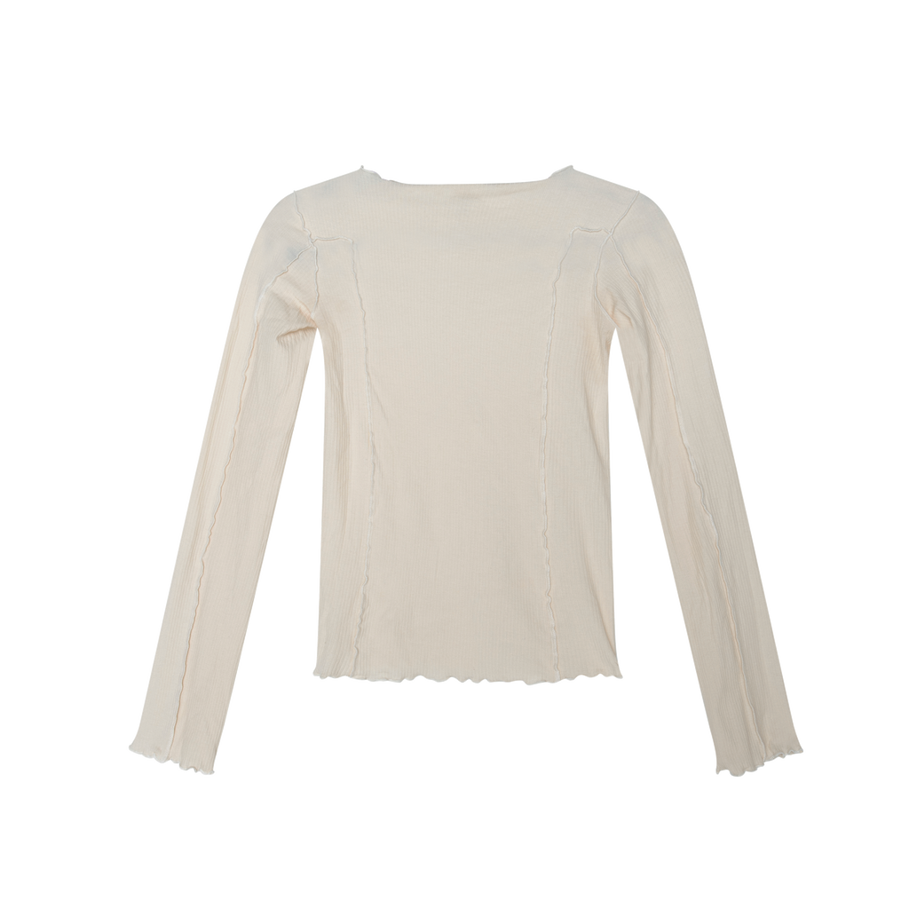 Base Range Cream Long Sleeve features lettuce trim and inside out seam design.