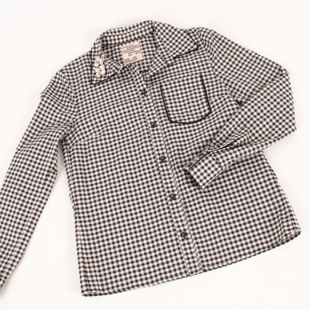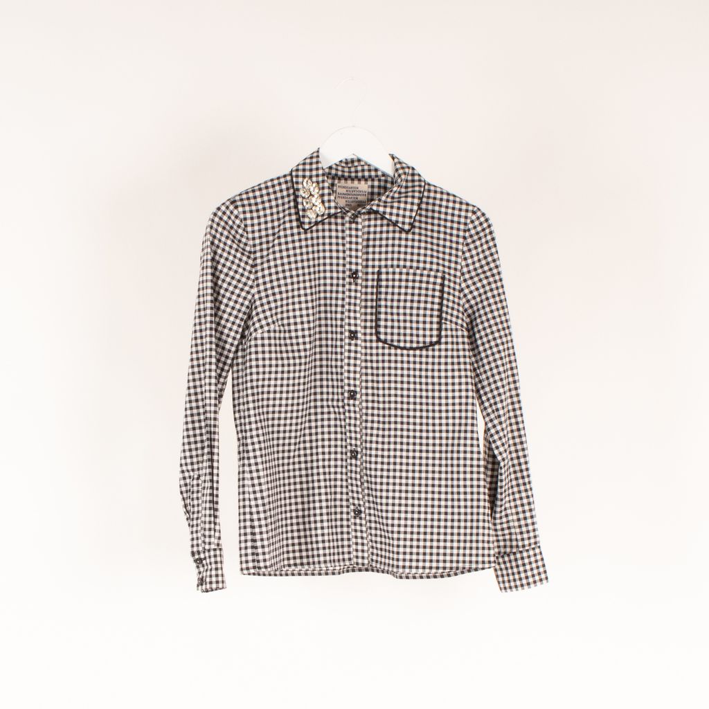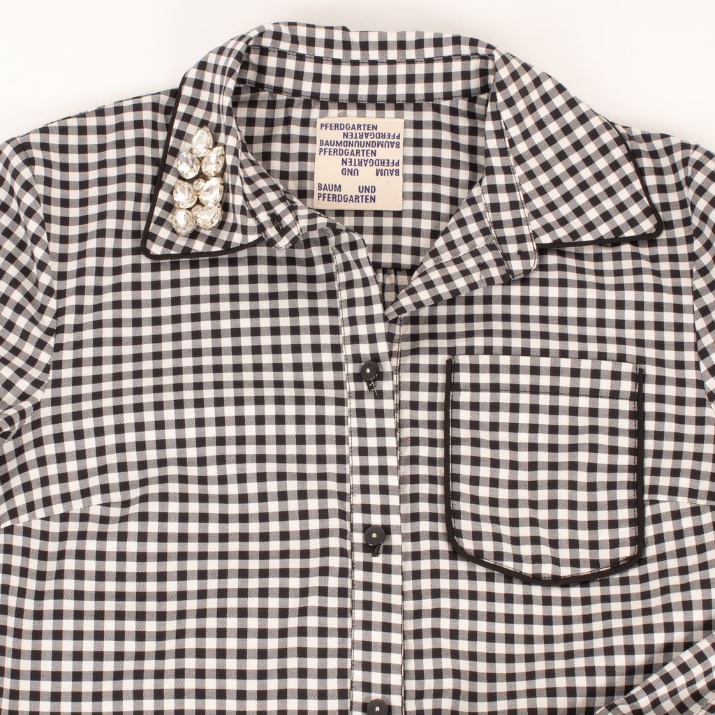 With its tailored fit and gem detail, this gingham blouse from Baum Und Pferdgarten is equal parts kooky and feminine. Features full button down front closure, stone detail on collar, button closure cuffs, and front pocket with contrast piping.