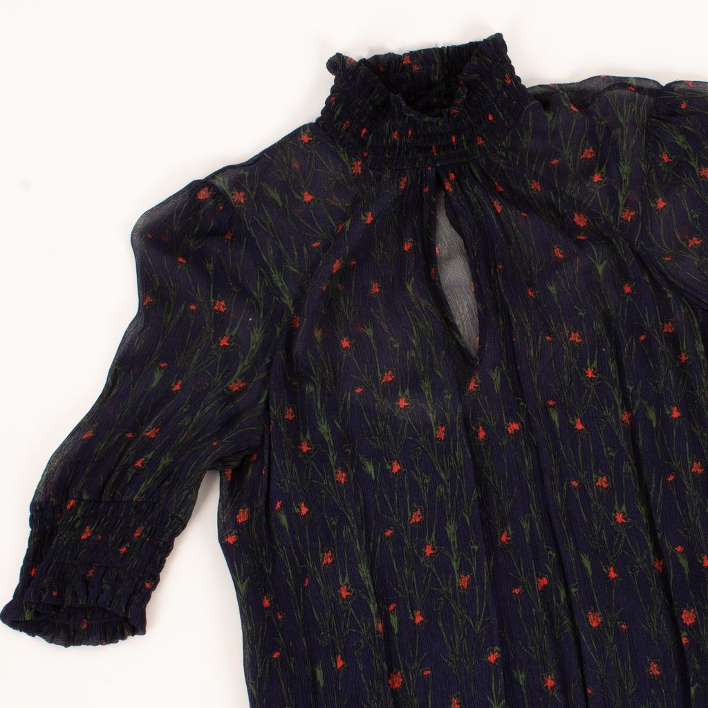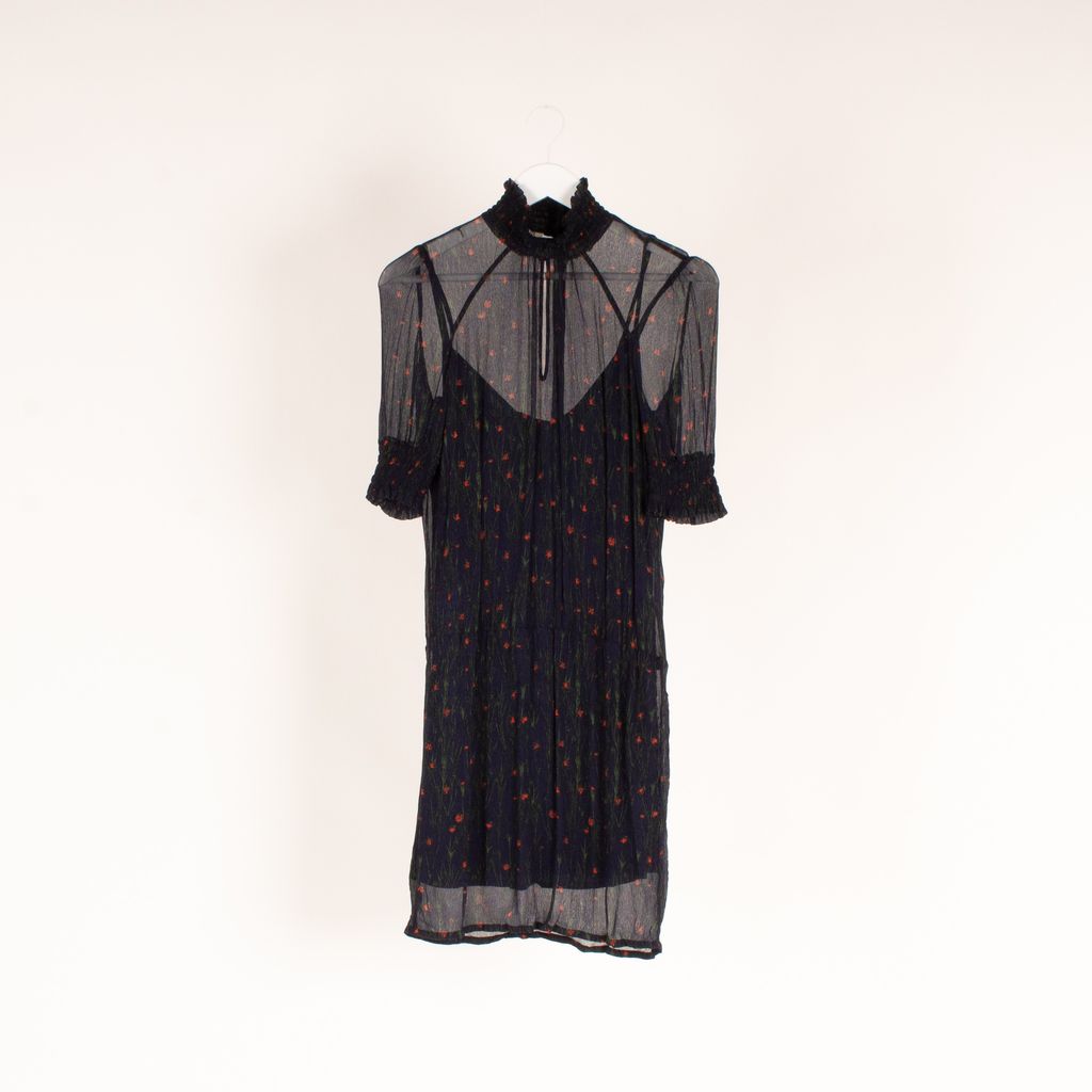 This dress from Copenhagen design duo Baum Und Pferdgarten will have you feeling like a million euros with its all over delicate floral print and attention to detail. Features smocked high neck and sleeve cuffs, keyhole design at neck, drop waist elastic skirt, and accompanying slip.