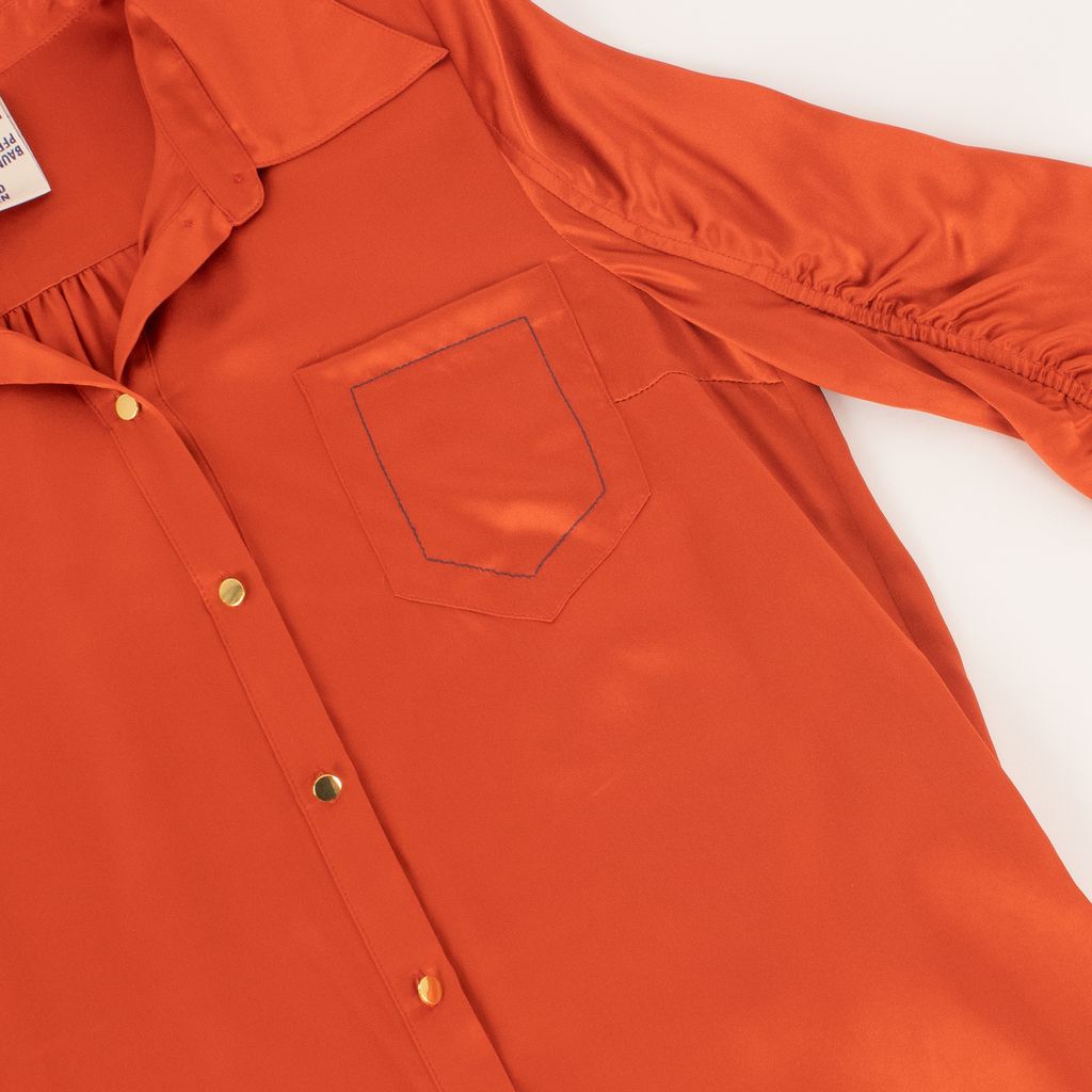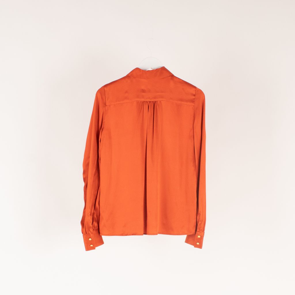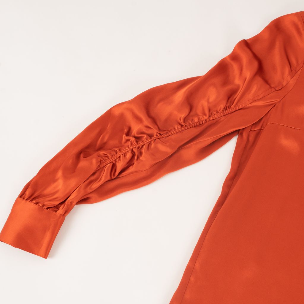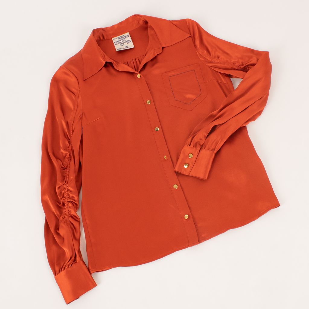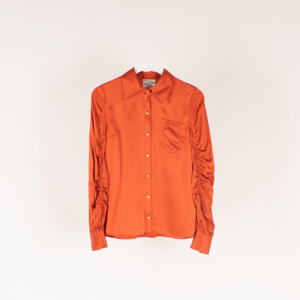 Break out of the boring blouse mold with this crazy button down from Baum Und Pferdgarten. Features ruched sleeve detail, button closure cuffs, full button down front closure, and breast pocket with contrast stitching.