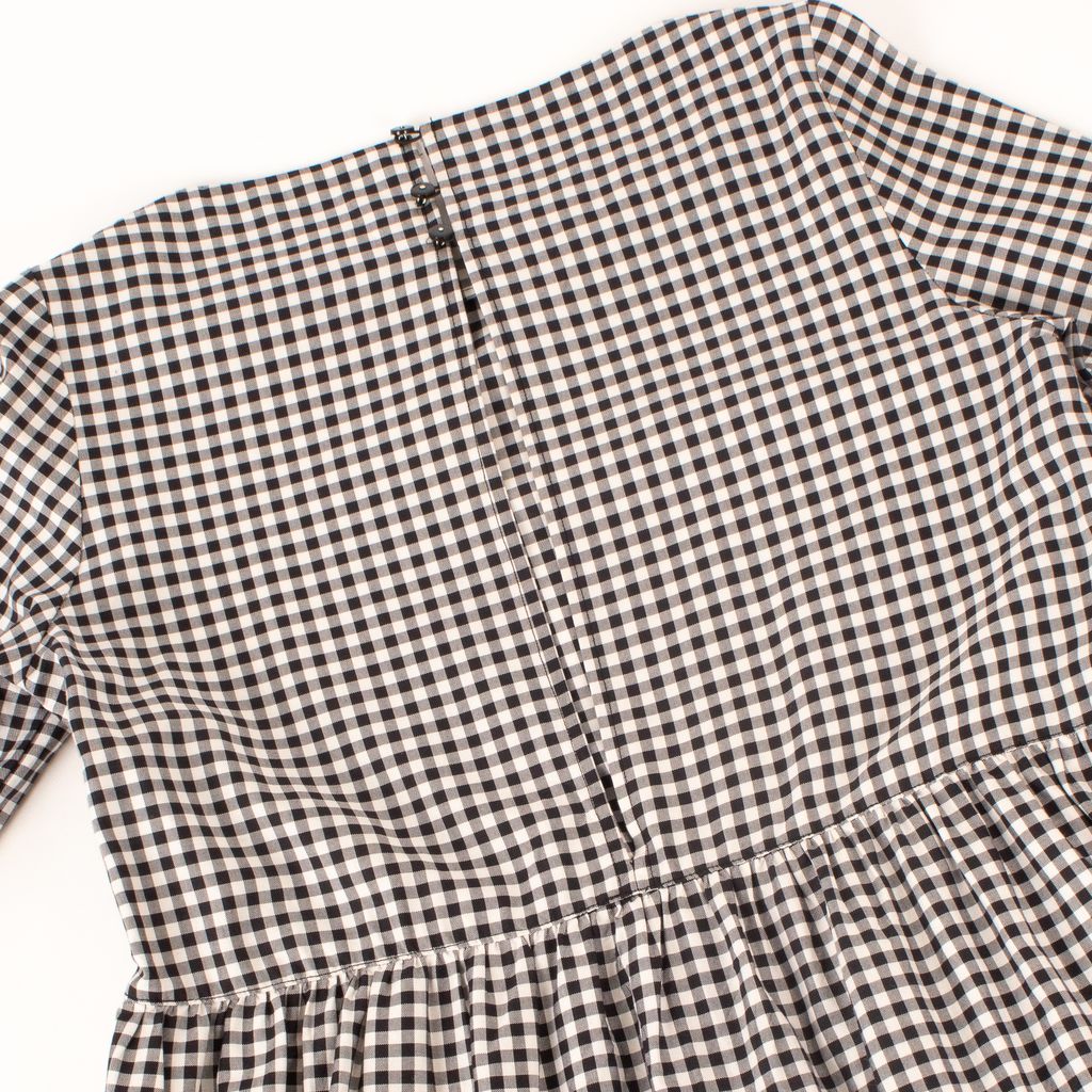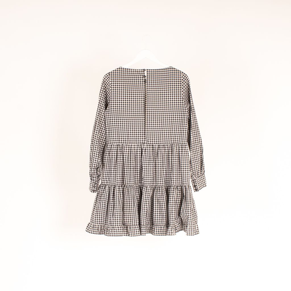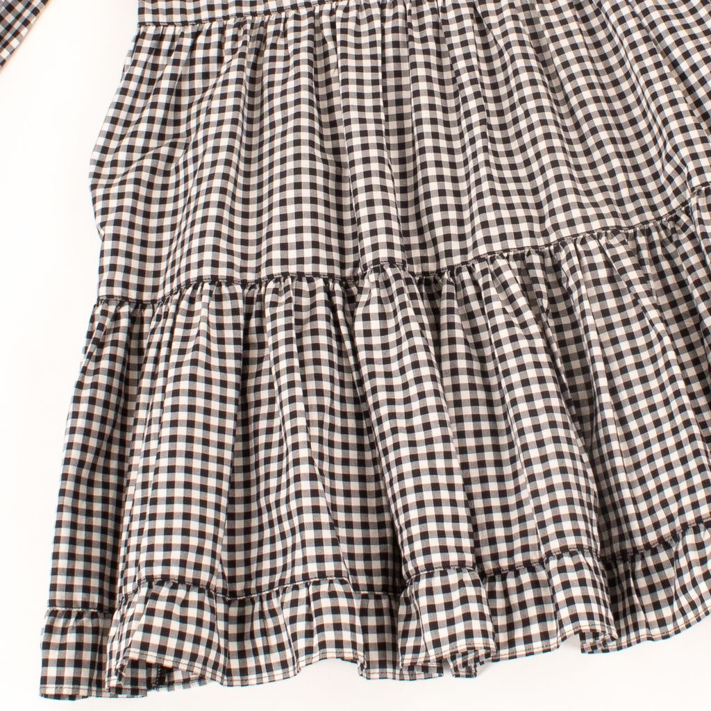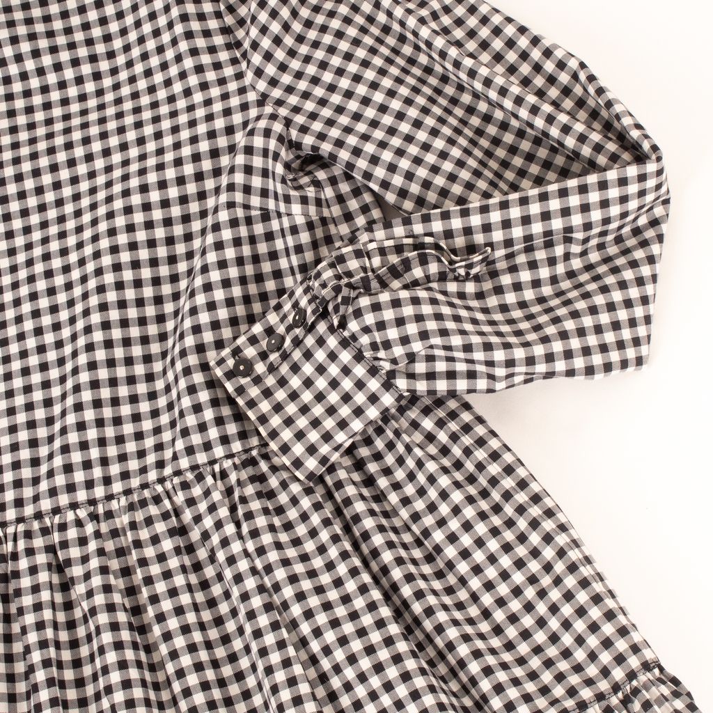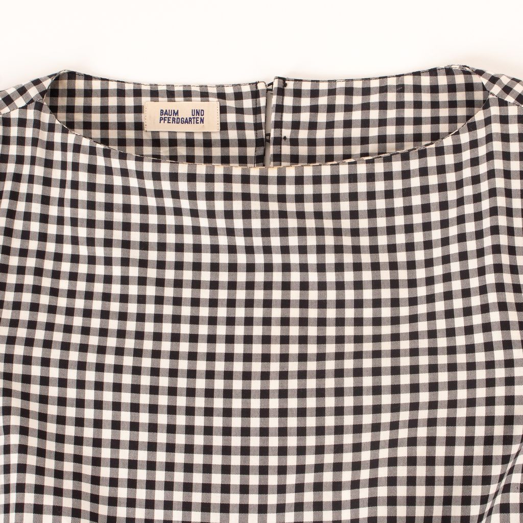 Lightweight and airy, this fun little number from Copenhagen based design duo Baum und Pferdgarten is an easy dress to throw on and go in warmer months, or layer up with tights and a coat for the colder ones. Features tiered skirt design, all over gingham print, button cuff detailing, triple button keyhole back closure, and minor signs of wear. Signs of wear include makeup stain at neck.
