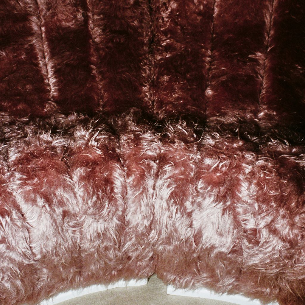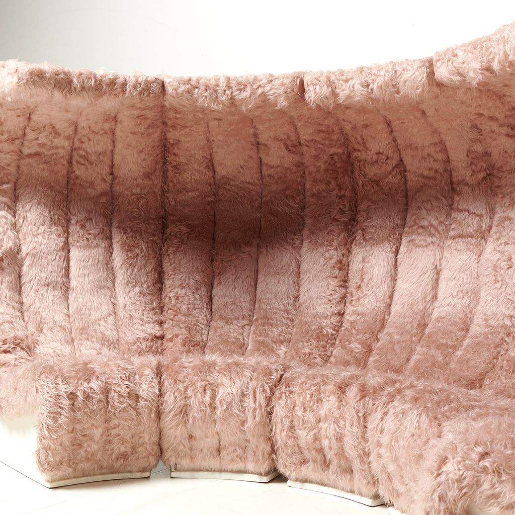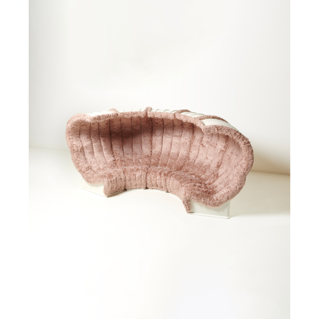 Sofa cabin composed of five identical modules in molded polyester and fiber glass, pink faux fur.