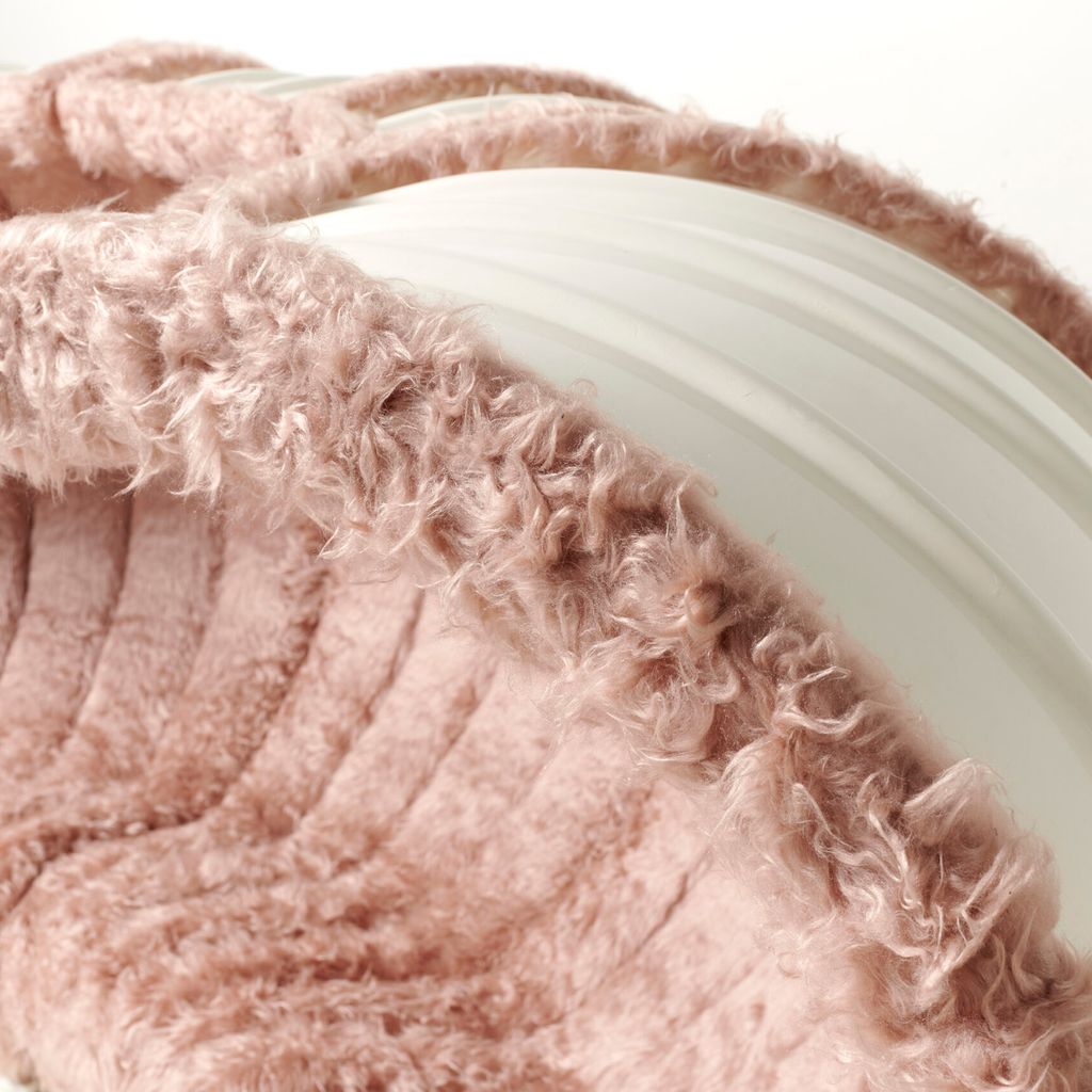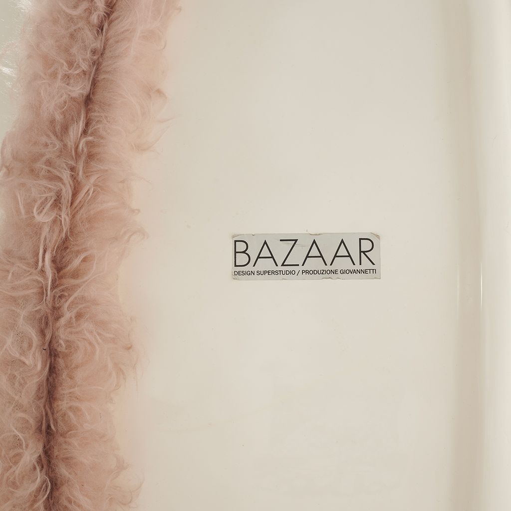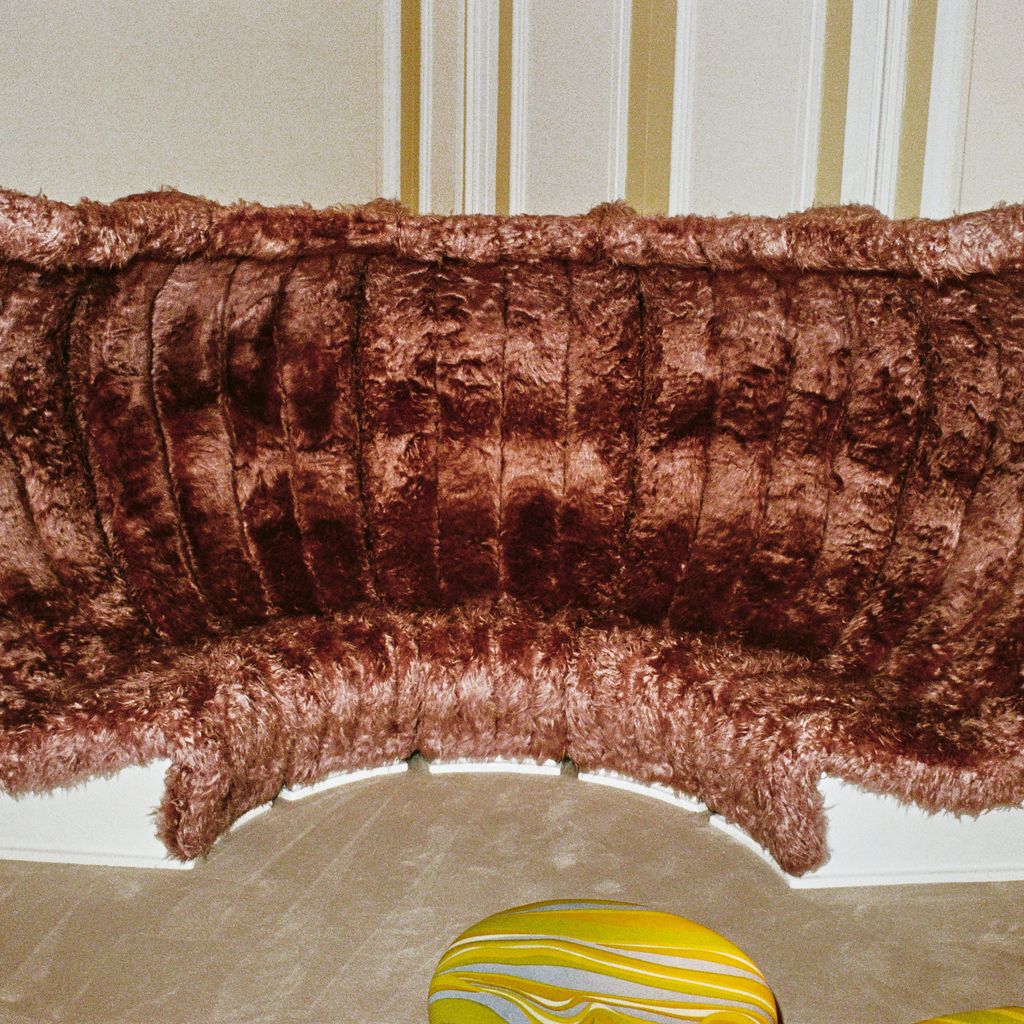 Sofa cabin composed of five identical modules in molded polyester and fiber glass, pink faux fur.