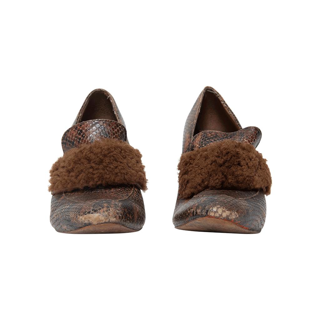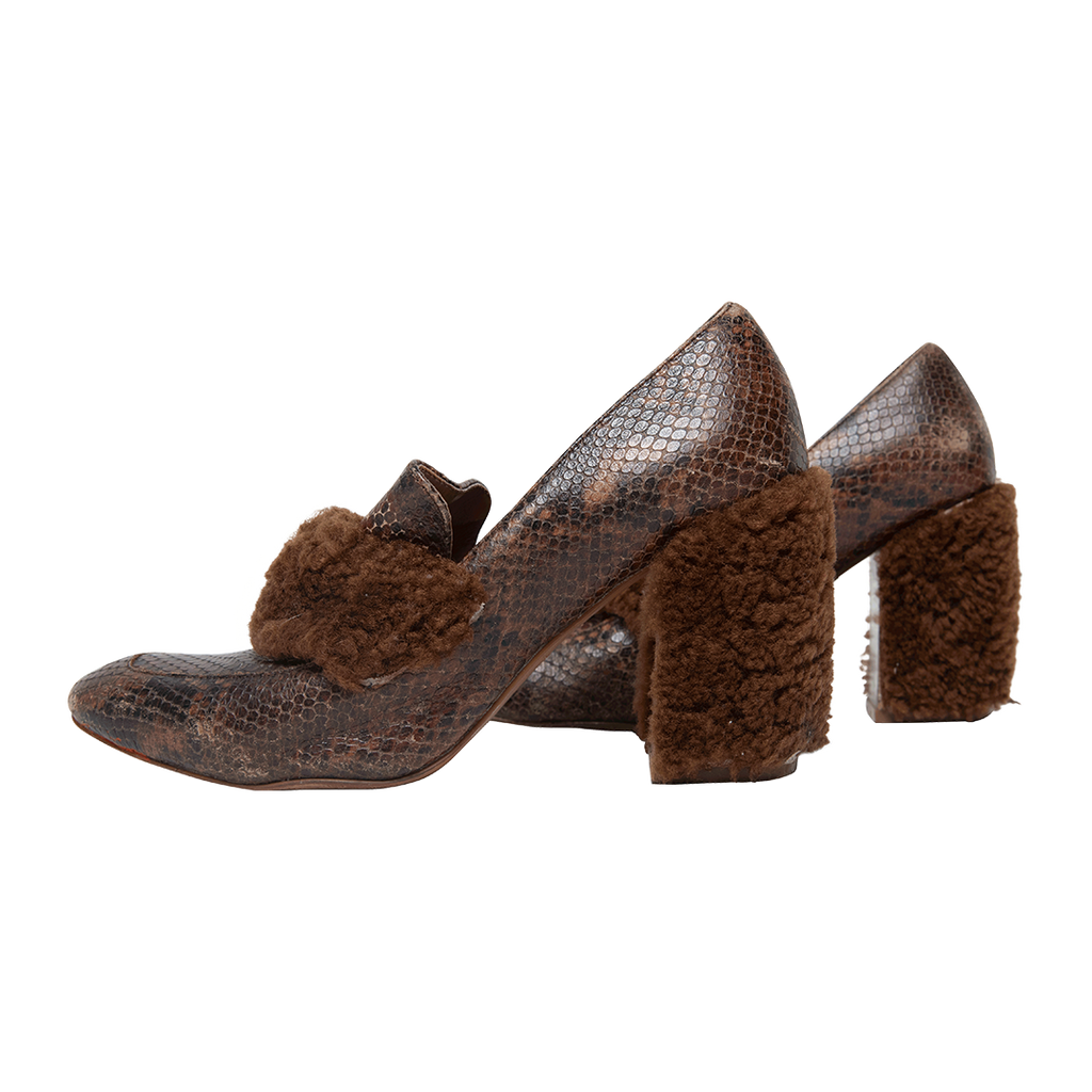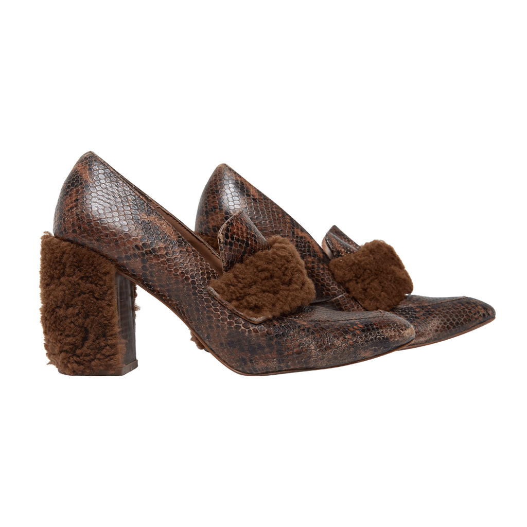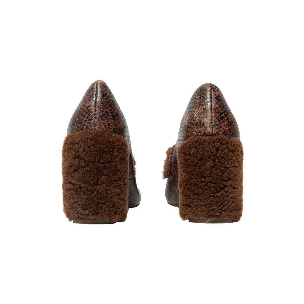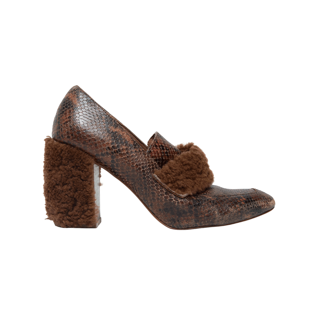 BCBG Fluffy Crocodile Loafer Heels feature block heel and pointed toe.