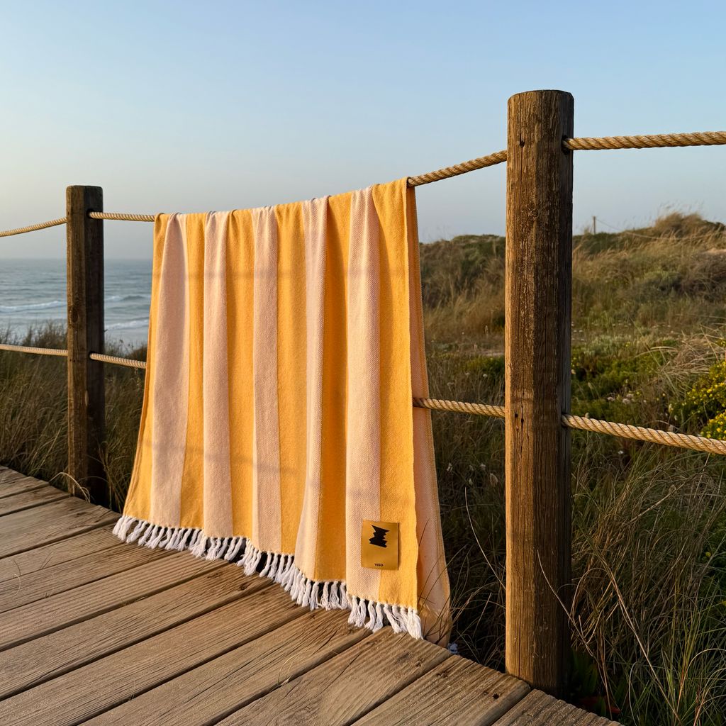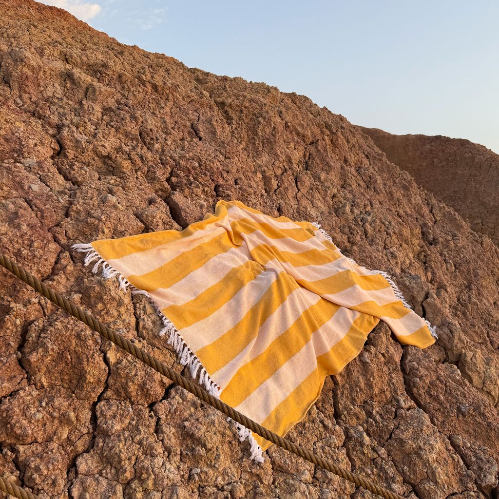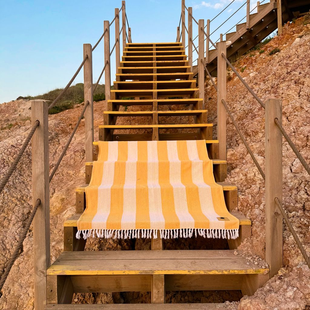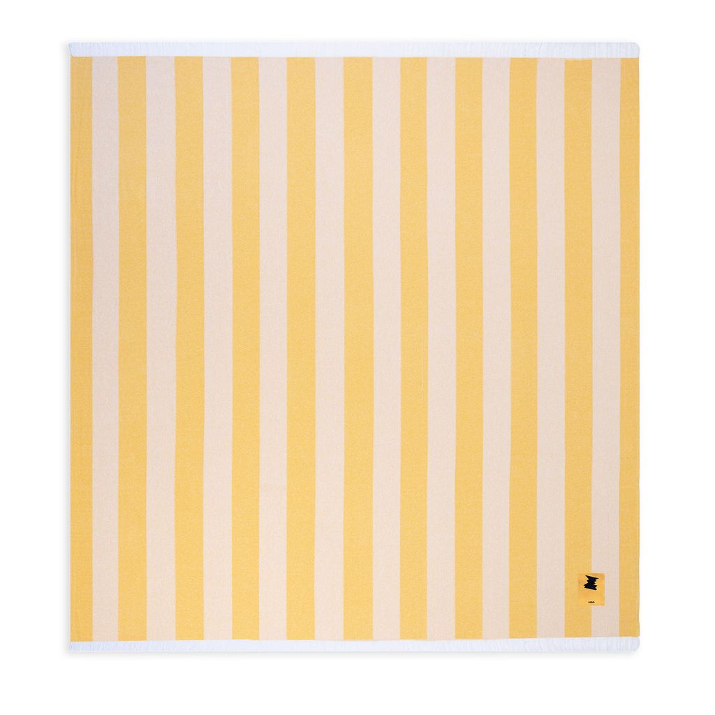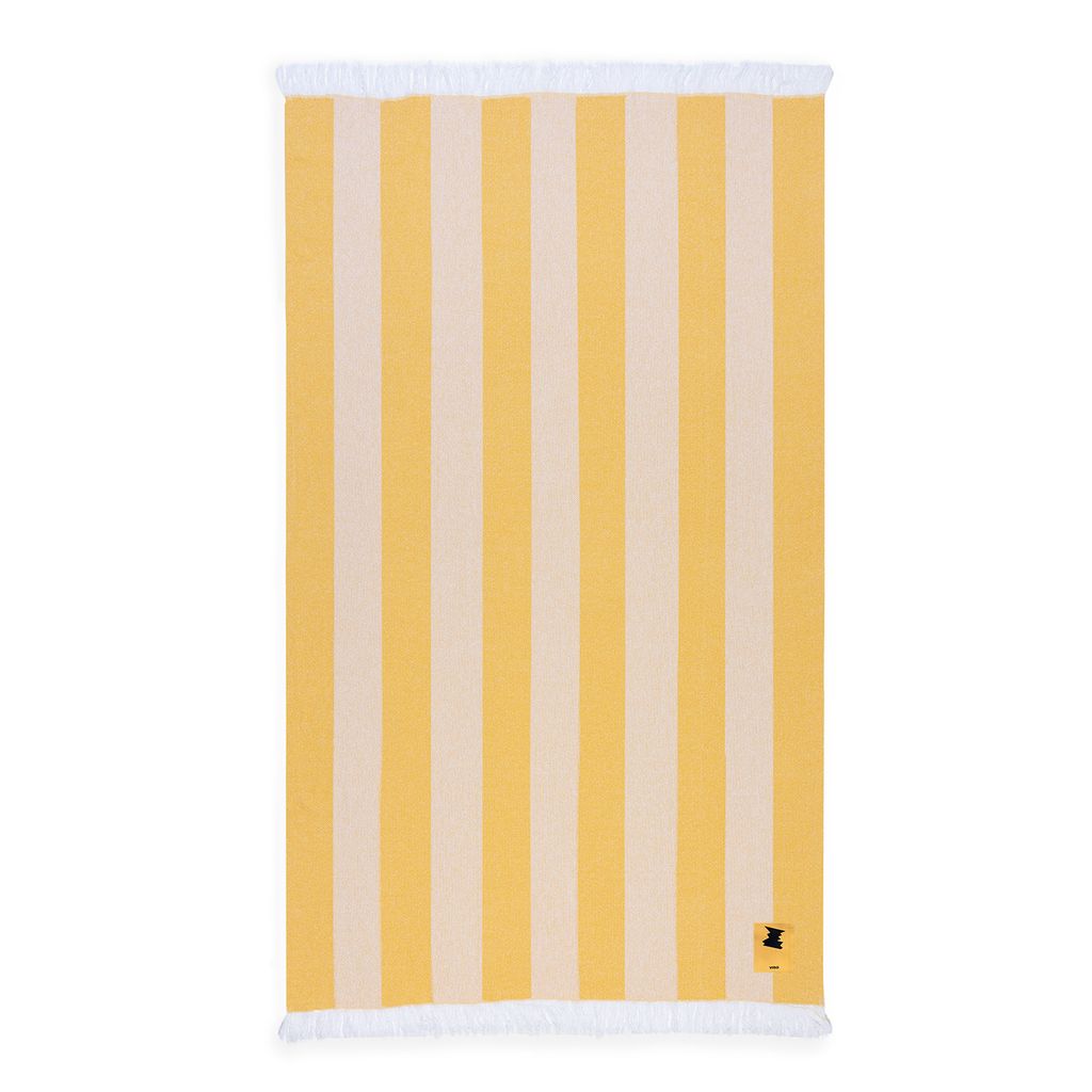 A cotton jacquard beach towel woven in a classic multi-stripe pattern of sunbeam yellow and white. Available in two sizes—single and generous double—perfect for sunbathing solo or lounging with a partner. It can also function as a lightweight coverlet. Soft, absorbent, and designed for both beach and home.