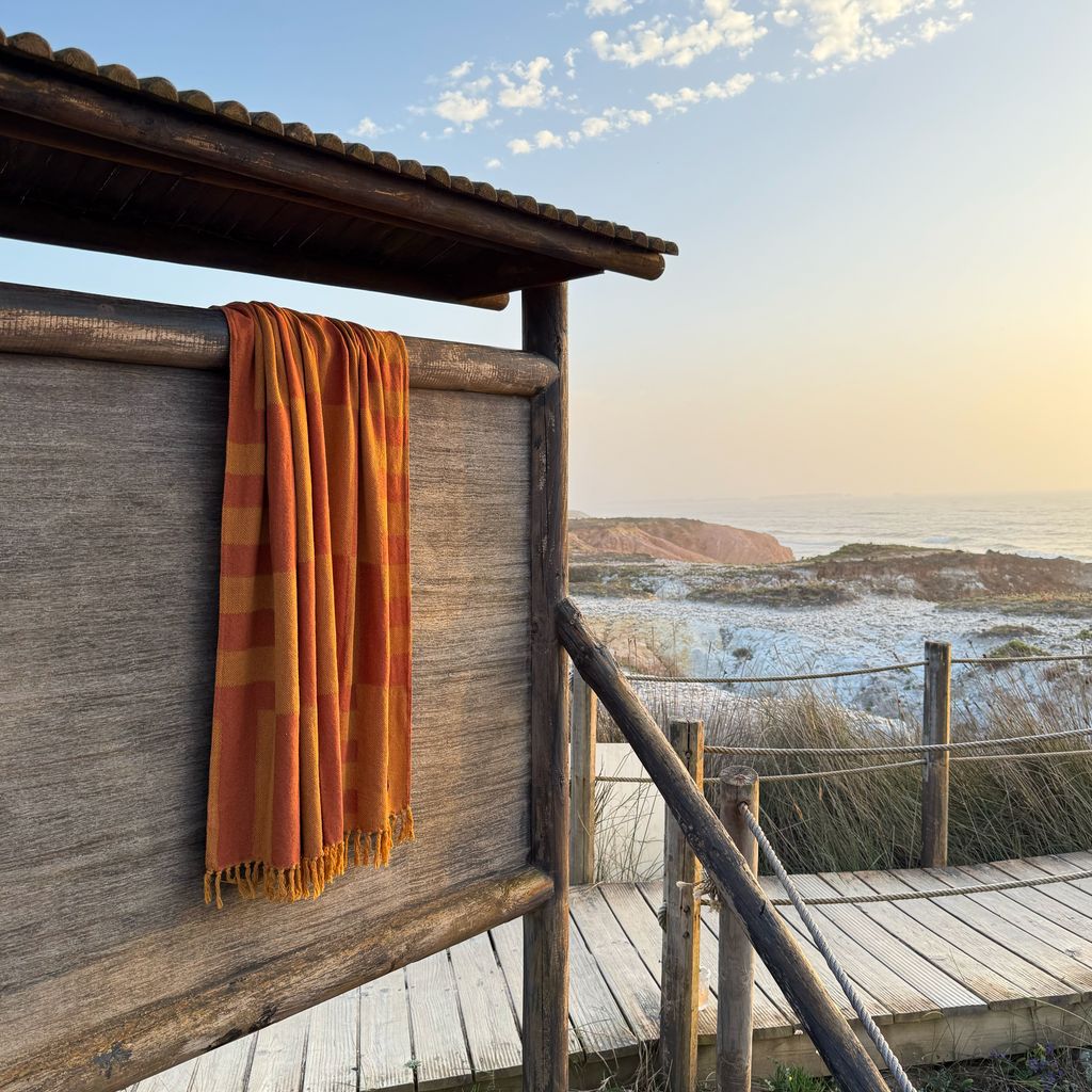 Woven from soft cotton jacquard in mustard and wine hues, this abstract multi-striped towel is made for slow summer days. Available in two sizes—one for quiet solo lounging, the other spacious enough to share with a friend, a partner, or little one. Whether stretched out on warm sand or layered at the foot of a bed, it brings softness, absorbency, and ease wherever it lands. Made for making memories, at the beach, at home, or wherever rest finds you.
