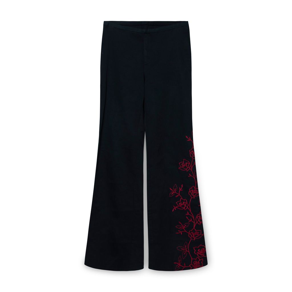Betsey Johnson Black Rose Flare Pants features red rose embroidery on left leg and snap button closure.