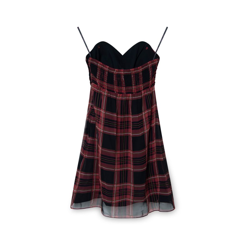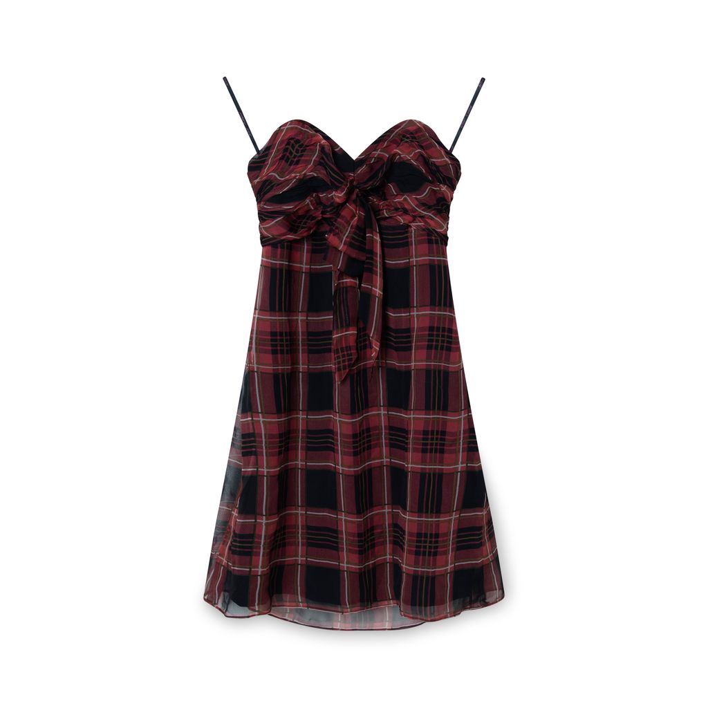 Betsey Johnson Plaid Strapless Mini Dress features sweetheart neckline, hidden back zipper, bow on front, and smocked back.