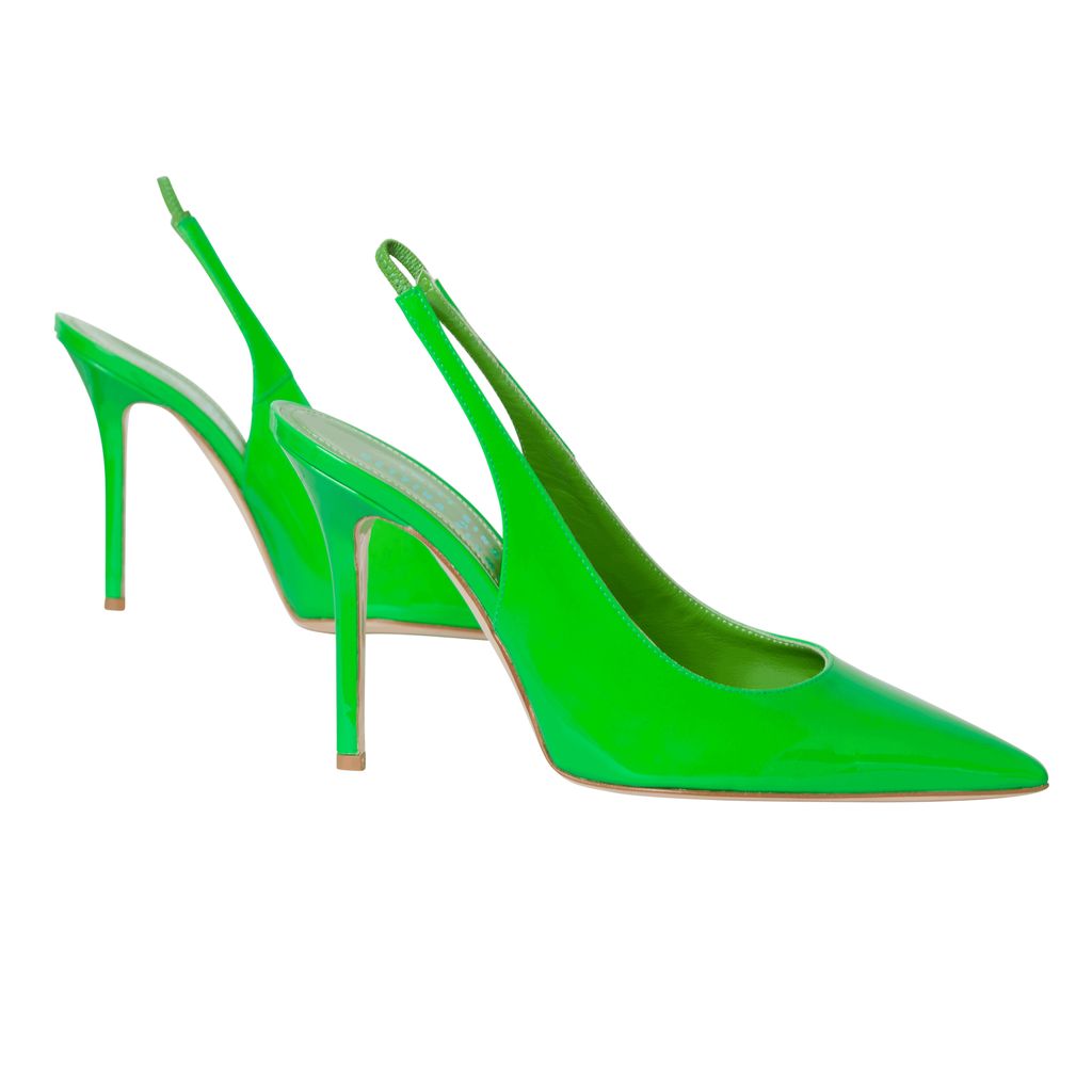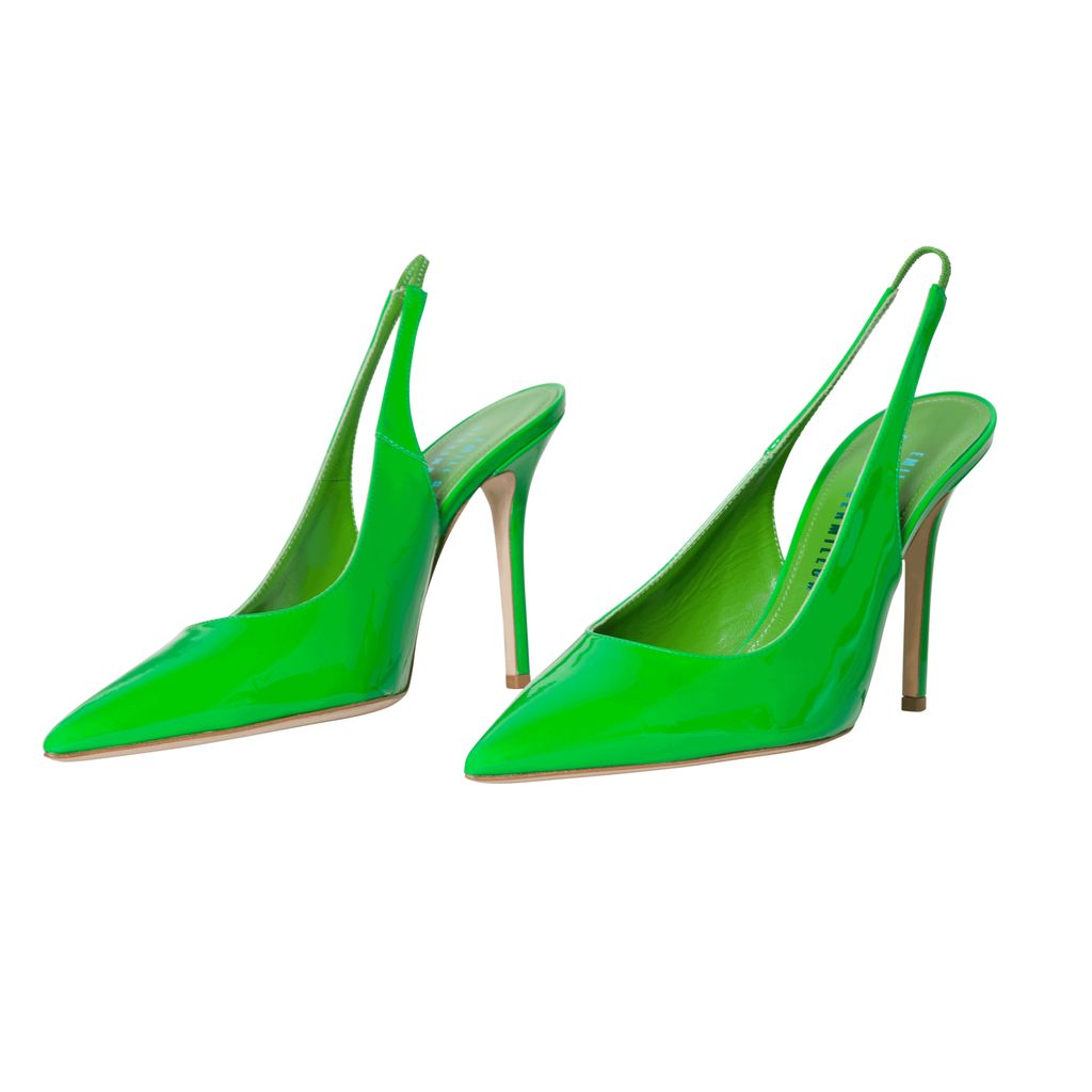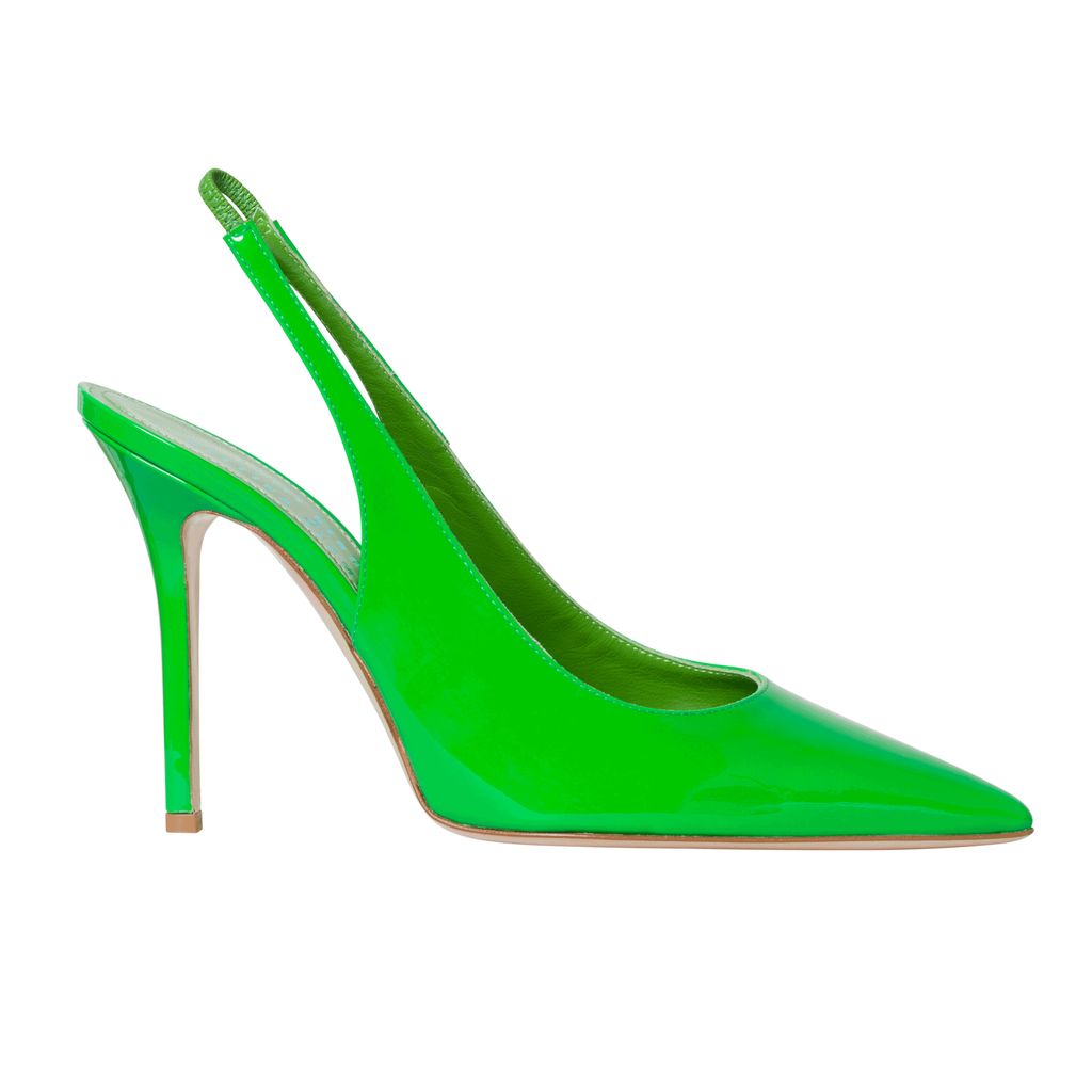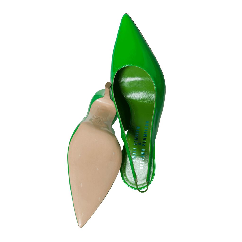 Pump in patent kid goatskin, elastic back strap in tone-on-tone goatskin tone, resin heel covered with tone on tone goatskin, and lining in tone on tone smooth goatskin.