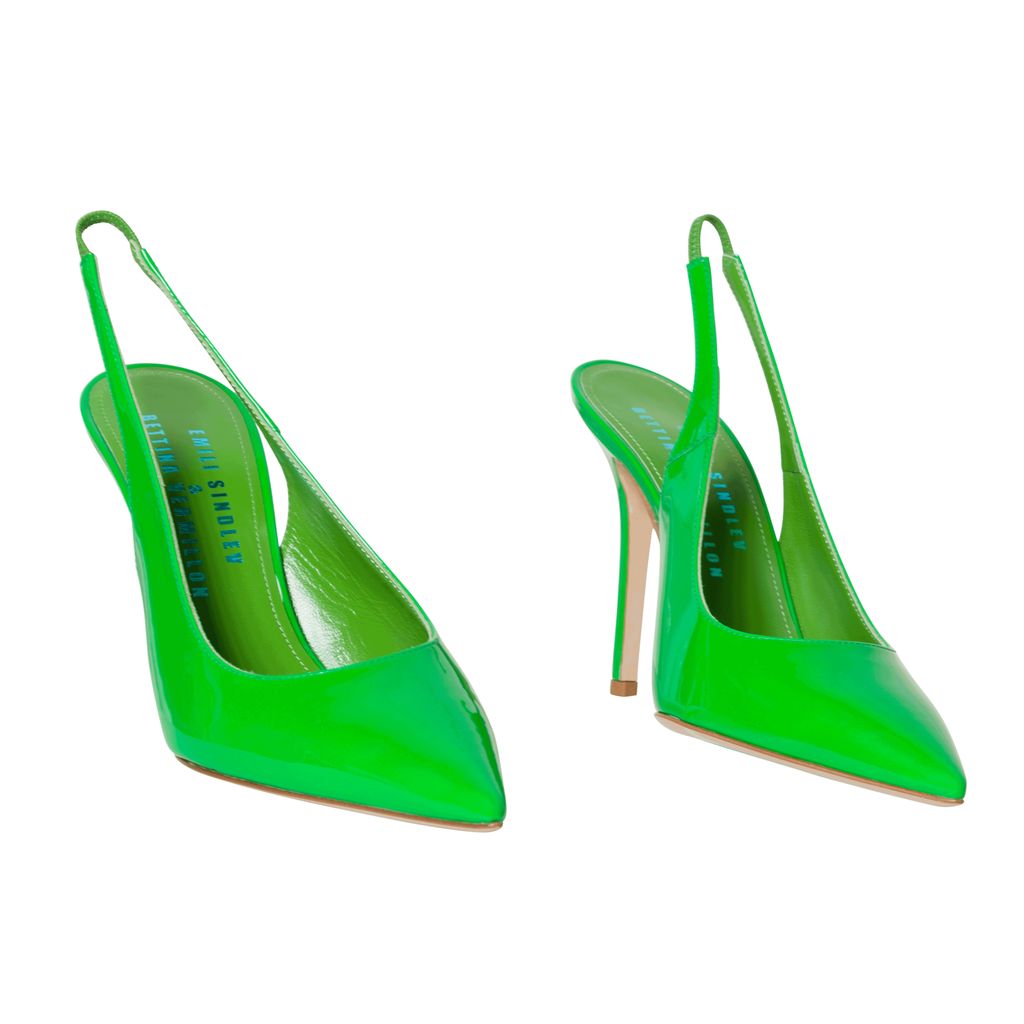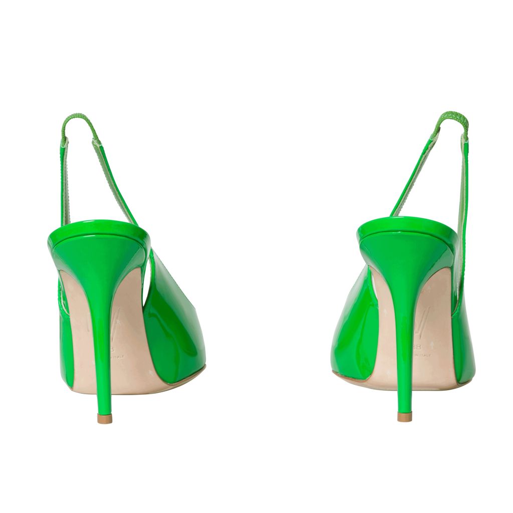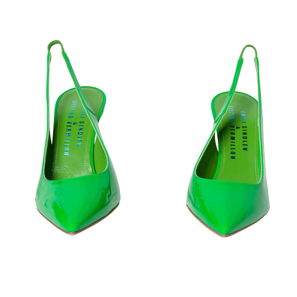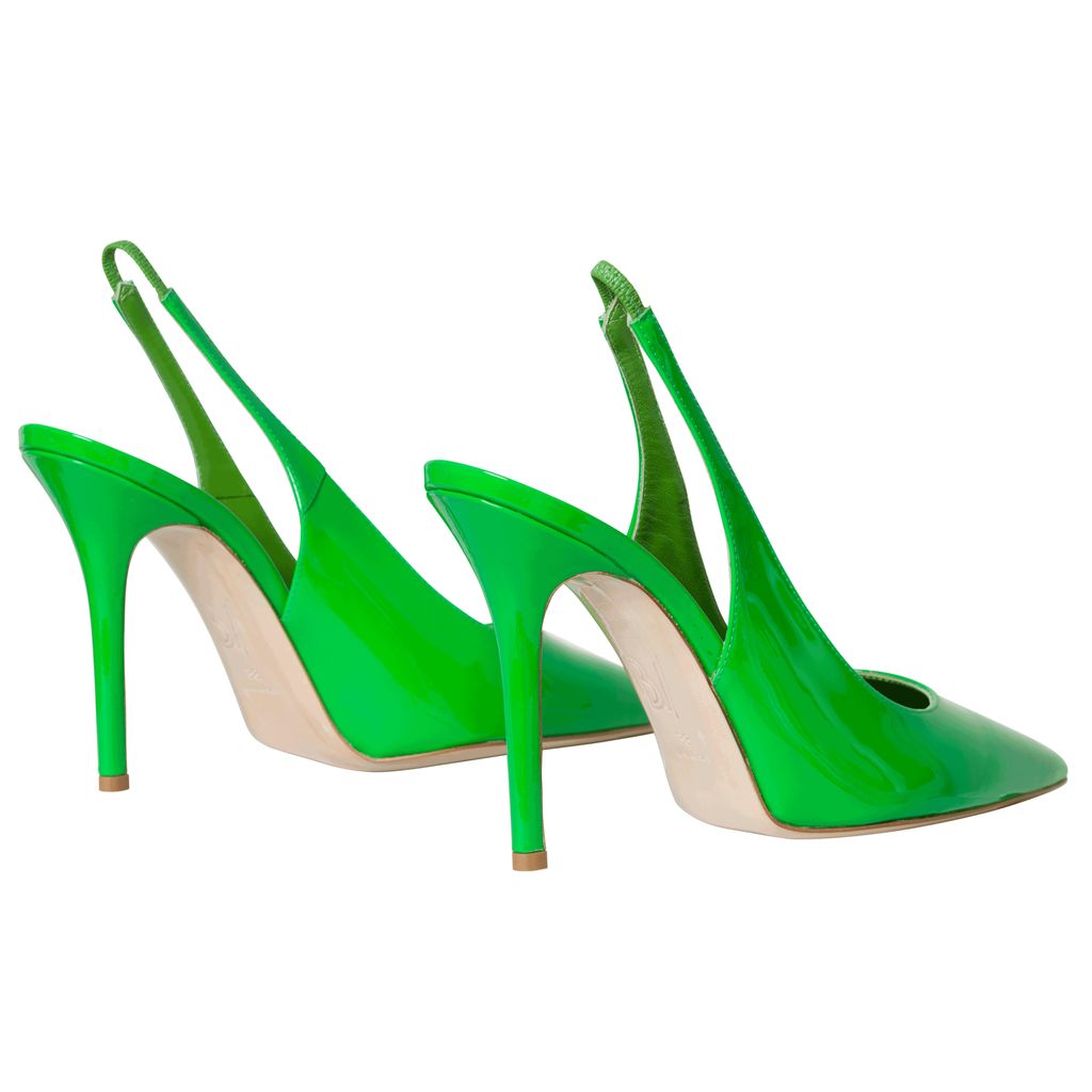 Pump in patent kid goatskin, elastic back strap in tone-on-tone goatskin tone, resin heel covered with tone on tone goatskin, and lining in tone on tone smooth goatskin.