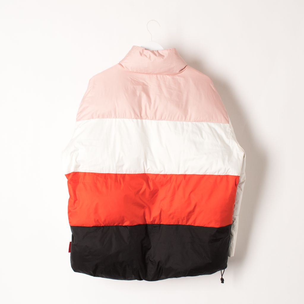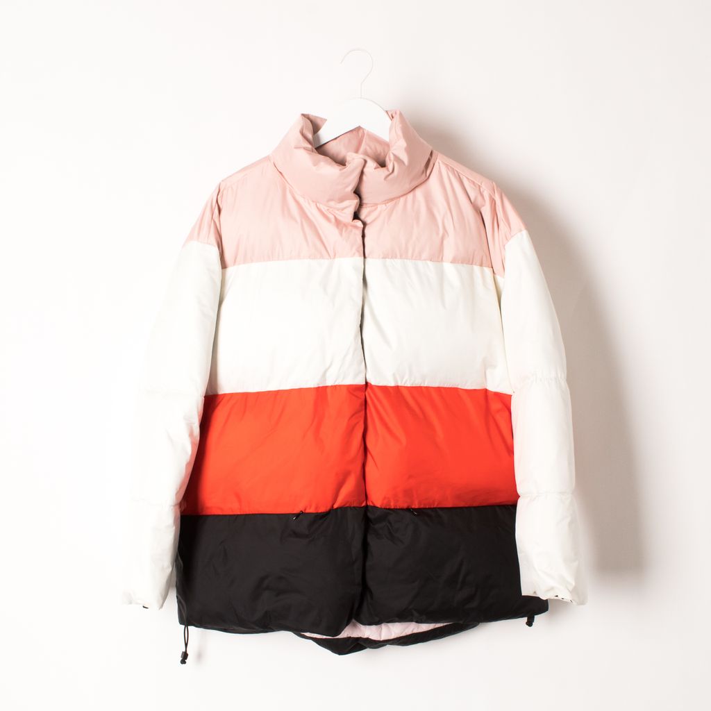 Colorblock Biannual Puffer Jacket. Invisible pocket zips and adjustable elastic drawstring at hem of jacket.