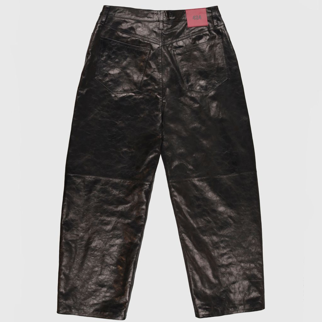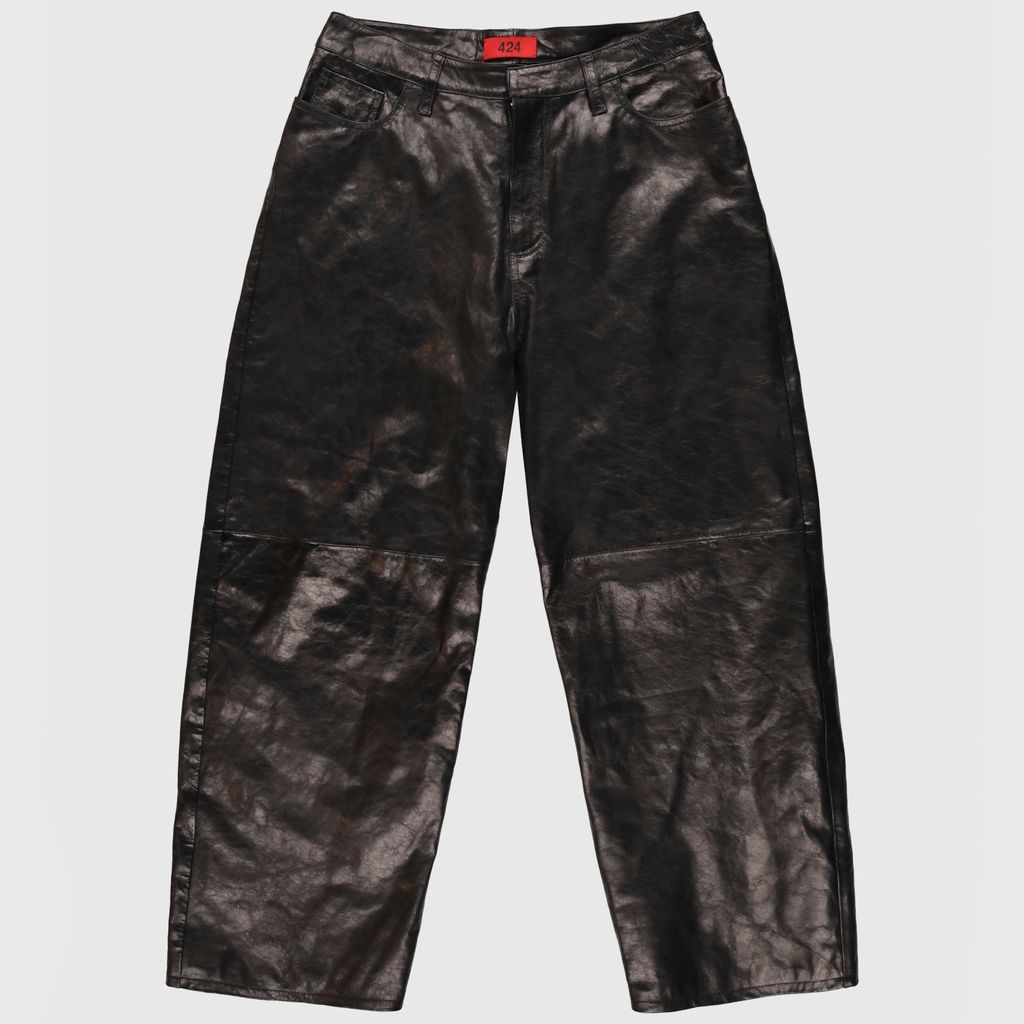 424 Big Daddy Paper Leather Pant features paper effect treatment, 424 embossed hardware, 5 pocket detail, button/zip fly closure, wide leg fit, and lambskin leather.