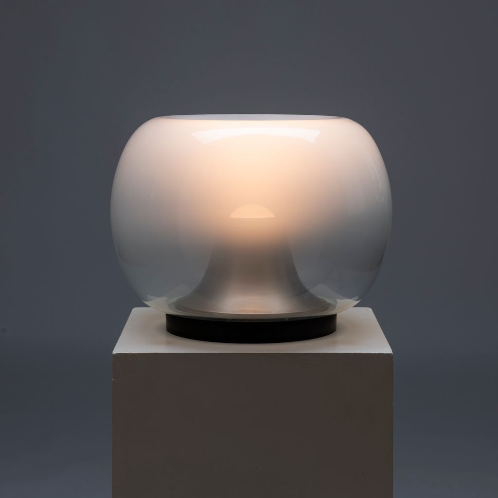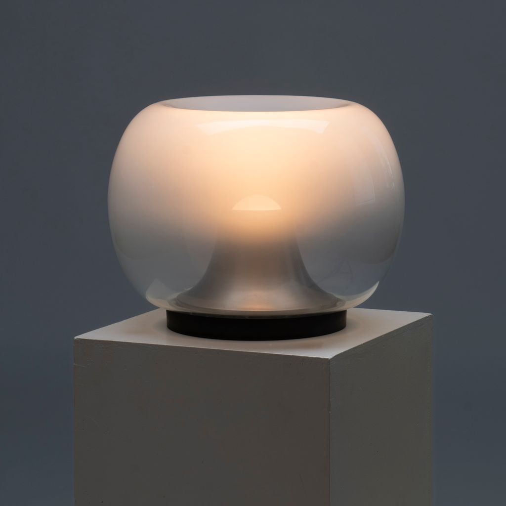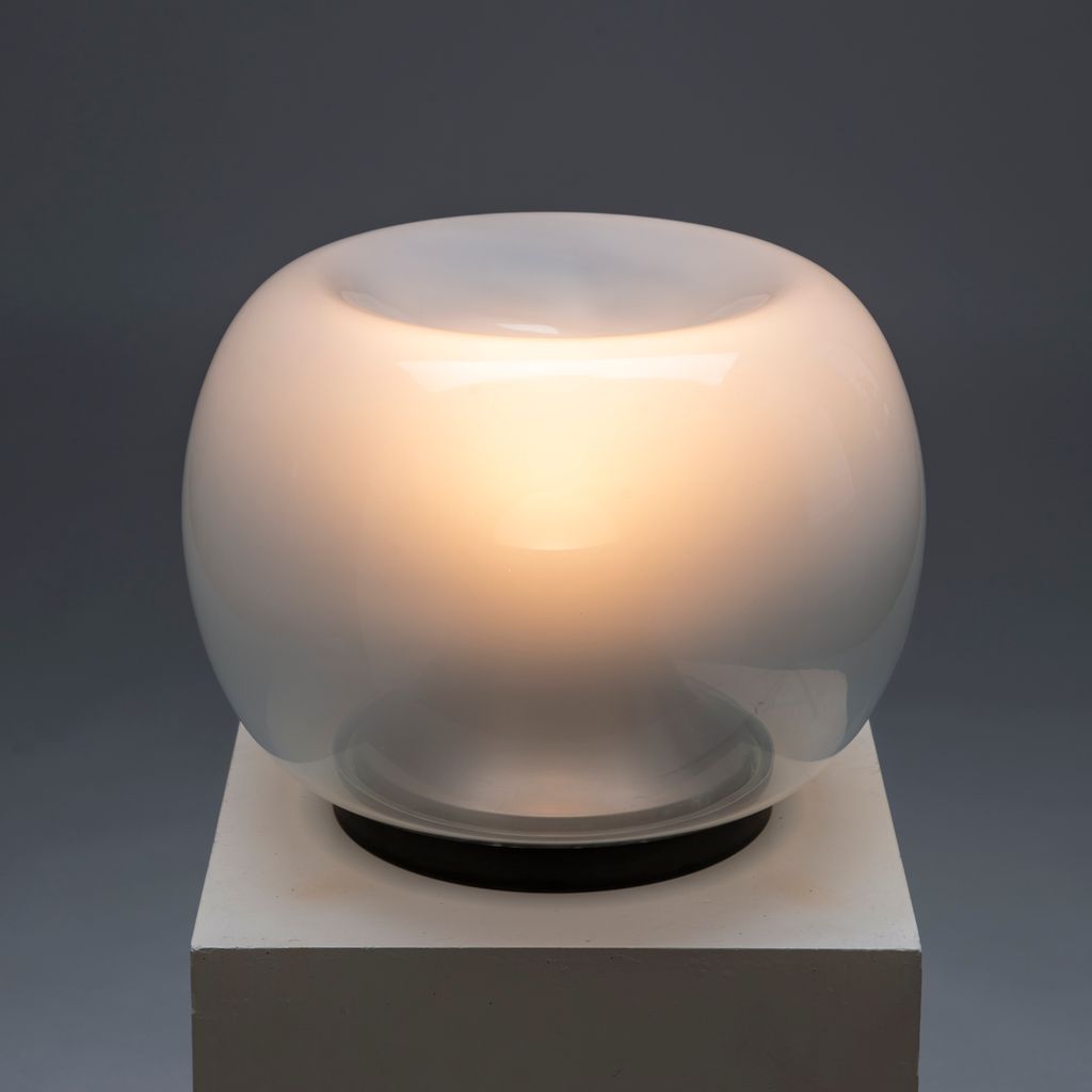60s table lamp in white tainted Murano glass with concave recess. In the style of Eleonore Peduzzi Riva