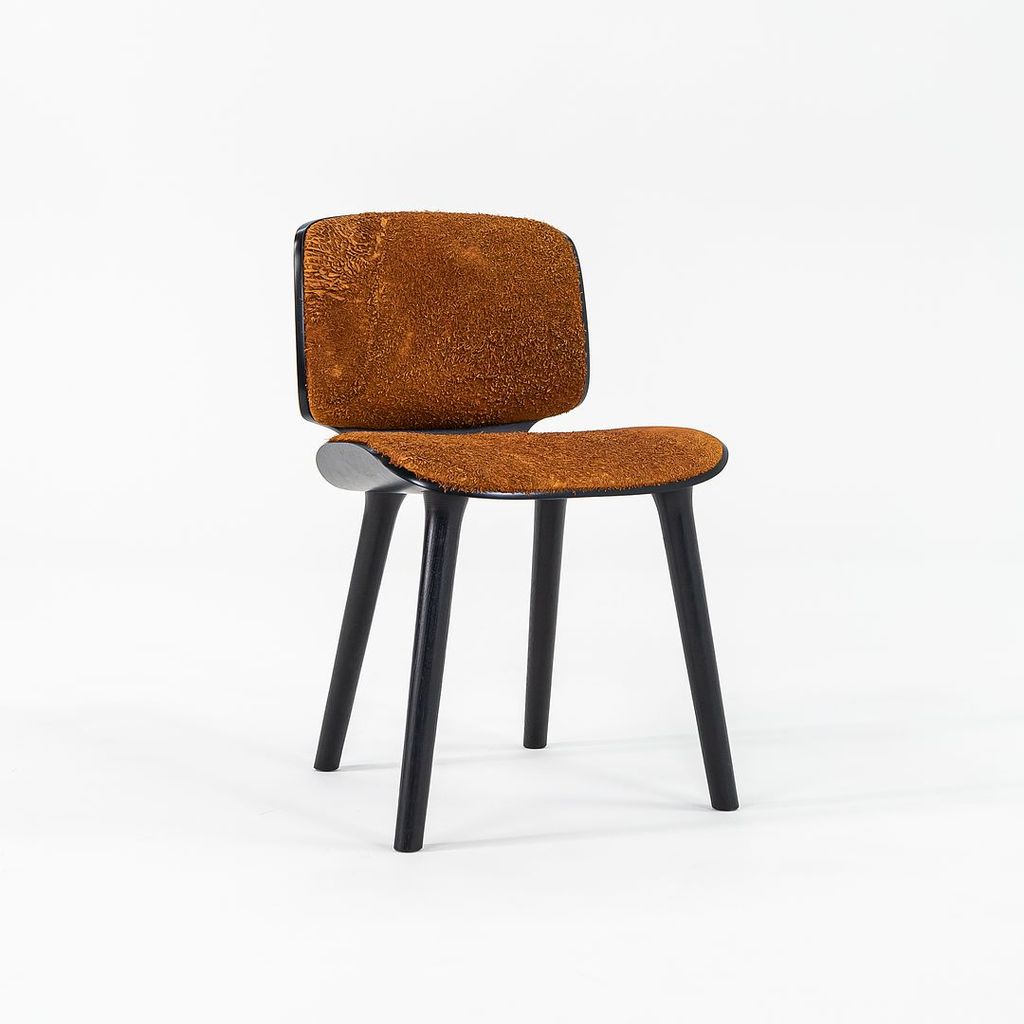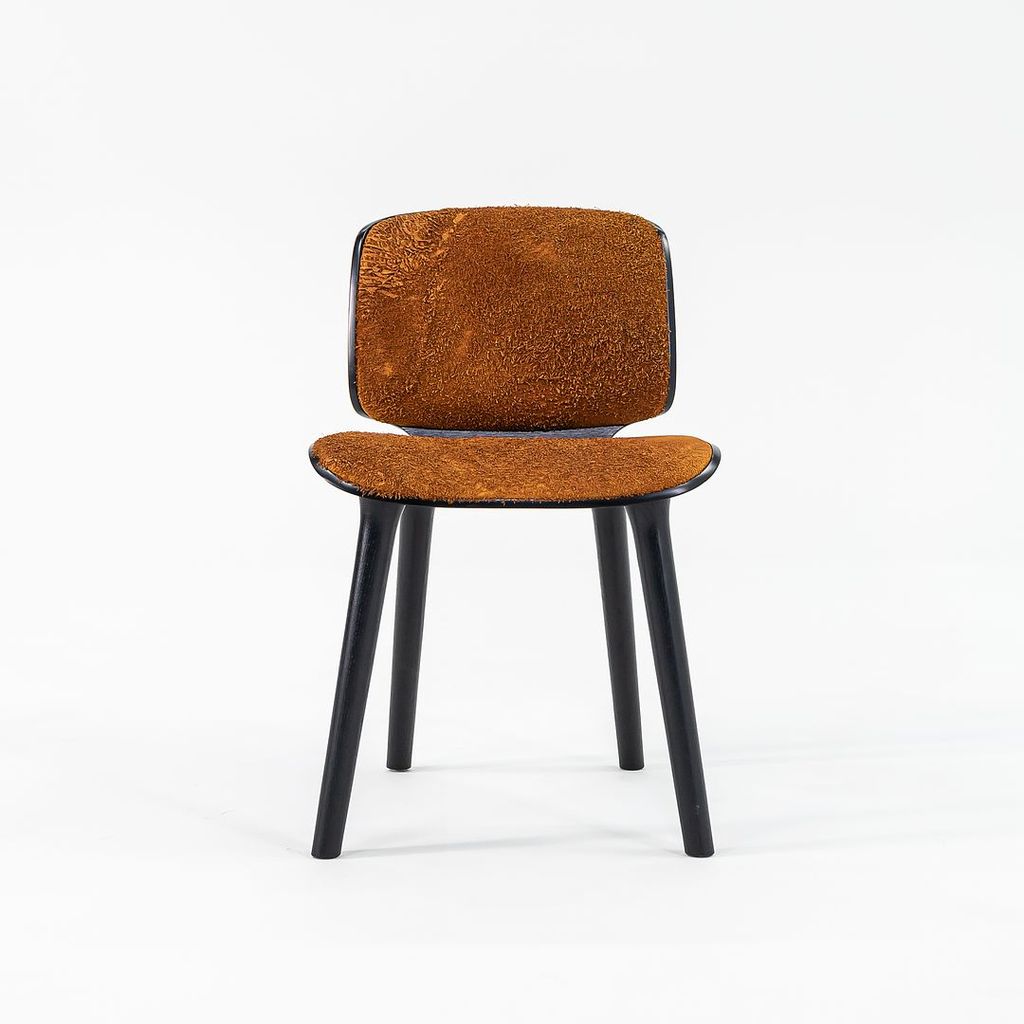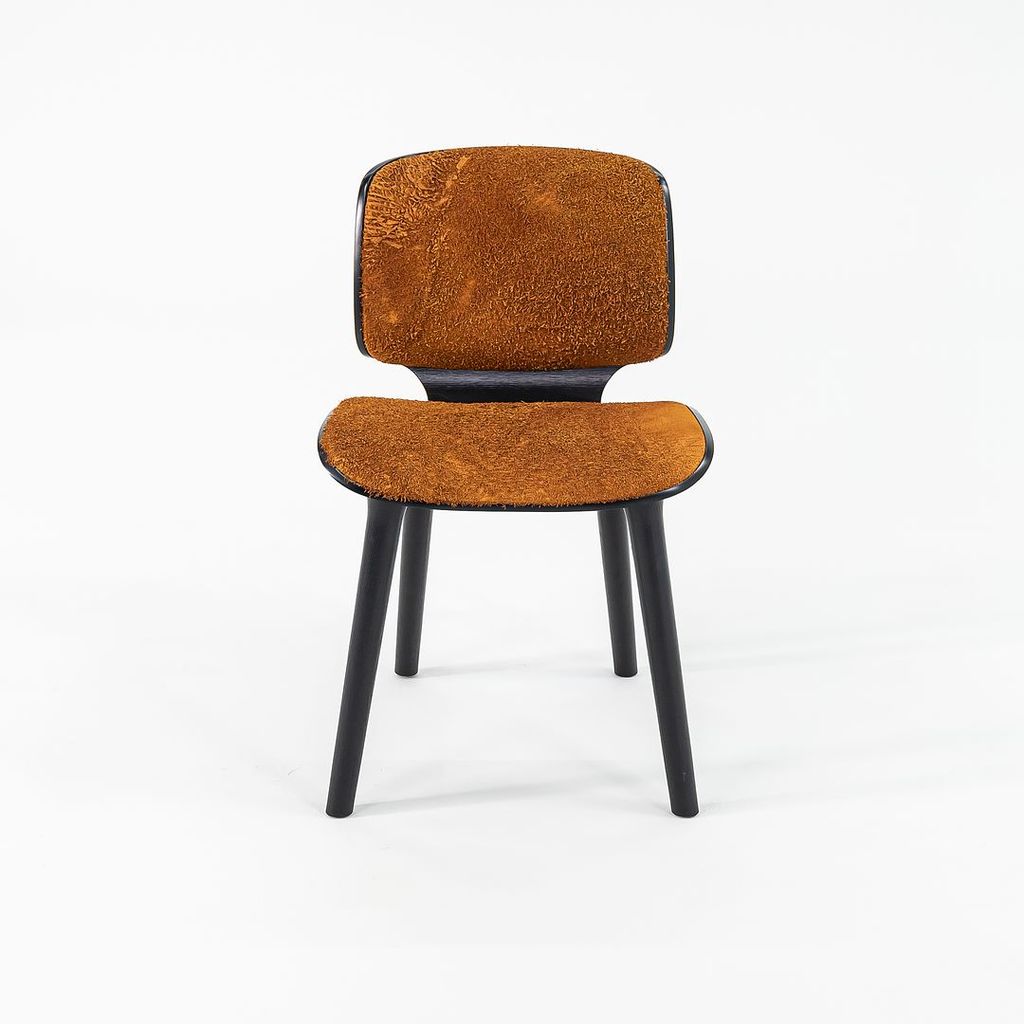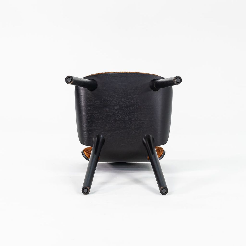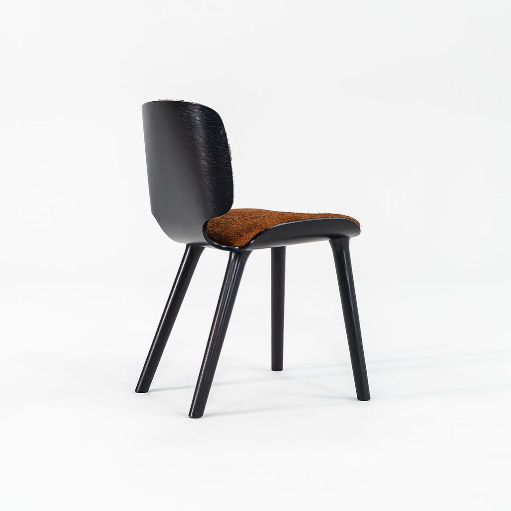 Listed for sale is a Nut Dining Chair made with a black oak frame and cognac / orange colored fabric. The chair was designed by Marcel Wanders and produced by Moooi in the Netherlands. It dates to circa 2022 and is guaranteed as authentic. Condition is very good with some wear to the left side of the seat pad. See photos.