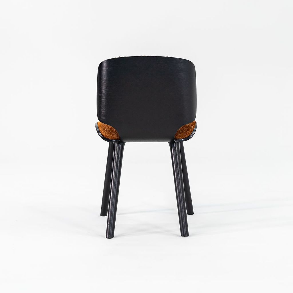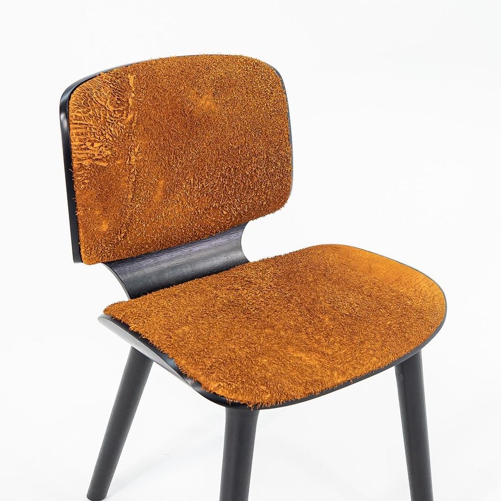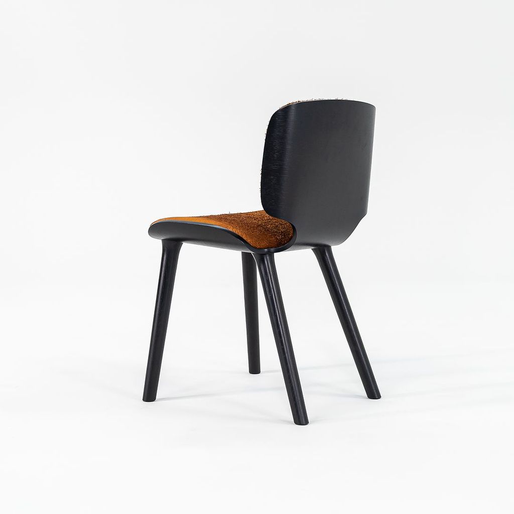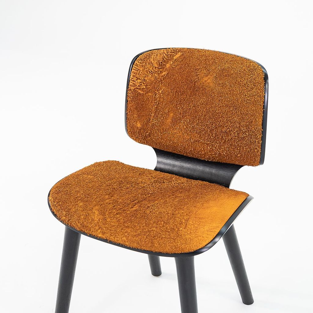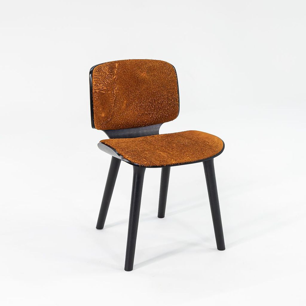 Listed for sale is a Nut Dining Chair made with a black oak frame and cognac / orange colored fabric. The chair was designed by Marcel Wanders and produced by Moooi in the Netherlands. It dates to circa 2022 and is guaranteed as authentic. Condition is very good with some wear to the left side of the seat pad. See photos.