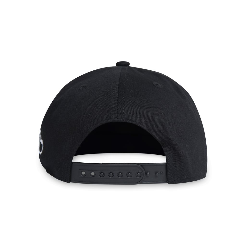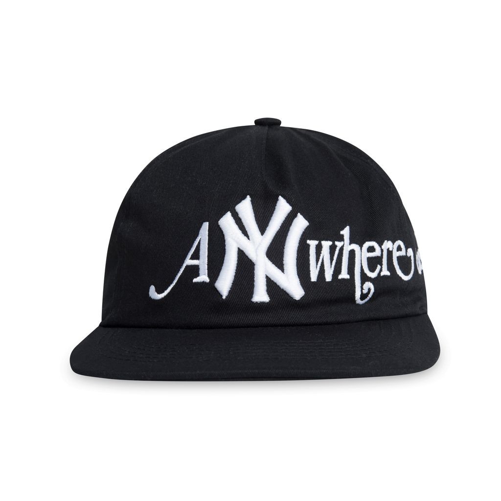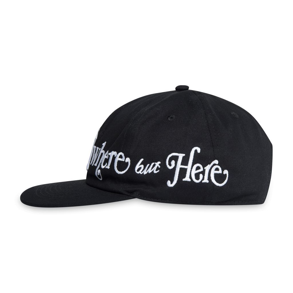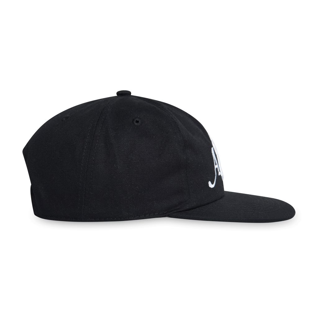 Black Anywhere 5 Panel Cap is mid profile unstructured flat bill cap featuring embroidered text and a snap closure. Made in LA.