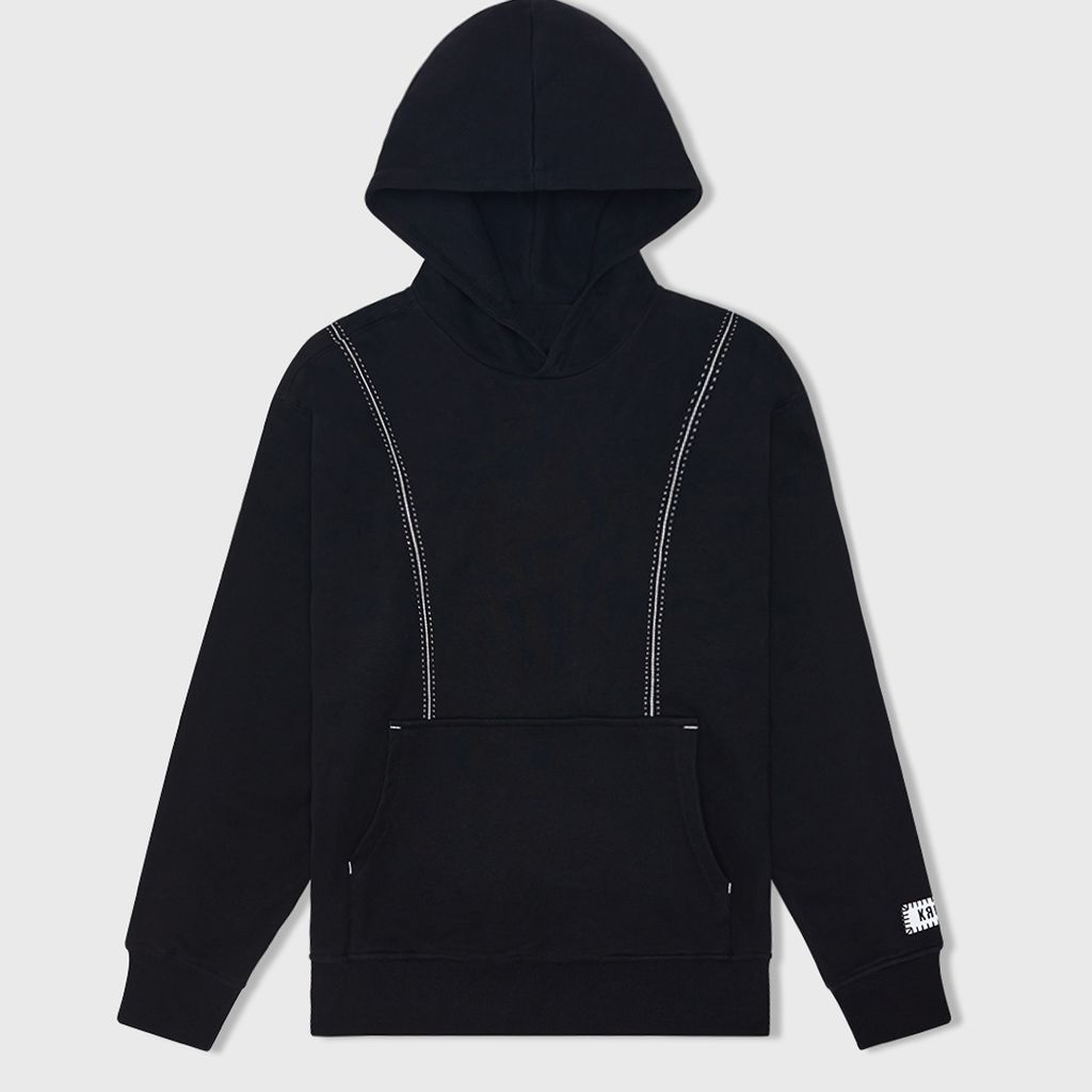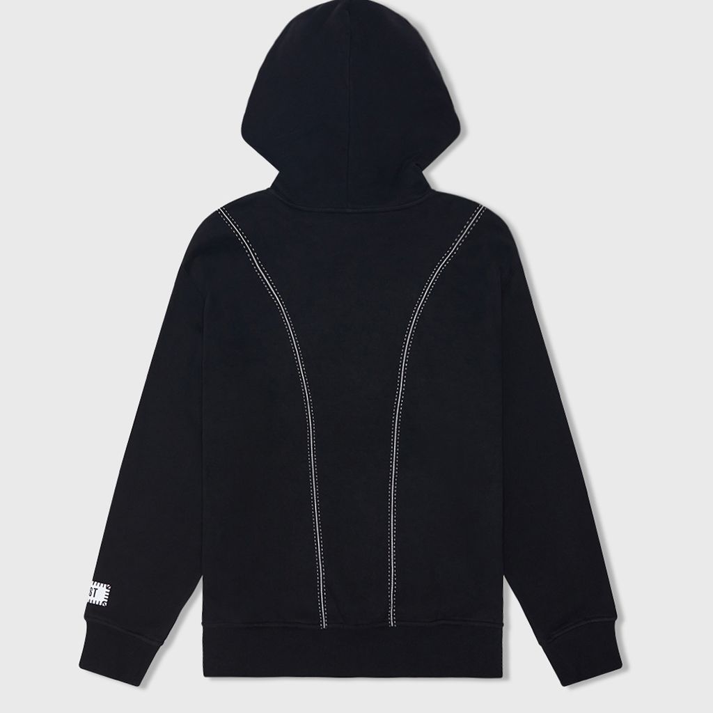 This stylish black hoodie features baseball inspired white stitching going down the front and back. One large pocket is located at the waist.