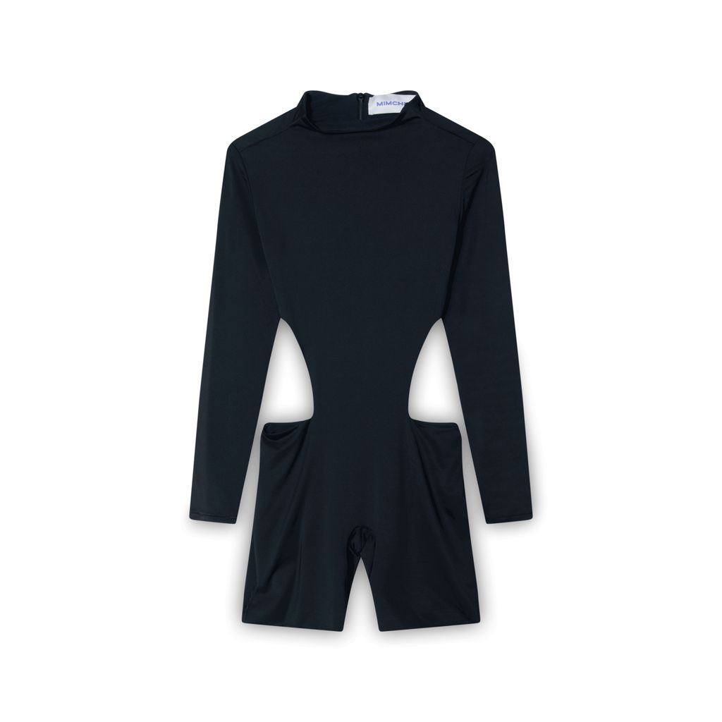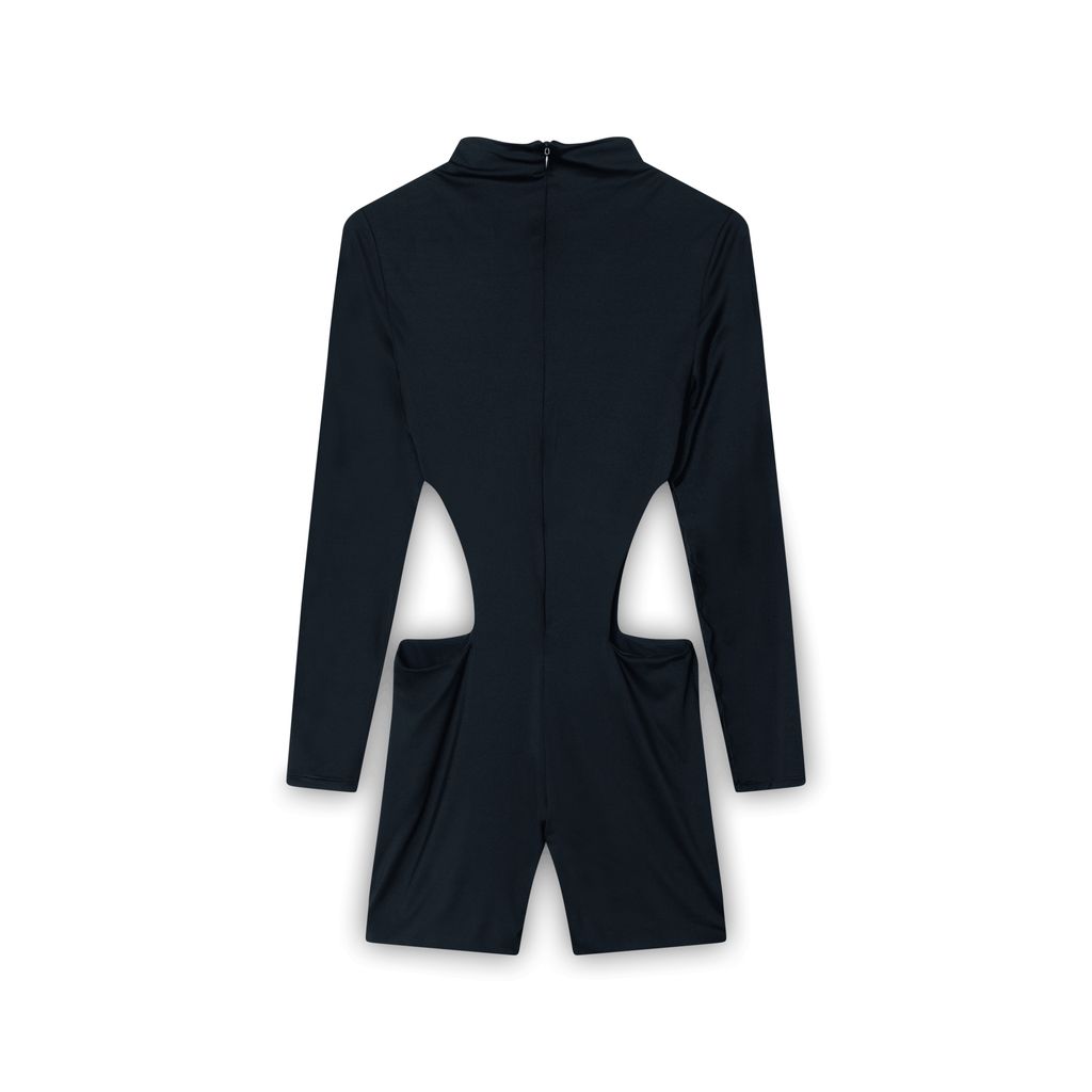 Birthday suit 2.0 – this bodysuit has long sleeves and mid-thigh shorts with an invisible zipper down center back. It features a mock-neck and cutouts at the sides for added drama. This bodysuit is lined in powermesh for smoothing and keeping everything in place. Wear it alone or pair with our Twist Pants.