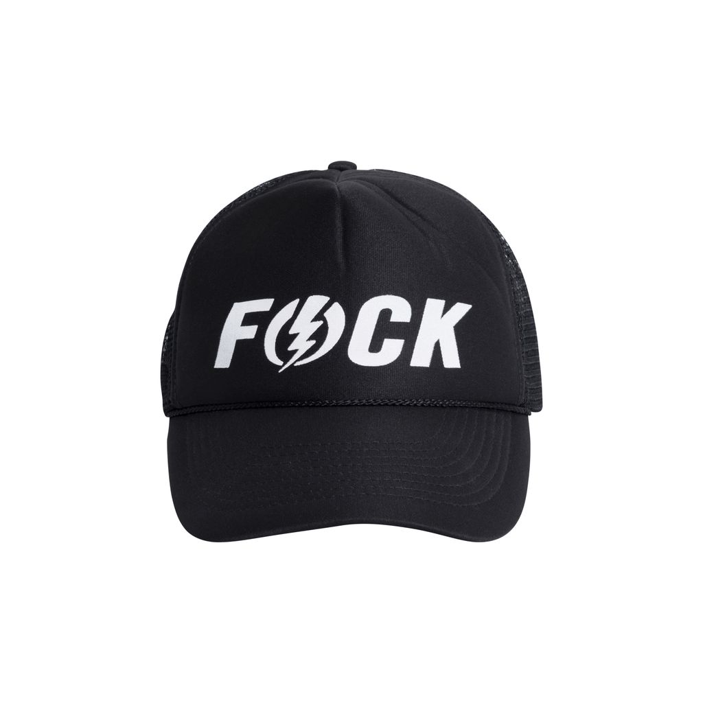 Black cap with thick brim and adjustable mesh back. White "F*CK" text with a lightning bolt is printed in the center.
