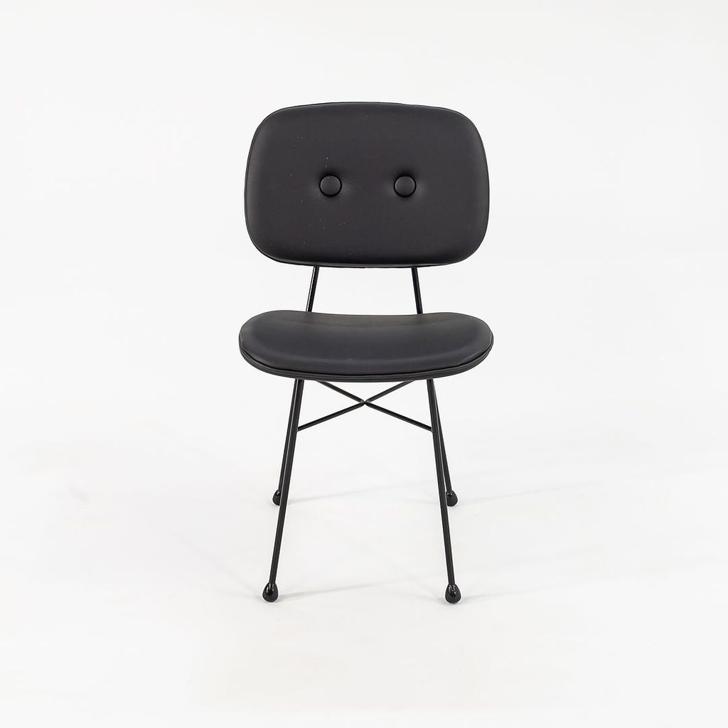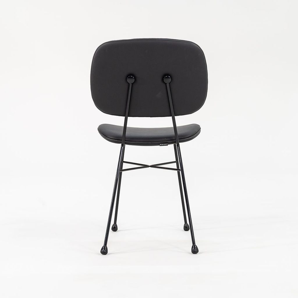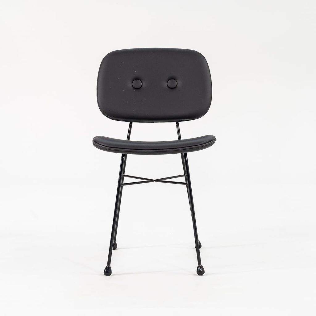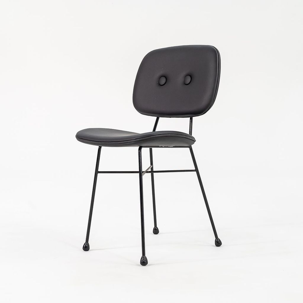 Listed for sale is a Golden Dining Chair made with a black steel frame and black leather upholstery. The chair was designed by Nika Zupanc and produced by Moooi in the Netherlands. It dates to circa 2022 and is guaranteed as authentic. Condition is very good to excellent. It has some small white spots on the upholstery that we should can try to remove prior to shipping. See photos.