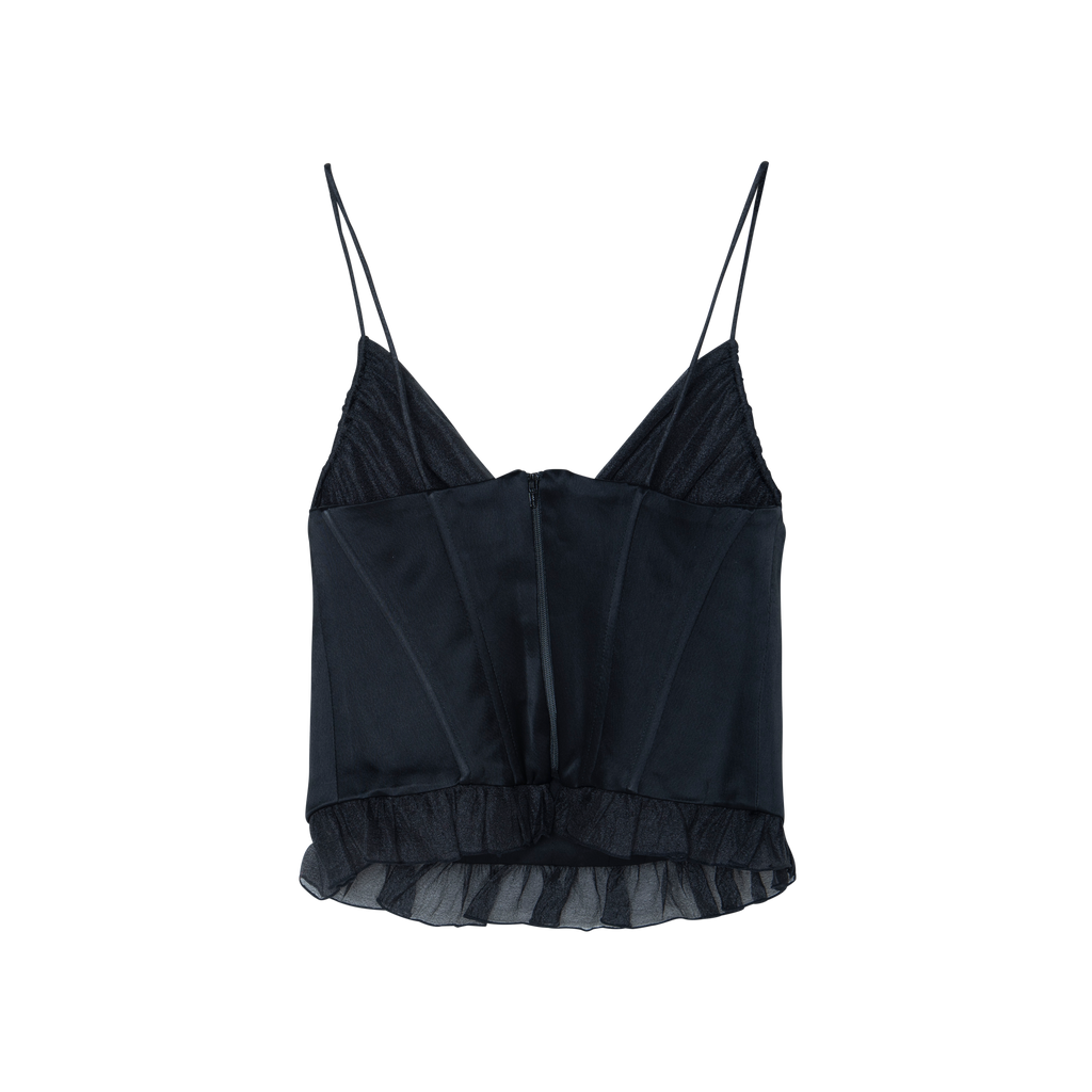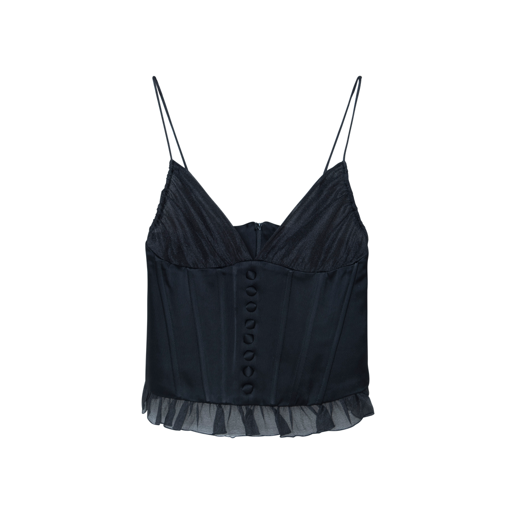 Isabel Corset - Black features corset bustier top, center-front button up top, bottom frills, and center-back zip.
