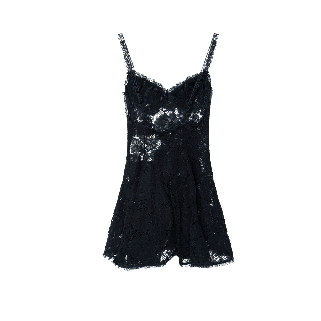 Black Lace Mini Dress features thin straps and sheer black lace fabric.