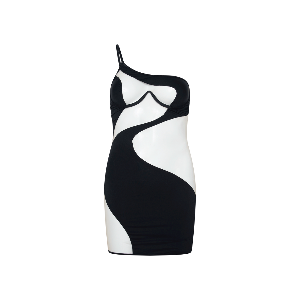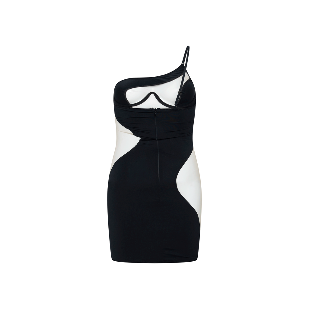 Black Mesh Cutout Minidress features underwire support, single adjustable strap, back zip closure, nude mesh cutouts, and mini length.