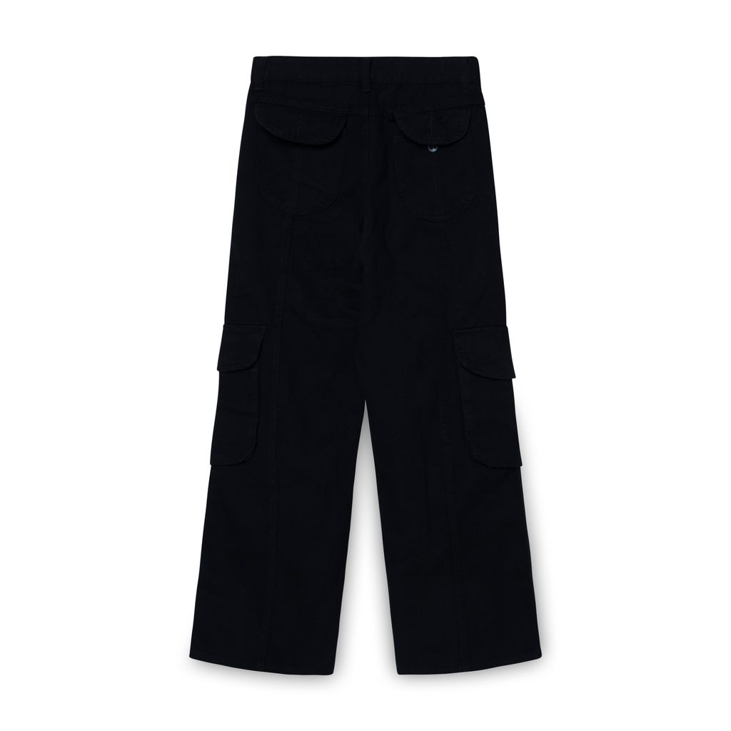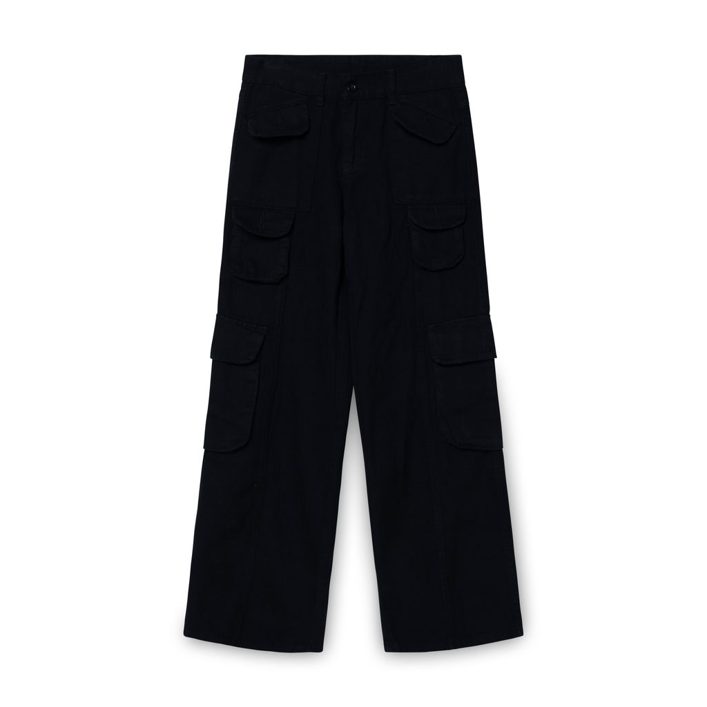 Black Straight Leg Cargo Pants features 8 pockets with flaps and zip fly.
