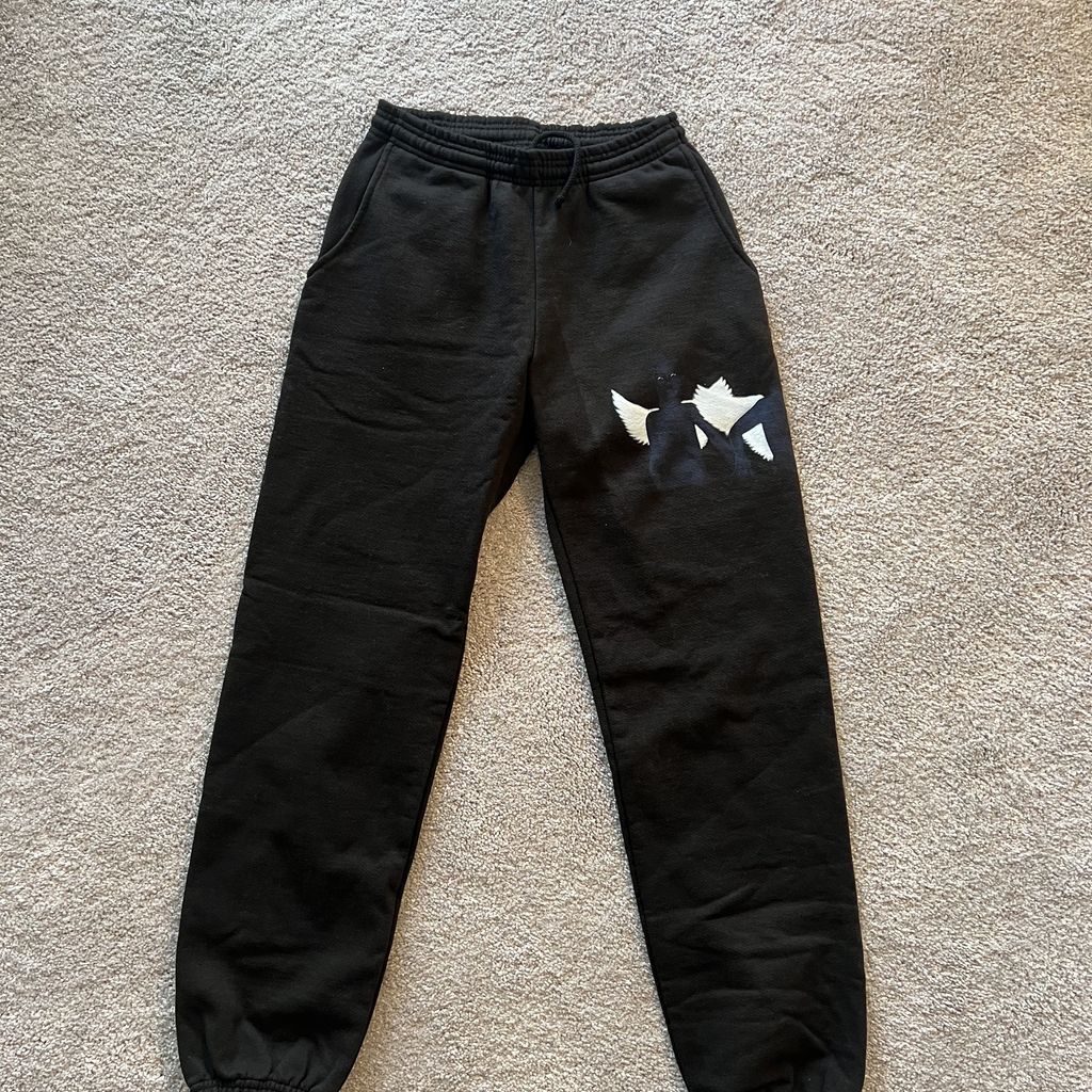 Black Sweats features elasticated waistband and ankle cuffs, drawstring at waistband, jogger style, 2 pockets, and art on left leg.