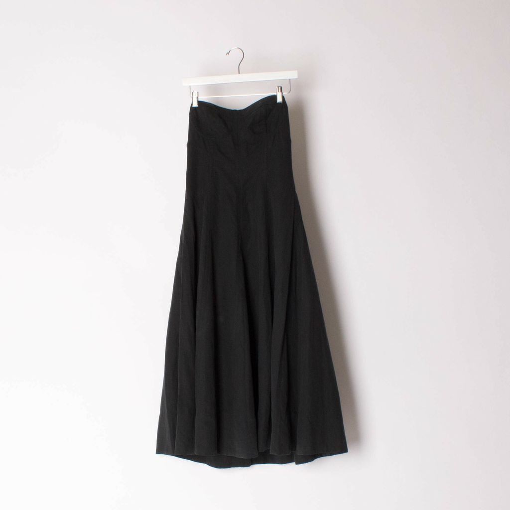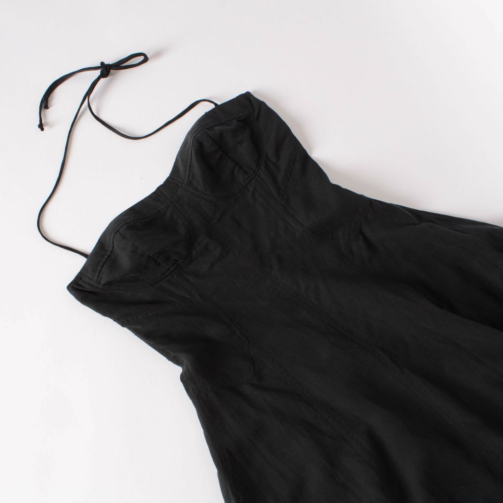Black Ulla Johnson halter corset midi dress with a brass colored back zip closure and a sweetheart neckline. Linen/cotton blend. Size 6.