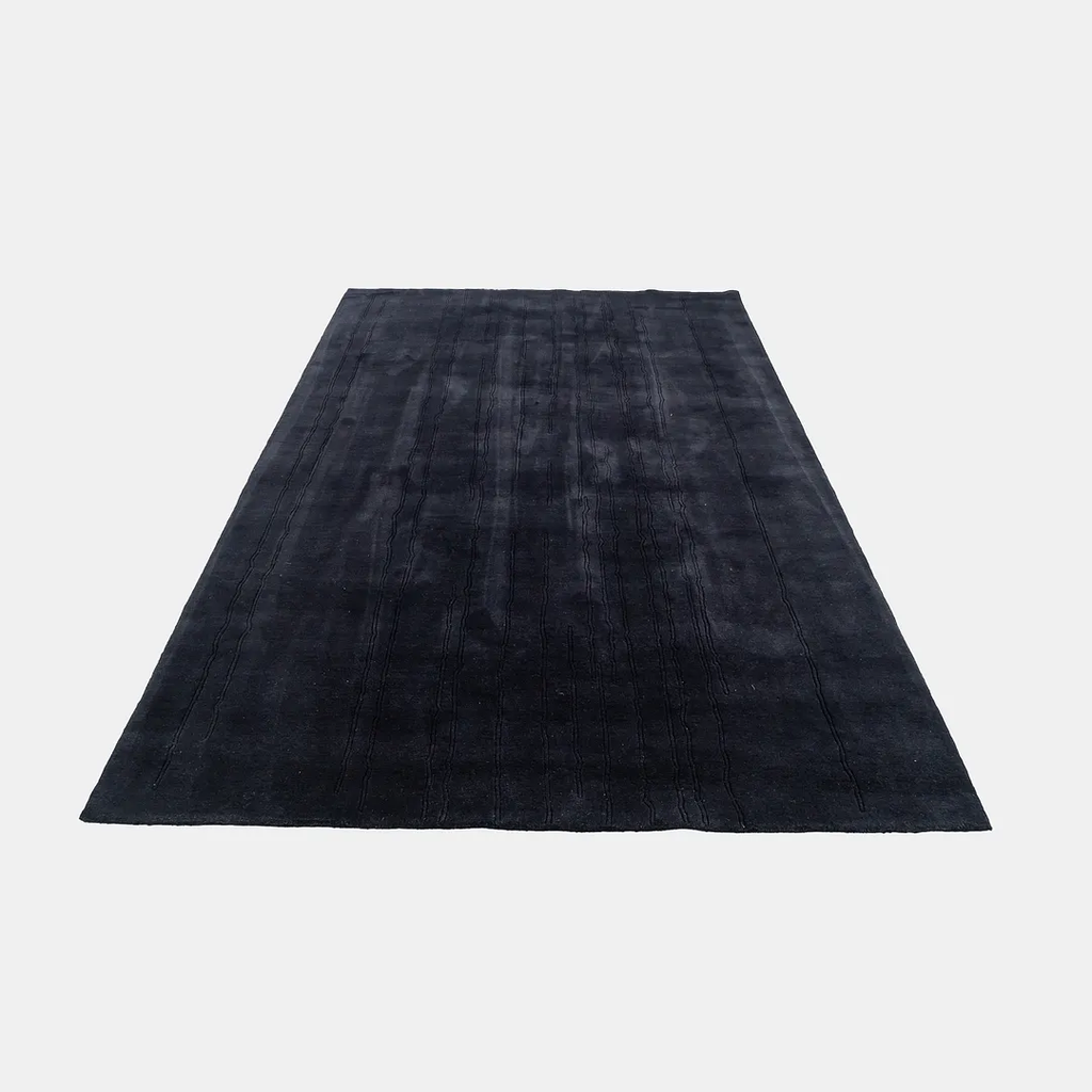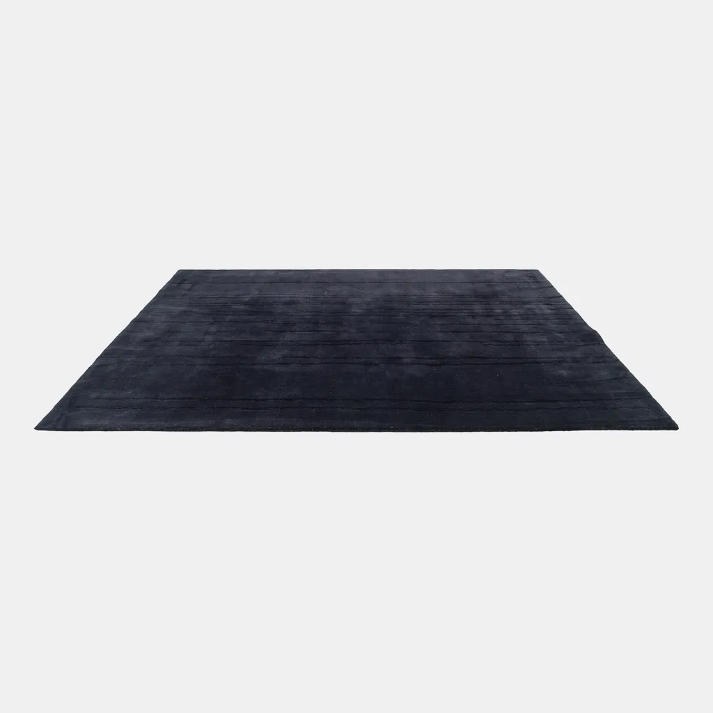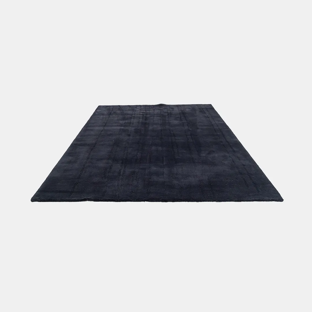 This is a Woodlines area rug, designed by Naja Utzom Popov and produced by Carl Hansen in Denmark. The piece is made of hand-knotted woolen yarn in black, and the design has grey lines. The rug dates to circa 2021 and is guaranteed as authentic. The condition is very good with light wear from use, please see photos. This came directly from Carl Hansen and was seemingly used as a showroom display model or floor model.